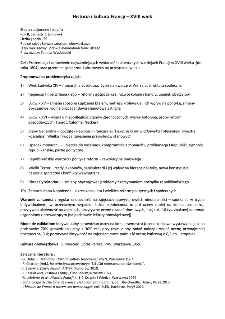 Historia i kultura Francji – XVIII wiek Studia stacjonarne I stopnia Rok II, Semestr 1 (zimowy) Liczba godzin : 30 Rodzaj zajęć : konwersatorium, obowiązkowe Język wykładowy : polski z elementami francuskiego Prowadzący: Tomasz Wysłobocki Cel : Prezentacja i omówienie najważniejszych wydarzeń historycznych w dziejach Francji w XVIII wieku (do roku 1804) oraz przemian społeczno-kulturowych na przestrzeni wieku Proponowana problematyka zajęć : 1) Wiek Ludwika XIV – monarchia absolutna, życie na dworze w Wersalu, struktura społeczna 2) Regencja Filipa Orleańskiego – reformy gospodarcze, rozwój kolonii i handlu, upadek obyczajów 3) Ludwik XV – zmiana sposobu rządzenia krajem, metresy królewskie i ich wpływ na politykę, zmiany obyczajowe, wojna propagandowa i handlowa z Anglią 4) Ludwik XVI – wojna o niepodległość Stanów Zjednoczonych, Maria-Antonina, próby reform gospodarczych (Turgot, Calonne, Necker) 5) Stany Generalne – początek Rewolucji Francuskiej (Deklaracja praw człowieka i obywatela, kwestia kościelna), Wielka Trwoga, zniesienie przywilejów stanowych 6) Upadek monarchii – ucieczka do Varennes, kompromitacja monarchii, proklamacja I Republiki, symbole republikańskie, partie polityczne 7) Republikańskie wartości i polityka reform – rewolucyjne innowacje 8) Wielki Terror – rządy jakobinów, sankiuloterii i jej wpływ na bieżącą politykę, nowa konstytucja, napięcia społeczne i konflikty wewnętrzne 9) Okres Dyrektoriatu - zmiany obyczajowe i problemy z utrzymaniem porządku republikańskiego 10) Zamach stanu Napoleona – okres konsulatu i wielkich reform politycznych i społecznych Warunki zaliczenia : regularna obecność na zajęciach (powyżej dwóch nieobecności – spotkania w trybie indywidualnym; w przeciwnym wypadku każda nieobecność to pół oceny mniej na koniec semestru), pozytywna aktywność na zajęciach, pozytywne oceny z zadań domowych, esej (ok. 16 tys. znaków) na temat uzgodniony z prowadzącym (na podstawie lektury obowiązkowej). Mode de validation: indywidualny sprawdzian ustny na koniec semestru (ocena końcowa wystawiana jest na podstawie: 70% sprawdzian ustny + 30% esej przy czym z oby zadań należy uzyskać ocenę przynajmniej dostateczną, 3.0; pozytywna aktywność na zajęciach może podnieść ocenę końcową o 0,5 do 1 stopnia). Lektura obowiązkowa : S. Mercier, Obraz Paryża, PIW, Warszawa 1959. Zalecana literatura : - G. Duby, R. Mandrou, Historia kultury francuskiej, PWN, Warszawa 1967. - R. Chartier (red.), Historia życia prywatnego, T.3 „Od renesansu do oświecenia”. - J. Bainville, Dzieje Francji, ANTYK, Komorów 2010. - J. Baszkiewicz, Historia Francji, Ossolineum,Wrocław 1974 - G. Lefebvre et al., Historia Francji, t. 1-2, Książka i Wiedza, Warszawa 1969 - Chronologie de l’histoire de France. Des origines à nos jours, coll. Bescherelle, Hatier, Paryż 2015 - L'histoire de France à travers ses personnages, coll. BLED, Hachette, Paryż 2016