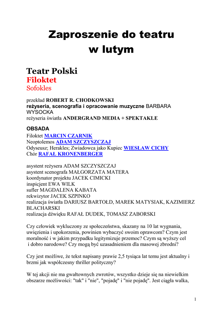 Zaproszenie do teatru w lutym Teatr Polski Filoktet Sofokles przekład ROBERT R. CHODKOWSKI reżyseria, scenografia i opracowanie muzyczne BARBARA WYSOCKA reżyseria światła ANDERGRAND MEDIA + SPEKTAKLE OBSADA Filoktet MARCIN CZARNIK Neoptolemos ADAM SZCZYSZCZAJ Odyseusz; Herakles; Zwiadowca jako Kupiec WIESŁAW CICHY Chór RAFAŁ KRONENBERGER asystent reżysera ADAM SZCZYSZCZAJ asystent scenografa MAŁGORZATA MATERA koordynator projektu JACEK CIMICKI inspicjent EWA WILK sufler MAGDALENA KABATA rekwizytor JACEK SZPINKO realizacja światła DARIUSZ BARTOŁD, MAREK MATYSIAK, KAZIMIERZ BLACHARSKI realizacja dźwięku RAFAŁ DUDEK, TOMASZ ZABORSKI Czy człowiek wykluczony ze społeczeństwa, skazany na 10 lat wygnania, uwięzienia i upokorzenia, powinien wybaczyć swoim oprawcom? Czym jest moralność i w jakim przypadku legitymizuje przemoc? Czym są wyższy cel i dobro narodowe? Czy mogą być uzasadnieniem dla masowej zbrodni? Czy jest możliwe, że tekst napisany prawie 2,5 tysiąca lat temu jest aktualny i brzmi jak współczesny thriller polityczny? W tej akcji nie ma gwałtownych zwrotów, wszystko dzieje się na niewielkim obszarze możliwości: "tak" i "nie", "pojadę" i "nie pojadę". Jest ciągła walka, 1 ciągła gra, zakładanie kolejnych masek. Wszystko po to, aby umożliwić dokonanie masakry. Wydarzenia, które obserwujemy, to tylko prolog do zagłady. Czterech aktorów, pusta przestrzeń, dźwięki gitary basowej i wiele pytań. Mit Filokteta Filoktet był królem Tesalii, synem Pojasa, sławnym łucznikiem, właścicielem łuku Heraklesa ze strzałami zatrutymi krwią Hydry lerneńskiej. Dostał go od herosa za podpalenie jego stosu pogrzebowego. Opowieść o Filoktecie jest częścią mitu wojny trojańskiej. Jej bezpośrednią przyczyną stało się porwanie przez Parysa, księcia trojańskiego, syna Priama, Heleny, najpiękniejszej kobiety, córki Zeusa. Helena była żoną Menelaosa, brata Agamemnona, który stanął na czele wojsk Greków szykujących się do wojny z Trojanami. W czasie wyprawy flota Greków zatrzymała się na wyspie Chryse, gdzie podczas uczty ofiarnej Filoktet został ugryziony w stopę przez węża wodnego. Rana się nie goiła, a raczej jątrzyła, wydzielając trudny do zniesienia smród, i wywoływała gwałtowne napady bólu. Krzyki Filokteta i odstręczający zapach rany utrudniały towarzyszom wyprawy udział w religijnych obrzędach, postanowili więc pozbyć się łucznika. Porzucili go podczas następnego postoju na bezludnej wyspie Lemnos, zostawiając mu jego łuk. Wojna trojańska toczyła się już dziewiąty rok. Odyseuszowi udało się porwać młodszego syna Priama – Helenosa, brata bliźniaka Kasandry i tak jak ona obdarzonego darem wieszczenia. Ujawnił on, że Troja nie zostanie zdobyta, dopóki nie przybędą Filoktet ze swoim łukiem i Neoptolemos – młodociany syn Achillesa. Po obu ruszyła wyprawa pod wodzą Odyseusza. Neoptelemosa wabiła przyszłą sławą i posiadaniem zbroi ojca. Filokteta namawiał Herakles. Los Troi został przesądzony. Prapremiera polska na Scenie na Świebodzkim 30 listopada 2012 Spektakle 26 i 27 lutego o 19.00, Scena na Świebodzkim Teatr Współczesny Rewizor. Według Bobczyńskiego scenariusz, reżyseria, scenografia, kostiumy: Agata Duda-Gracz muzyka: Jakub Ostaszewski choreografia: Tomasz Wesołowski 2 światło: Katarzyna Łuszczyk multimedia: Karol Rakowski asystent reżysera: Agata Schweiger dramaturg: Aneta Cardet inspicjent: Elżbieta Kozak Obsada: Rewizor – x x x Horodniczy - Krzysztof Kuliński Żona - Ewelina Paszke-Lowitzsch Córka - Katarzyna Z. Michalska Pani Chłopow - Irena Rybicka Ten Niemiec - Maciej Tomaszewski Liapkin-Tiapkin - Piotr Łukaszczyk (gościnnie) Ziemlianika - Krzysztof Boczkowski Szpiekin - Michał Szwed Dzierżymorda – Tomasz Wesołowski (gościnnie) Chinka – Wiktoria Pei (gościnnie) Dobczyński – Michał Dudziński Bobczyński – Tomasz Schimscheiner (gościnnie) premiera: 14 stycznia 2012, Duża Scena Po sukcesie przedstawienia „Według Agafii” na podstawie „Ożenku” Mikołaja Gogola, nagrodzonego łódzką nagrodą teatralną Złota Maska za reżyserię i scenografię, Agata Duda-Gracz ponownie sięga do twórczości tego pisarza. Wydaje się, że fabuła Gogolowskiego „Rewizora” jest polskiemu widzowi teatralnemu dobrze znana. Spektakl Agaty Dudy-Gracz, stworzony na podstawie jej autorskiego scenariusza opartego na kanwie tej rosyjskiej sztuki sprzed niemal 200 lat, zdaje się to komfortowe przekonanie burzyć. Nie zobaczymy w nim bowiem wyłącznie gorzko-rubasznej satyry na urzędniczy świat Rosji współczesnej Gogolowi. U Dudy-Gracz to raczej studium ludzkiej kondycji, granic jej elastyczności w ekstremalnych warunkach. To obraz człowieczego głodu samozadowolenia, jego tęsknoty za bytem doskonałym, nawet za cenę bycia przez chwilę kimś innym. To spektakl wykorzystujący zabieg teatru w teatrze; zabawa w pozory i symulację, w której symboliczna maska staje się nieodłącznym atrybutem scenicznych postaci. Niechaj i widz odważy się po jego obejrzeniu rąbek swej maski uchylić... Spektakle 22, 23 lutego o 19.15, Duża Scena 3 Teatr Lalek Jaś i Małgosia Jan Brzechwa Premiera: 7 maja 2011, godz. 15.00 Spektakl grany na scenie Teatru Piccolo Myślisz, że spektakle interaktywne to największe osiągnięcie nowoczesnego teatru? Dla Wrocławskiego Teatru Lalek interaktywność to za mało! Spektakl wpisuje się w nowoczesny nurt edukacyjny. Muzykę w przedstawieniu współtworzą dzieci. Mali widzowie „Jasia i Małgosi” nie tylko biorą aktywny udział w przedstawieniu, ale współtworzą jego „ścieżkę dźwiękową”, naśladując odgłosy leśnych zwierząt, zjawisk atmosferycznych i przyrodniczych oraz grając na instrumentach. Uwaga: Istnieje możliwość poszerzenia spektaklu o lekcje umuzykalniające, prowadzone przez studentów wrocławskiej Akademii Muzycznej. Pod opieką znakomitych dydaktyków dzieci