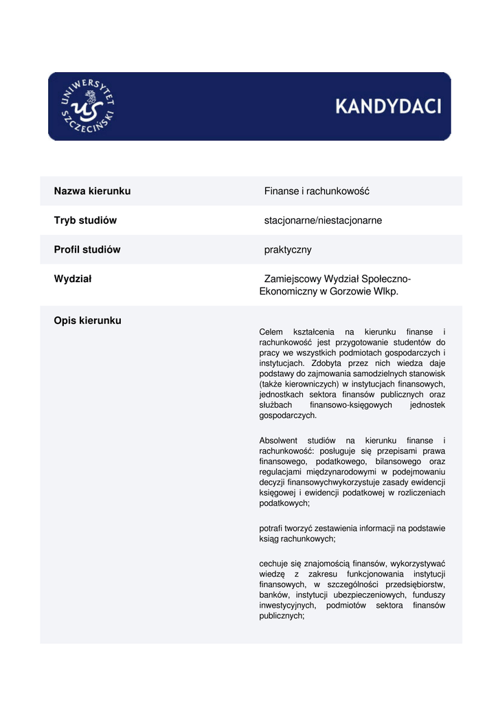 Nazwa kierunku Finanse i rachunkowość Tryb studiów stacjonarne/niestacjonarne Profil studiów praktyczny Wydział Zamiejscowy Wydział SpołecznoEkonomiczny w Gorzowie Wlkp. Opis kierunku Celem kształcenia na kierunku finanse i rachunkowość jest przygotowanie studentów do pracy we wszystkich podmiotach gospodarczych i instytucjach. Zdobyta przez nich wiedza daje podstawy do zajmowania samodzielnych stanowisk (także kierowniczych) w instytucjach finansowych, jednostkach sektora finansów publicznych oraz służbach finansowo-księgowych jednostek gospodarczych. Absolwent studiów na kierunku finanse i rachunkowość: posługuje się przepisami prawa finansowego, podatkowego, bilansowego oraz regulacjami międzynarodowymi w podejmowaniu decyzji finansowychwykorzystuje zasady ewidencji księgowej i ewidencji podatkowej w rozliczeniach podatkowych; potrafi tworzyć zestawienia informacji na podstawie ksiąg rachunkowych; cechuje się znajomością finansów, wykorzystywać wiedzę z zakresu funkcjonowania instytucji finansowych, w szczególności przedsiębiorstw, banków, instytucji ubezpieczeniowych, funduszy inwestycyjnych, podmiotów sektora finansów publicznych; podejmuje decyzje na podstawie analizy informacji finansowo-księgowych oraz wszechstronnej oceny ryzyka; rozumie występowanie ryzyka na rynku finansowym i globalnym oraz umie nim zarządzać; przeprowadza analizę fundamentalną rynku kapitałowego i wyciąga z niej wnioski decyzyjne; stosuje narzędzia niezbędne do podejmowania decyzji dotyczących oceny kondycji finansowej jednostek; posługuje się językiem obcym w praktyce finansów, rachunkowości i bankowości. Specjalności SPECJALNOŚCI URUCHAMIANE W TRAKCIE TRWANIA STUDIÓW 1.rachunkowość jednostek gospodarczych 2.finanse w administracji publicznej Uruchomienie danej specjalności uwarunkowane jest liczbą zadeklarowanych na tę specjalność studentów Kryteria kwalifikacji Podstawą przy postępowaniu rekrutacyjnym są wyniki egzaminu maturalnego. Przy rekrutacji na studia pierwszego stopnia należy wybrać po jednym przedmiocie z każdej grupy. Grupa I (jeden przedmiot do wyboru): geografia, historia, matematyka, wiedza o społeczeństwie, Grupa II (jeden przedmiot do wyboru): język obcy nowożytny, Grupa III (jeden przedmiot do wyboru): geografia, historia, wiedza o społeczeństwie, informatyka, fizyka i astronomia/fizyka, chemia, biologia, język obcy nowożytny Jeżeli kandydat nie zdawał danego przedmiotu na egzaminie maturalnym to uzyskuje zero punktów za ten przedmiot. Brak przedmiotu nie dyskwalifikuje go jednak w postępowaniu rekrutacyjnym. Wyniki z wybranych przedmiotów podstawione do algorytmu dają wynik końcowy kandydata. Przykładowe przedmioty rachunkowość finansowa finanse publiczne bankowość Możliwości zatrudnienia Absolwent posiada wiedzę, umiejętności i kompetencje społeczne przygotowujące go do pełnienia funkcji samodzielnego księgowego w jednostkach sektora prywatnego i publicznego, pracownika działu rachunkowości zarządczej, analityka kosztowego, analityka finansowego, specjalisty ds. kadr i płac oraz rozliczeń podatkowych, eksperta sprawozdawczości finansowej.Kwalifikacjeabsolwentaprzygotowujądo zawodów: specjalista ds. rachunkowości podatkowej, ds. wynagrodzeń, ds. finansów, ds. ubezpieczeń majątkowych i osobowych, analityk finansowy, analityk giełdowy, analityk kredytowy i oceny ryzyka kredytowego, skarbnik w jednostce samorządu terytorialnego. Kontynuacja nauki Na Uniwersytecie Szczecińskim kierunek finanse i rachunkowość realizowany jest również jako studia drugiego stopnia. Absolwenci studiów pierwszego stopnia na kierunku finanse i rachunkowość mają możliwość kontynuowania kształcenia na innych kierunkach studiów drugiego stopnia i podyplomowych, realizowanych na Uniwersytecie Szczecińskim. Terminy Terminy postępowania rekrutacyjnego na studia stacjonarne i niestacjonarne na rok akademicki 2017/2018 w przygotowaniu. Dokumenty Kandydaci zakwalifikowani do II etapu postępowania rekrutacyjnego na wszystkie kierunki i specjalności studiów w Uniwersytecie Szczecińskim mają obowiązek złożenia kompletu dokumentów. Wykaz dokumentów w przygotowaniu. Olimpiady dla tego kierunku Wykaz olimpiad stopnia centralnego, konkursów międzynarodowych oraz ogólnopolskich, w tym organizowanych przez Uniwersytet Szczeciński, których laureaci lub finaliści mogą korzystać z preferencji w procesie rekrutacji na I rok studiów pierwszego stopnia i jednolitych studiów magisterskich w Uniwersytecie Szczecińskim w latach 2015 - 2017. Opłaty Opłata rekrutacyjna na rok akademicki 2016/2017 wynosiła 85 zł. Opłata za studia niestacjonarne w przygotowaniu. Dodatkowe informacje Kontakt Masz pytania? [email protected] Biuro ds. Rekrutacji tel.: +48 91 444 10 29, +48 91 444 10 31, +48 91 444 11 60 Powered by TCPDF (www.tcpdf.org)