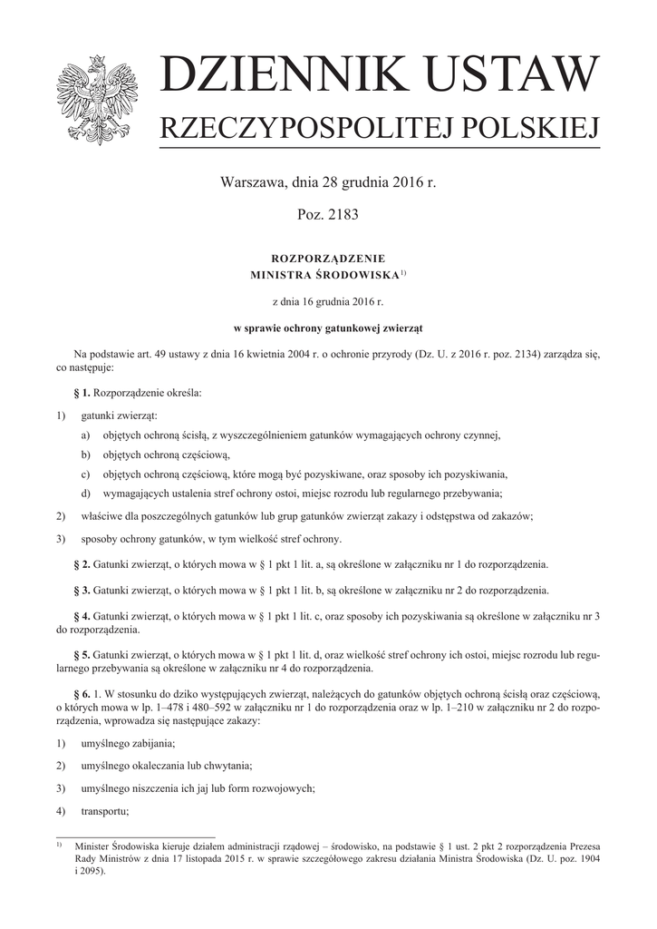 DZIENNIK USTAW RZECZYPOSPOLITEJ POLSKIEJ Warszawa, dnia 28 grudnia 2016 r. Poz. 2183 ROZPORZĄDZENIE MINISTRA ŚRODOWISKA 1) z dnia 16 grudnia 2016 r. w sprawie ochrony gatunkowej zwierząt Na podstawie art. 49 ustawy z dnia 16 kwietnia 2004 r. o ochronie przyrody (Dz. U. z 2016 r. poz. 2134) zarządza się, co następuje: § 1. Rozporządzenie określa: 1) gatunki zwierząt: a) objętych ochroną ścisłą, z wyszczególnieniem gatunków wymagających ochrony czynnej, b) objętych ochroną częściową, c) objętych ochroną częściową, które mogą być pozyskiwane, oraz sposoby ich pozyskiwania, d) wymagających ustalenia stref ochrony ostoi, miejsc rozrodu lub regularnego przebywania; 2) właściwe dla poszczególnych gatunków lub grup gatunków zwierząt zakazy i odstępstwa od zakazów; 3) sposoby ochrony gatunków, w tym wielkość stref ochrony. § 2. Gatunki zwierząt, o których mowa w § 1 pkt 1 lit. a, są określone w załączniku nr 1 do rozporządzenia. § 3. Gatunki zwierząt, o których mowa w § 1 pkt 1 lit. b, są określone w załączniku nr 2 do rozporządzenia. § 4. Gatunki zwierząt, o których mowa w § 1 pkt 1 lit. c, oraz sposoby ich pozyskiwania są określone w załączniku nr 3 do rozporządzenia. § 5. Gatunki zwierząt, o których mowa w § 1 pkt 1 lit. d, oraz wielkość stref ochrony ich ostoi, miejsc rozrodu lub regularnego przebywania są określone w załączniku nr 4 do rozporządzenia. § 6. 1. W stosunku do dziko występujących zwierząt, należących do gatunków objętych ochroną ścisłą oraz częściową, o których mowa w lp. 1–478 i 480–592 w załączniku nr 1 do rozporządzenia oraz w lp. 1–210 w załączniku nr 2 do rozporządzenia, wprowadza się następujące zakazy: 1) umyślnego zabijania; 2) umyślnego okaleczania lub chwytania; 3) umyślnego niszczenia ich jaj lub form rozwojowych; 4) transportu; 1) Minister Środowiska kieruje działem administracji rządowej – środowisko, na podstawie § 1 ust. 2 pkt 2 rozporządzenia Prezesa Rady Ministrów z dnia 17 listopada 2015 r. w sprawie szczegółowego zakresu działania Ministra Środowiska (Dz. U. poz. 1904 i 2095). Dziennik Ustaw –2– Poz. 2183 5) chowu; 6) zbierania, pozyskiwania, przetrzymywania lub posiadania okazów gatunków; 7) niszczenia siedlisk lub ostoi, będących ich obszarem rozrodu, wychowu młodych, odpoczynku, migracji lub żerowania; 8) niszczenia, usuwania lub uszkadzania gniazd, mrowisk, nor, legowisk, żeremi, tam, tarlisk, zimowisk lub innych schronień; 9) umyślnego uniemożliwiania dostępu do schronień; 10) zbywania, oferowania do sprzedaży, wymiany lub darowizny okazów gatunków; 11) wwożenia z zagranicy lub wywożenia poza granicę państwa okazów gatunków; 12) umyślnego przemieszczania z miejsc regularnego przebywania na inne miejsca; 13) umyślnego wprowadzania do środowiska przyrodniczego. 2. W stosunku do dziko występujących zwierząt, oznaczonych symbolem (1) w załącznikach nr 1 i 2 do rozporządzenia, wprowadza się dodatkowo zakaz umyślnego płoszenia lub niepokojenia. 3. W stosunku do dziko występujących zwierząt, oznaczonych symbolem (2) w załącznikach nr 1 i 2 do rozporządzenia, wprowadza się dodatkowo zakaz umyślnego płoszenia lub niepokojenia w miejscach noclegu, w okresie lęgowym w miejscach rozrodu lub wychowu młodych, lub w miejscach żerowania zgrupowań ptaków migrujących lub zimujących. 4. W stosunku do dziko występujących zwierząt, oznaczonych symbolem (3) w załączniku nr 1 do rozporządzenia, wprowadza się dodatkowo zakaz fotografowania, filmowania lub obserwacji, mogących powodować ich płoszenie lub niepokojenie. 5. Zakazy, o których mowa w ust. 1 pkt 7–9 oraz w ust. 3, nie dotyczą gołębia miejskiego (Columba livia forma urbana), z wyłączeniem miejsc gniazdowania w trakcie obecności piskląt w gnieździe. 6. Zakaz, o którym mowa w ust. 3, w zakresie dotyczącym miejsc żerowania zgrupowań ptaków migrujących lub zimujących nie dotyczy czapli siwej (Ardea cinerea) i kormorana (Phalacrocorax carbo) w obrębach hodowlanych ustanowionych zgodnie z przepisami o rybactwie śródlądowym. § 7. W stosunku do innych niż dziko występujących zwierząt, należących do gatunków objętych ochroną ścisłą oraz częściową, o których mowa w lp. 1–478, 480–494, 496, 497 i 499–592 w załączniku nr 1 do rozporządzenia oraz w lp. 1–101 i 104–210 w załączniku nr 2 do rozporządzenia, wprowadza się następujące zakazy: 1) umyślnego zabijania; 2) transportu; 3) chowu; 4) przetrzymywania lub posiadania okazów gatunków; 5) zbywania, oferowania do sprzedaży, wymiany lub darowizny okazów gatunków; 6) wwożenia z zagranicy lub wywożenia poza granicę państwa okazów gatunków; 7) umyślnego wprowadzania do środowiska przyrodniczego. § 8. 1. W stosunku do dziko występujących ptaków należących do gatunków, o których mowa w lp. 479 w załączniku nr 1 do rozporządzenia, wprowadza się następujące zakazy: 1) umyślnego zabijania; 2) umyślnego okaleczania lub chwytania; 3) umyślnego niszczenia ich jaj; 4) transportu; 5) zbierania, pozyskiwania, przetrzymywania lub posiadania okazów gatunków; Dziennik Ustaw –3– Poz. 2183 6) niszczenia, usuwania lub uszkadzania gniazd; 7) zbywania, oferowania do sprzedaży lub wymiany okazów gatunków; 8) umyślnego płoszenia lub niepokojenia w miejscach noclegu, w okresie lęgowym w miejscach rozrodu lub wychowu młodych. 2. W stosunku do dziko występujących zwierząt należących do gatunków, o których mowa w lp. 211 w załączniku nr 2 do rozporządzenia, wprowadza się następujące zakazy: 1) transportu; 2) przetrzymywania lub posiadania okazów gatunków; 3) zbywania, oferowania do sprzedaży lub wymiany okazów gatunków. § 9. Wprowadza się następujące odstępstwa od zakazów: 1) zakaz usuwania gniazd, o którym mowa w § 6 ust. 1 pkt 8 oraz w § 8 ust. 1 pkt 6, nie dotyczy usuwania od dnia 16 październi