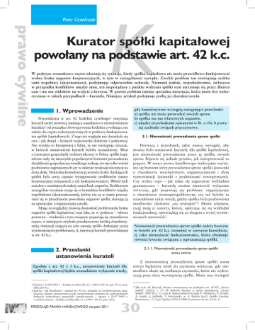 Piotr Grzelczak prawo cywilne K Kurator spółki kapitałowej powołany na podstawie art. 42 k.c. W praktyce stosunkowo często zdarzają się sytuacje, kiedy spółka kapitałowa nie może prawidłowo funkcjonować wobec braku organów korporacyjnych, w tym w szczególności zarządu. Zwykle problem ten rozwiązują szybko sami wspólnicy (akcjonariusze), podejmując odpowiednie uchwały. Niemniej jednak, niejednokrotnie, zwłaszcza w przypadku konfliktów między nimi, ten niepożądany z punktu widzenia spółki stan utrzymuje się przez dłuższy czas i nie ma widoków na wyjście z kryzysu. W prawie polskim istnieje specjalna instytucja, która może być wykorzystana w takich przypadkach – kuratela. Niniejszy artykuł podejmuje próbę jej charakterystyki. 1. Wprowadzenie Przewidziana w art. 42 kodeksu cywilnego1 instytucja kurateli osoby prawnej, istniejąca zasadniczo w niezmienionym kształcie2 od początku obowiązywania kodeksu cywilnego, nie należy do często wykorzystywanych w praktyce funkcjonowania spółek kapitałowych. Z tego też względu nie doczekała się ona – jak dotąd – licznych wypowiedzi doktryny i judykatury. Nie wynika to bynajmniej z faktu, że nie występują sytuacje, w których ustanowienie kurateli byłoby uzasadnione. Wraz z rozwojem gospodarki wolnorynkowej w Polsce spółki kapitałowe stały się niezwykle popularnymi formami prowadzenia działalności gospodarczej wszelkiego rodzaju i to nie tylko wśród podmiotów zagranicznych czy w zakresie realizacji inwestycji na dużą skalę. Naturalną konsekwencją wzrostu liczby działających spółek było coraz częstsze występowanie problemów natury korporacyjnej związanych z ich funkcjonowaniem. Wśród nich za jeden z ważniejszych należy uznać brak organów. Problem ten szczególnie wyraźnie rysuje się w kontekście konfliktów między wspólnikami (akcjonariuszami), którzy nie są w stanie porozumieć się w przedmiocie powołania organów spółki, skazując ją na operacyjny i organizacyjny paraliż. Mając na względzie prawną doniosłość problematyki braku organów spółki kapitałowej oraz fakt, że w praktyce – wbrew pozorom – trudności z tym związane pojawiają się stosunkowo często, w niniejszym artykule przedstawiono krótką charakterystykę instytucji mającej na celu sanację spółki dotkniętej wyżej wymienionymi problemami, tj. instytucji kurateli przewidzianej w art. 42 k.c. gdy kumulatywnie wystąpią następujące przesłanki: a) spółka nie może prowadzić swoich spraw, b) spółka nie ma właściwych organów, c) między przesłankami opisanymi w lit. a i lit. b powyżej zachodzi związek przyczynowy. 2.1. Niemożność prowadzenia spraw spółki Pierwszą z przesłanek, jakie muszą wystąpić, aby można było ustanowić kuratelę dla spółki kapitałowej, jest niemożność prowadzenia przez tę spółkę swoich spraw. Pojawia się jednak pytanie, jak interpretować to pojęcie. W nauce prawa handlowego tradycyjnie wyróżnia się bowiem sferę prowadzenia spraw spółki (stosunki o charakterze wewnętrznym, organizacyjnym) i sferę reprezentacji (stosunki z podmiotami zewnętrznymi). Czy wobec tego – jak zdaje się sugerować wykładnia gramatyczna – kuratelę można ustanowić wyłącznie wówczas, gdy pojawiają się problemy organizacyjne o charakterze wewnątrzspółkowym, czy też byłoby to uzasadnione także wtedy, gdyby spółka była pozbawiona możliwości działania „na zewnątrz”? Moim zdaniem, rację mają ci autorzy, którzy, opierając się na wykładni funkcjonalnej, opowiadają się za drugim z wyżej wymienionych stanowisk3. Niemożność prowadzenia spraw spółki należy bowiem w świetle art. 42 k.c. rozumieć w szerszym kontekście, tj. jako niemożność funkcjonowania, która obejmuje również kwestie związane z reprezentacją spółki. 2.1.1. Niemożność prowadzenia spraw spółki sensu stricto 2. Przesłanki ustanowienia kurateli Zgodnie z art. 42 § 1 k.c., ustanowienie kurateli dla spółki kapitałowej będzie uzasadnione wyłącznie wtedy, Z niemożnością prowadzenia spraw spółki sensu stricto będziemy mieli do czynienia wówczas, gdy niemożliwa okaże się realizacja czynności, które nie wykraczają poza sferę wewnętrzną spółki. Może ona wystąpić 1 Ustawa z 23.04.1964 r. – Kodeks cywilny (Dz. U. z 1964 r. Nr 16, poz. 93 ze zm.), dalej jako k.c. 2 Jedyna – jak dotychczas – zmiana art. 42 k.c. polegała na wyeliminowaniu ograniczenia zakresu zastosowania wyżej wymienionego przepisu do osób prawnych będących jednostkami gospodarki uspołecznionej – ustawa z 28.07.1990 r. o zmianie ustawy – Kodeks cywilny (Dz. U. z 1990 r. Nr 55, poz. 321). 3 Tak m.in. M. Barczak, Kurator ustanowiony na podstawie art. 42 KC, „Prawo Spółek” 2010/2, s. 37; M. Bielecki, Kurator w spółce kapitałowej, „Prawo Spółek” 2007/10, s. 11; oraz K. Kopaczyńska-Pieczniak, E. Niezbecka, Z. Gawlik, A. Janiak, A. Jedliński, T. Sokołowski, w: A. Kidyba (red.), Kodeks Cywilny. Komentarz, t. 1: Część Ogólna, LEX/el. 2009, komentarz do art. 42 ak. 4. PRZEGLĄD PRAWA HANDLOWEGO sierpień 2011 30 2.1.2. Niemożność reprezentacji spółki Istnienie odpowiedniej struktury organizacyjnej i stosowne delegowanie kompetencji o charakterze wewnętrznym może zapewnić prawidłowy przebieg procesów produkcji, dystrybucji itp., lecz nie eliminuje problemów związanych z niemożliwością występowania spółki w obrocie. Dlatego też występujący łącznie z brakiem zarządu brak prokurentów lub pełnomocników spółki, uniemożliwiający jej uczestnictwo w życiu gospodarczym, może stanowić podstawę ustanowienia kurateli. Należy przy tym zwrócić uwagę, że niemożność występowania w obrocie jest dla spółki szczególnie niebezpieczna, gdyż spółka pozbawiona jest wówczas możliwości skutecznej obrony swoich interesów. Ryzyko z tym związane jest wysokie, zwłaszcza gdy stan ten 
