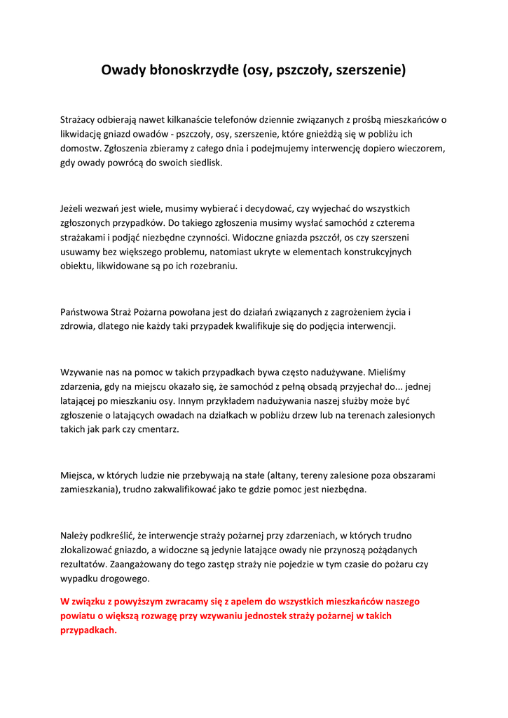 Owady błonoskrzydłe (osy, pszczoły, szerszenie) Strażacy odbierają nawet kilkanaście telefonów dziennie związanych z prośbą mieszkańców o likwidację gniazd owadów - pszczoły, osy, szerszenie, które gnieżdżą się w pobliżu ich domostw. Zgłoszenia zbieramy z całego dnia i podejmujemy interwencję dopiero wieczorem, gdy owady powrócą do swoich siedlisk. Jeżeli wezwań jest wiele, musimy wybierać i decydować, czy wyjechać do wszystkich zgłoszonych przypadków. Do takiego zgłoszenia musimy wysłać samochód z czterema strażakami i podjąć niezbędne czynności. Widoczne gniazda pszczół, os czy szerszeni usuwamy bez większego problemu, natomiast ukryte w elementach konstrukcyjnych obiektu, likwidowane są po ich rozebraniu. Państwowa Straż Pożarna powołana jest do działań związanych z zagrożeniem życia i zdrowia, dlatego nie każdy taki przypadek kwalifikuje się do podjęcia interwencji. Wzywanie nas na pomoc w takich przypadkach bywa często nadużywane. Mieliśmy zdarzenia, gdy na miejscu okazało się, że samochód z pełną obsadą przyjechał do... jednej latającej po mieszkaniu osy. Innym przykładem nadużywania naszej służby może być zgłoszenie o latających owadach na działkach w pobliżu drzew lub na terenach zalesionych takich jak park czy cmentarz. Miejsca, w których ludzie nie przebywają na stałe (altany, tereny zalesione poza obszarami zamieszkania), trudno zakwalifikować jako te gdzie pomoc jest niezbędna. Należy podkreślić, że interwencje straży pożarnej przy zdarzeniach, w których trudno zlokalizować gniazdo, a widoczne są jedynie latające owady nie przynoszą pożądanych rezultatów. Zaangażowany do tego zastęp straży nie pojedzie w tym czasie do pożaru czy wypadku drogowego. W związku z powyższym zwracamy się z apelem do wszystkich mieszkańców naszego powiatu o większą rozwagę przy wzywaniu jednostek straży pożarnej w takich przypadkach. Strażacy PSP i OSP powiatu otwockiego Jak rozróżniać owady osowate? Rodzina pszczela składa się z jednej w pełni rozwinietej samicy zwanej matką (królową) oraz z różnej liczby pszczół robotnic i trutni. Gniazdo może liczyć od 10-60 tysięcy osobników. PSZCZOŁY w warunkach naturalnych gnieżdżą się w dziuplach starych drzew, małych jaskiniach oraz w szczelinach skalnych. Mogą zająć też szparę czy wnękę w murze lub pod dachem zabudowań gospodarczych lub mieszkaniowych. MATKA pszczoła mierzy 20-25 mm, a ciężar jej ciała wynosi 230-280 mg. Najbardziej charakterystyczną cechą matki jest długi odwłok, zwężający się ku tylnemu końcowi, wystający dość znacznie poza końce złożonych skrzydeł. TRUTNIE charakteryzuje mocna budowa ciała. Tułów i odwłok mają szeroki, duże oczy łączące się na górze głowy. ROBOTNICE są samicami przystosowanymi do wykonywania różnych prac w rodzinie. Długość ciała robotnic wynosi 12-15 mm, a średnia masa ciała około 100 mg. Są więc one najmniejszymi osobnikami w rodzinie. OSA ma tułów gładki, smukły, dużą głowę a na niej zagięte czułki. Na tułowiu znajdują się dwie pary błoniastych, wąskich skrzydeł. Na żółtym lub pomarańczowym odwłoku, który ma charakterystyczne przewężenie tak zwaną osią talie, widoczne są czarne plamy i paski. Długość ciała os robotnic, które najczęściej widzimy wokół nas, wynosi 20-25 mm. Pszczoły, pokrewne osą są więc bardziej krępe, ciemniejsze i silniej owłosione z mniej wyraźnym przewężeniem odwłoka. Do os zaliczamy również bardziej niebezpieczne szerszenie. SZERSZENIE są bardzo duże. Długość ciała robotnicy wynosi od 17-24 mm, królowej od 25-35 mm. Głowa szerszenia jest żółta z czarną przepaską, tułów czarny, odwłok brunatny w czarne pasy, nogi czerwono-brunatne. Szerszenie mają żądła znacznie większe niż inne gatunki os, a jad silniejszy. Użądlenie jest wyjątkowo bolesne, dość często pozostawia ropiejącą ranę. Nic dziwnego, że szerszeń wzbudza najwięcej lęku, chociaż jest gatunkiem występującycm znacznie rzadziej niż inne osy. Z szerszeniami są mylone trzmiele. TRZMIELE różnią się od innych os krępą budową silnie owłosionego ciała i brunatno-czarnym ubarwieniem. Rzadko żądlą. Uwaga! Są pod ochroną. Użądlenia, zagrożenia dla człowieka. Budowa narządu - woreczka jadowego os i pszczół jest zbliżona. Średnia zawartość woreczka jadowego robotnic wynosi 0,3 mg jadu. A ilość jadu wprowadzonego do ciała podczas żądlenia wynosi około 0,012 mg. W porównaniu z pszczołami, osy i szerszenie mają żądła dłuższe a przede wszystkim gładkie, bez zadziorów, o kształcie szablastym. Mogą godzić ofiarę wielokrotnie, nie tracąc możliwości kolejnych użądleń. U różnych gatunków os żądło różni się długością. Średnio mierzy ono od 2,6-2,7 mm. Jedynie u szerszeni jest ono zdecydowanie dłuższe do 3,7 mm. Ze względu na rozmiary żądła i ilości jadu użądlenia szerszeni są bardzo bolesne i stosunkowo niebezpieczne. Gatunki z rodziny os osiągają swą pełną liczebność i związaną z tym zdolność obronną w lecie. Stąd też osy żądlą broniąc swojego gniazda, dopiero późną wiosną i latem. Większość os żądli jedynie w najbliższych okolicach swoich gniazd; nie zaczepiane nie atakują. Przygniecione pojedyncze robotnice mogą oczywiście użądlić z dala od gniazda. Najczęściej żądlonym przez omawiane owady miejscem są kończyny górne i twarz. Wahania reakcji organizmu ludzkiego na jad żądłówek są ogromne. Reakcja ta zależy od pochodzenia i ilości wstrzykiwanego jadu, która wiąże się z liczbą użądleń, od miejsca ukłucia oraz od indywidualej wrażliwości organizmu człowieka. U ogromnej większości ludzi występuje tylko tak zwana reakcja miejscowa (lokalna) objawiająca się odczuwaniem bólu i pieczeniem w miejscu użądlenia przez kilka lub kilkanaście minut, a po krótszym