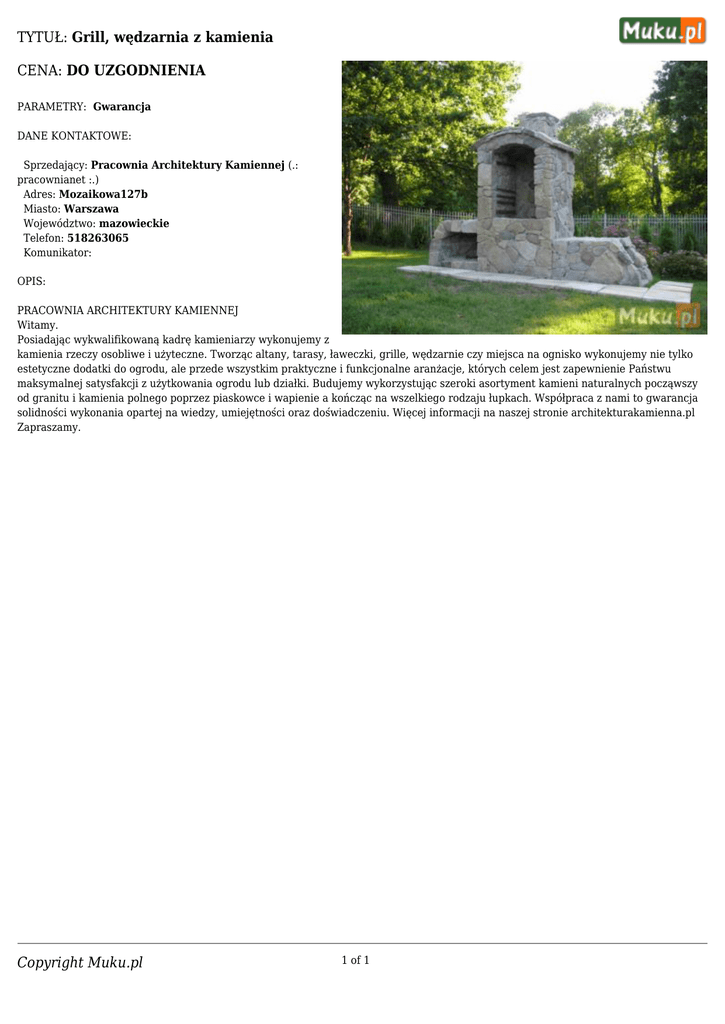 TYTUŁ: Grill, wędzarnia z kamienia CENA: DO UZGODNIENIA PARAMETRY: Gwarancja DANE KONTAKTOWE: Sprzedający: Pracownia Architektury Kamiennej (.: pracownianet :.) Adres: Mozaikowa127b Miasto: Warszawa Województwo: mazowieckie Telefon: 518263065 Komunikator: OPIS: PRACOWNIA ARCHITEKTURY KAMIENNEJ Witamy. Posiadając wykwalifikowaną kadrę kamieniarzy wykonujemy z kamienia rzeczy osobliwe i użyteczne. Tworząc altany, tarasy, ławeczki, grille, wędzarnie czy miejsca na ognisko wykonujemy nie tylko estetyczne dodatki do ogrodu, ale przede wszystkim praktyczne i funkcjonalne aranżacje, których celem jest zapewnienie Państwu maksymalnej satysfakcji z użytkowania ogrodu lub działki. Budujemy wykorzystując szeroki asortyment kamieni naturalnych począwszy od granitu i kamienia polnego poprzez piaskowce i wapienie a kończąc na wszelkiego rodzaju łupkach. Współpraca z nami to gwarancja solidności wykonania opartej na wiedzy, umiejętności oraz doświadczeniu. Więcej informacji na naszej stronie architekturakamienna.pl Zapraszamy. Copyright Muku.pl 1 of 1