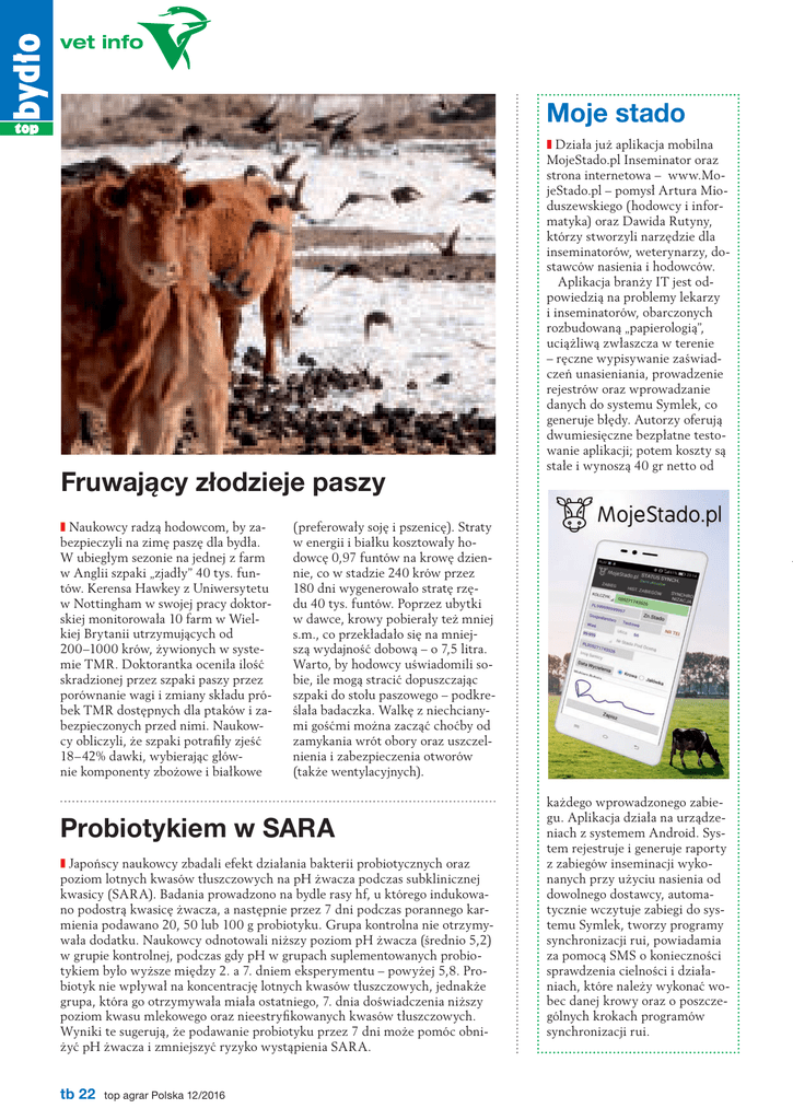 vet info Moje stado Fruwający złodzieje paszy ❚ Naukowcy radzą hodowcom, by zabezpieczyli na zimę paszę dla bydła. W ubiegłym sezonie na jednej z farm w Anglii szpaki „zjadły” 40 tys. funtów. Kerensa Hawkey z Uniwersytetu w Nottingham w swojej pracy doktorskiej monitorowała 10 farm w Wielkiej Brytanii utrzymujących od 200–1000 krów, żywionych w systemie TMR. Doktorantka oceniła ilość skradzionej przez szpaki paszy przez porównanie wagi i zmiany składu próbek TMR dostępnych dla ptaków i zabezpieczonych przed nimi. Naukowcy obliczyli, że szpaki potrafiły zjeść 18–42% dawki, wybierając głównie komponenty zbożowe i białkowe (preferowały soję i pszenicę). Straty w energii i białku kosztowały hodowcę 0,97 funtów na krowę dziennie, co w stadzie 240 krów przez 180 dni wygenerowało stratę rzędu 40 tys. funtów. Poprzez ubytki w dawce, krowy pobierały też mniej s.m., co przekładało się na mniejszą wydajność dobową – o 7,5 litra. Warto, by hodowcy uświadomili sobie, ile mogą stracić dopuszczając szpaki do stołu paszowego – podkreślała badaczka. Walkę z niechcianymi gośćmi można zacząć choćby od zamykania wrót obory oraz uszczelnienia i zabezpieczenia otworów (także wentylacyjnych). Probiotykiem w SARA ❚ Japońscy naukowcy zbadali efekt działania bakterii probiotycznych oraz poziom lotnych kwasów tłuszczowych na pH żwacza podczas subklinicznej kwasicy (SARA). Badania prowadzono na bydle rasy hf, u którego indukowano podostrą kwasicę żwacza, a następnie przez 7 dni podczas porannego karmienia podawano 20, 50 lub 100 g probiotyku. Grupa kontrolna nie otrzymywała dodatku. Naukowcy odnotowali niższy poziom pH żwacza (średnio 5,2) w grupie kontrolnej, podczas gdy pH w grupach suplementowanych probiotykiem było wyższe między 2. a 7. dniem eksperymentu – powyżej 5,8. Probiotyk nie wpływał na koncentrację lotnych kwasów tłuszczowych, jednakże grupa, która go otrzymywała miała ostatniego, 7. dnia doświadczenia niższy poziom kwasu mlekowego oraz nieestryfikowanych kwasów tłuszczowych. Wyniki te sugerują, że podawanie probiotyku przez 7 dni może pomóc obniżyć pH żwacza i zmniejszyć ryzyko wystąpienia SARA. tb 22 top agrar Polska 12/2016 ❚ Działa już aplikacja mobilna MojeStado.pl Inseminator oraz strona internetowa – www.MojeStado.pl – pomysł Artura Mioduszewskiego (hodowcy i informatyka) oraz Dawida Rutyny, którzy stworzyli narzędzie dla inseminatorów, weterynarzy, dostawców nasienia i hodowców. Aplikacja branży IT jest odpowiedzią na problemy lekarzy i inseminatorów, obarczonych rozbudowaną „papierologią”, uciążliwą zwłaszcza w terenie – ręczne wypisywanie zaświadczeń unasieniania, prowadzenie rejestrów oraz wprowadzanie danych do systemu Symlek, co generuje błędy. Autorzy oferują dwumiesięczne bezpłatne testowanie aplikacji; potem koszty są stałe i wynoszą 40 gr netto od każdego wprowadzonego zabiegu. Aplikacja działa na urządzeniach z systemem Android. System rejestruje i generuje raporty z zabiegów inseminacji wykonanych przy użyciu nasienia od dowolnego dostawcy, automatycznie wczytuje zabiegi do systemu Symlek, tworzy programy synchronizacji rui, powiadamia za pomocą SMS o konieczności sprawdzenia cielności i działaniach, które należy wykonać wobec danej krowy oraz o poszczególnych krokach programów synchronizacji rui. z terenu Bardzo droga korekcja ❚ Czy umiejętnie przeprowadzona korekcja racic może zaszkodzić krowom? Okazuje się, że tak i to bardzo – twierdzi lek. wet. Janusz Leśniak. Jako przykład podaje ostatni przypadek z terenu. – Zostałem poproszony przez kolegę, który opiekuje się stadem liczącym ponad 100 sztuk o pomoc w zdiagnozowaniu problemu. W dwa tygodnie po prawidłowo przeprowadzonej korekcji racic, krowy zaczęły chorować. Hodowca zgłosił biegunki, przy czym problem dotyczył tylko krów dojnych. Biegunki udało się opanować, ale wkrótce potem nastąpiła seria ronień w 6.–7.–8. miesiącu ciąży u 7–8 % stada. Z wywiadu wynikało, że na dwa tygodnie przed wystąpieniem biegunki w stadzie przeprowadzono korekcję racic. Wykonała ją ta sama ekipa co zawsze. Na nią więc padło podejrzenie. Jak się potem okazało – jak najbardziej słuszne – ten sam problem miały stada korzystające z usług tej firmy. – Pobraliśmy do badań krew od sztuk, które poroniły. Wyniki tylko potwierdziły wstępną diagnozę, że sprawcą zamieszania jest wirus BVD. Ponieważ od zakażenia minął już ponad miesiąc, krowy zdążyły wytworzyć przeciwciała i widać to było w wynikach – wyjaśnia Janusz Leśnik. I dodaje – w oborach Lubelszczyzny choroby zakaźne to coraz poważniejszy problem. I to wcale nie ze względu na przemieszczenia w stadzie, bo nasi hodowcy raczej rzadko kupują zwierzęta z zewnątrz, ale z powodów niedociągnięć w bioasekuracji. Wpuszczając „obcego” (korektora, lekarza, inseminatora, dostawcę pasz) zawsze należy pamiętać, że jest on potencjalnym wektorem przenoszenia chorób – apeluje lekarz. W pechowym stadzie hodowca zdecydował o konieczności określenia statusu immunologicznego. – Wprowadziliśmy obowiązkowe szczepienie Baza na Podlasiu: Krasowo Wielkie 8, 18-212 Nowe Piekuty tel. 86 476 16 91 Przedsiębiorstwo BIS Grunwaldzka 48, 63-840 Krobia, tel. 65 572 73 36, fax 65 573 86 31 Sprzedaż jałowic cielnych ras mlecznych www.intergen.com.pl lek. wet. Janusz Leśniak wszystkich sztuk przeciwko BVD (raz w roku szczepionką żywą) i IBR, który w ostatnim czasie został zaniedbany, bo nic się nie działo (wcześniej hodowca szczepił). Odkryliśmy też pojedyncze sztuki zarażone Neospora caninum. Obecnie lekarz weterynarii prowadzący stado wraz z hodowcą opracowują dalszą strategię postępowania. - Jałowice cielne - Krowy pierwiastki - Cieliczki HF [email protected] www.bis.poznan.pl www.bis.poznan.pl, [email protected] Nasie
