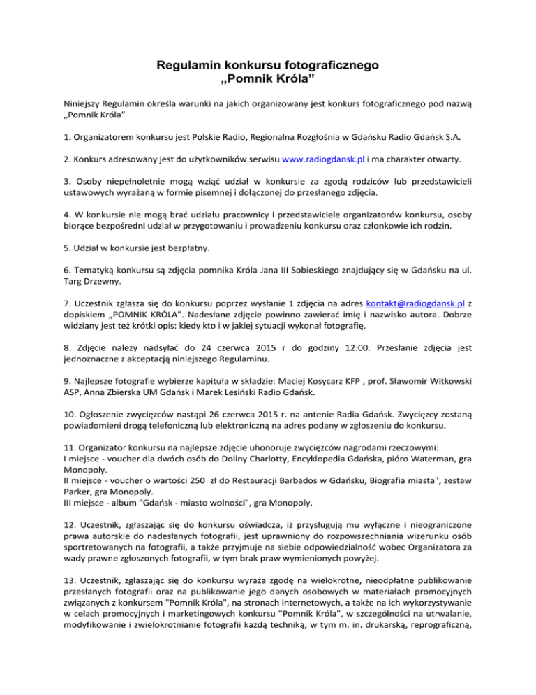 Regulamin konkursu fotograficznego „Pomnik Króla” Niniejszy Regulamin określa warunki na jakich organizowany jest konkurs fotograficznego pod nazwą „Pomnik Króla” 1. Organizatorem konkursu jest Polskie Radio, Regionalna Rozgłośnia w Gdańsku Radio Gdańsk S.A. 2. Konkurs adresowany jest do użytkowników serwisu www.radiogdansk.pl i ma charakter otwarty. 3. Osoby niepełnoletnie mogą wziąć udział w konkursie za zgodą rodziców lub przedstawicieli ustawowych wyrażaną w formie pisemnej i dołączonej do przesłanego zdjęcia. 4. W konkursie nie mogą brać udziału pracownicy i przedstawiciele organizatorów konkursu, osoby biorące bezpośredni udział w przygotowaniu i prowadzeniu konkursu oraz członkowie ich rodzin. 5. Udział w konkursie jest bezpłatny. 6. Tematyką konkursu są zdjęcia pomnika Króla Jana III Sobieskiego znajdujący się w Gdańsku na ul. Targ Drzewny. 7. Uczestnik zgłasza się do konkursu poprzez wysłanie 1 zdjęcia na adres [email protected] z dopiskiem „POMNIK KRÓLA”. Nadesłane zdjęcie powinno zawierać imię i nazwisko autora. Dobrze widziany jest też krótki opis: kiedy kto i w jakiej sytuacji wykonał fotografię. 8. Zdjęcie należy nadsyłać do 24 czerwca 2015 r do godziny 12:00. Przesłanie zdjęcia jest jednoznaczne z akceptacją niniejszego Regulaminu. 9. Najlepsze fotografie wybierze kapituła w składzie: Maciej Kosycarz KFP , prof. Sławomir Witkowski ASP, Anna Zbierska UM Gdańsk i Marek Lesiński Radio Gdańsk. 10. Ogłoszenie zwycięzców nastąpi 26 czerwca 2015 r. na antenie Radia Gdańsk. Zwycięzcy zostaną powiadomieni drogą telefoniczną lub elektroniczną na adres podany w zgłoszeniu do konkursu. 11. Organizator konkursu na najlepsze zdjęcie uhonoruje zwycięzców nagrodami rzeczowymi: I miejsce - voucher dla dwóch osób do Doliny Charlotty, Encyklopedia Gdańska, pióro Waterman, gra Monopoly. II miejsce - voucher o wartości 250 zł do Restauracji Barbados w Gdańsku, Biografia miasta", zestaw Parker, gra Monopoly. III miejsce - album "Gdańsk - miasto wolności", gra Monopoly. 12. Uczestnik, zgłaszając się do konkursu oświadcza, iż przysługują mu wyłączne i nieograniczone prawa autorskie do nadesłanych fotografii, jest uprawniony do rozpowszechniania wizerunku osób sportretowanych na fotografii, a także przyjmuje na siebie odpowiedzialność wobec Organizatora za wady prawne zgłoszonych fotografii, w tym brak praw wymienionych powyżej. 13. Uczestnik, zgłaszając się do konkursu wyraża zgodę na wielokrotne, nieodpłatne publikowanie przesłanych fotografii oraz na publikowanie jego danych osobowych w materiałach promocyjnych związanych z konkursem "Pomnik Króla", na stronach internetowych, a także na ich wykorzystywanie w celach promocyjnych i marketingowych konkursu "Pomnik Króla", w szczególności na utrwalanie, modyfikowanie i zwielokrotnianie fotografii każdą techniką, w tym m. in. drukarską, reprograficzną, zapisu magnetycznego, cyfrową, audiowizualną, na jakichkolwiek nośnikach, bez ograniczeń co do ilości i wielkości nakładu, oraz rozpowszechnianie fotografii poprzez publiczne udostępnianie w taki sposób, aby każdy mógł mieć do nich dostęp w miejscu i w czasie przez siebie wybranym, w szczególności w sieciach komputerowych, Internecie i Intranecie oraz telefonach komórkowych. 14. Uczestnik zrzeka się jakiegokolwiek wynagrodzenia za korzystanie ze zdjęć w celach związanych z konkursem "Pomnik Króla", w tym w szczególności wynagrodzenia za rozpowszechnianie zdjęć na stronie internetowej oraz inne przypadki publicznego udostępniania zdjęć w ramach konkursu "Pomnik Króla". 15. Laureaci konkursu zrzekają się jakiegokolwiek wynagrodzenia za korzystanie ze zdjęć przez Radio Gdańsk SA i Miasto Gdańsk, w tym w szczególności wynagrodzenia za rozpowszechnianie zdjęć na stronie internetowej oraz inne przypadki publicznego udostępniania zdjęć w ramach, W szczególności na utrwalanie, modyfikowanie i zwielokrotnianie fotografii każdą techniką, w tym m. in. drukarską, reprograficzną, zapisu magnetycznego, cyfrową, audiowizualną, na jakichkolwiek nośnikach, bez ograniczeń co do ilości i wielkości nakładu, oraz rozpowszechnianie fotografii poprzez publiczne udostępnianie w taki sposób, aby każdy mógł mieć do nich dostęp w miejscu i w czasie przez siebie wybranym, w szczególności w sieciach komputerowych, Internecie i Intranecie oraz telefonach komórkowych. 16. W przypadku wystąpienia wobec Organizatora przez osoby trzecie z roszczeniami z tytułu naruszenia praw autorskich lub dóbr osobistych osób trzecich związanych z korzystaniem ze zdjęć, Uczestnik Konkursu pokryje koszty i zapłaci odszkodowania związane z roszczeniami takich osób. 17. Organizatorowi przysługuje prawo zatrzymania wszystkich nadesłanych prac konkursowych, natomiast własność zdjęć nagrodzonych przechodzi nieodpłatnie na Organizatora z chwilą ogłoszenia wyników konkursu. 18. Organizator konkursu ma prawo odrzucić zdjęcie bez podania uzasadnienia. Dotyczy to w szczególności zdjęć niezgodnych z Regulaminem, odbiegających od tematu, wadliwych technicznie. Organizator może też zdyskwalifikować zdjęcia już biorące udział w konkursie, w szczególności w przypadku poddania w wątpliwość ich autorstwa. 19. Udział w konkursie jest równoznaczny z wyrażeniem przez osoby uczestniczące zgody na przetwarzanie przez organizatora konkursie ich danych osobowych na potrzeby konkursu oraz w celach marketingowych (ustawa o ochronie danych osobowych z dn. 29.08.1997 r. Dz.U. Nr 133, poz. 833 z póz. zm.). 20. Obowiązek zapłacenia podatku dochodowego od nagród w Konkursie leży po stronie laureata Konkursu zgodnie z art.30 ust. 1 pkt. 2 w związku z art. 41 ust.7 ustawy o podatku dochodowym od osób fizycznych. Podatek od nagrody należy uiścić nie później niż w dniu jej odebrania. Informacja o konieczności zapłaty podatku od