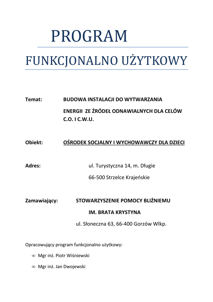 PROGRAM FUNKCJONALNO UŻYTKOWY Temat: BUDOWA INSTALACJI DO WYTWARZANIA ENERGII ZE ŹRÓDEŁ ODNAWIALNYCH DLA CELÓW C.O. I C.W.U. Obiekt: OŚRODEK SOCJALNY I WYCHOWAWCZY DLA DZIECI Adres: ul. Turystyczna 14, m. Długie 66-500 Strzelce Krajeńskie Zamawiający: STOWARZYSZENIE POMOCY BLIŹNIEMU IM. BRATA KRYSTYNA ul. Słoneczna 63, 66-400 Gorzów Wlkp. Opracowujący program funkcjonalno użytkowy: • Mgr inż. Piotr Wiśniewski • Mgr inż. Jan Dwojewski Program funkcjonalno użytkowy Gorzów Wlkp. lipiec 2012 Przedmiot zamówienia wg. CPV: 45.33.10.00.-06 - Instalowanie urządzeń grzewczych. 45.33.11.00.-07 – Instalowanie centralnego ogrzewania. 45.30.00.00.-00 – Roboty instalacyjne w budynkach. 45.32.00.00.-06 – Roboty izolacyjne. 45.00.00.00.-07 – Roboty budowlane. 45.40.00.00.-01 – Roboty wykończeniowe w zakresie obiektów budowlanych. 71.32.12.00.-06 – Usługi projektowania systemów grzewczych. 71.00.00.00.-08 – Usługi architektoniczne, budowali, inżynieryjne i kontrolne. 2 Program funkcjonalno użytkowy SPIS ZAWARTOŚCI PROGRAMU 1. Opis ogólny przedmiotu zamówienia. 1.1. Opis stanu obiektów. 2. Zakres rzeczowy robót. 3. Wymagania Zamawiającego w stosunku do przedmiotu zamówienia. 3.1. Wymagana dokumentacja techniczna. 3.2. Wymagania w trakcie realizacji inwestycji. 4. Wykaz załączników. 3 Program funkcjonalno użytkowy 1. OPIS OGÓLNY PRZEDMIOTU ZAMÓWIENIA Przedmiotem zamówienia jest budowa instalacji grzewczych opartych o źródła energii odnawialnych: biomasa, energia słoneczna, wiatrowa, geotermia (pompy ciepła). Technologia wytwarzania ciepła ze źródeł odnawialnych zbudowana będzie w układzie energii skojarzonej. W miejsce kotłowni węglowej zaprojektowano dwa kotły na biomasę o mocy 150 i 230KW. Służyć będą dla instalacji centralnego ogrzewania i ciepłej wody użytkowej. W okresie letnim oraz jesienno wiosennym instalacje c.o. i c.w.u. wspomagane będą przez instalację kolektorów słonecznych (80 paneli o powierzchni 200m2). Czynnik grzewczy dla c.o. i c.w.u. rozprowadzany będzie do sześciu budynków przez instalacje rur preizolowanych ułożonych w gruncie. Dwa budynki , które są oddalone od kotłowni będą zasilane wyłącznie przez energię odnawialną- słoneczną i wiatrową. W budynku nr 5 i 8 zaprojektowano pompy ciepła z wymiennikiem gruntowym. Moc pomp ciepła : 5,7 kW i 8kW.Do napędu sprężarek pomp ciepła o mocy 1,7kW i 2,1kW zaprojektowano panele fotowoltaiczne o mocy 6kW (27 paneli polikrystalicznych). Układ ten będzie wspomagany przez elektrownie wiatrową o mocy 10KW. Cały system do wytwarzania energii elektrycznej dla zasilania pomp ciepła będzie ze sobą synchronizowany i włączony do sieci energetycznej o napięciu 400V.W 4 Program funkcjonalno użytkowy celu zmniejszenia zapotrzebowania na energię grzewczą w budynku kuchniastołówka zaprojektowano rekuperator do odzysku ciepła. Odzyskane ciepło z urządzeń grzewczych kuchni i wentylacji zostanie wykorzystane do wspomagania ogrzewania pomieszczeń. Do przygotowania paliwa z biomasy (zrębki) zostanie zakupiony rębak z napędem spalinowym. Zrębki będą pozyskiwane z gałęzi w lasach oraz z wycinek przy drogach. Obiekt: Ośrodek Socjalny i Wychowawczy dla dzieci i Młodzieży oraz mieszkalny dla bezdomnych zlokalizowany jest w m-ści Długie powiat strzeleckodrezdeński. Obiekt wraz z działką są własnością Stowarzyszenia Pomocy Bliźniemu im. Brata Krystyna w Gorzowie Wlkp. Ośrodek przeznaczony jest dla dzieci i młodzieży głównie z rodzin ubogich, w sezonie przebywa około 450 osób. Wykorzystywany jest głównie w okresie od maja do września,ze względu na brak instalacji grzewczych.Oprócz dzieci i młodzieży w ośrodku przebywają również bezdomni. Ośrodek zlokalizowany jest przy kompleksie leśnym nad jeziorem. Posiada doskonałe walory klimatyczno-wypoczynkowe. W ostatnim okresie zbudowano boiska sportowe oraz zmodernizowano infrastrukturę kanalizacyjną, ściekową, wód deszczowych oraz instalację energetyczną. Szczegółowy zakres rzeczowy modernizacji opisano w dalszej części PFU. 1.1. Opis stanu istniejącego budynków: 5 Program funkcjonalno użytkowy Ośrodek kolonijno-sportowo-wypoczynkowy składa się z ośmiu budynków wolno stojących jedno i dwukondygnacyjnych w tym: pięć budynków mieszkalnych , trzy budynki stanowiące zaplecze dla obsługi technicznej i socjalnej. 1.1.1 BUDYNEK MIESZKALNY NR 1 Powierzchnia zabudowy: 316,6m2 Powierzchnia użytkowa: 464,3m2. Budynek istniejący dwukondygnacyjny niepodpiwniczony, ściany murowane z gazobetonu grubość 24cm, tynkowane obustronnie. Ściany zewnętrzne ocieplone styropianem o gr.10cm, tynki mineralne. Stropy prefabrykowane. Stropodach wentylowany, ocieplony warstwą granulatu celulozowego. Dach płaski pokryty papą termozgrzewalną. Rynny i rury spustowe ocynkowane. Stolarka okienna i drzwiowa z PCV- w dobrym stanie technicznym. Posadzki: łazienki- płytki terakota. Pokoje:wykładzina podłogowa winigan. Korytarze: wykładzina market. Ściany: łazienki płytki glazurowane na całą wysokość.Korytarz: tynk strukturalny do wysokości 1,6m powyżej malowany farbą emulsyjną białą. Instalacja: elektryczna, wody zimnej, kanalizacja w dobrym stanie technicznym po wykonanym remoncie. Budynek nie posiada instalacji c.o. Ciepła woda użytkowa podgrzewana jest termach elektrycznych przepływowych. 6 Program funkcjonalno użytkowy Budynek (parter) jest przystosowany dla osób niepełnosprawnych. 1.1.2. BUDYNEK MIESZKALNY NR 2 Powierzchnia zabudowy: 330,6m2 Kubatura: 2023,1m3 Powierzchnia użytkowa: 469,m2 Budynek istniejący dwukondygnacyjny niepodpiwniczony. Ściany murowane z gazobetonu, grubość 24cm tynkowane obustronnie. Ściany zewnętrzne ocieplane styropianem grubość 10cm.Tynki mineralne. Stropy prefabrykowane. Stropodach wentylowany ocieplony warstwą granulatu celulozowego. Dach płaski pokryty papą termozgrzewalną. Rynny i rury spustow