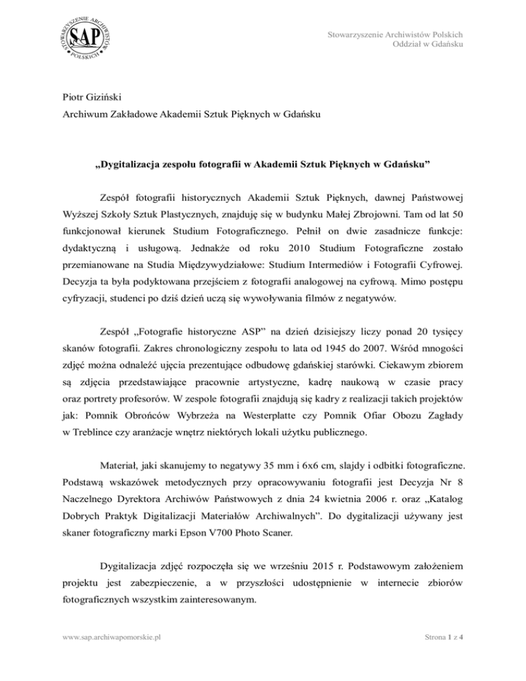 Stowarzyszenie Archiwistów Polskich Oddział w Gdańsku Piotr Giziński Archiwum Zakładowe Akademii Sztuk Pięknych w Gdańsku „Dygitalizacja zespołu fotografii w Akademii Sztuk Pięknych w Gdańsku” Zespół fotografii historycznych Akademii Sztuk Pięknych, dawnej Państwowej Wyższej Szkoły Sztuk Plastycznych, znajduję się w budynku Małej Zbrojowni. Tam od lat 50 funkcjonował kierunek Studium Fotograficznego. Pełnił on dwie zasadnicze funkcje: dydaktyczną i usługową. Jednakże od roku 2010 Studium Fotograficzne zostało przemianowane na Studia Międzywydziałowe: Studium Intermediów i Fotografii Cyfrowej. Decyzja ta była podyktowana przejściem z fotografii analogowej na cyfrową. Mimo postępu cyfryzacji, studenci po dziś dzień uczą się wywoływania filmów z negatywów. Zespół „Fotografie historyczne ASP” na dzień dzisiejszy liczy ponad 20 tysięcy skanów fotografii. Zakres chronologiczny zespołu to lata od 1945 do 2007. Wśród mnogości zdjęć można odnaleźć ujęcia prezentujące odbudowę gdańskiej starówki. Ciekawym zbiorem są zdjęcia przedstawiające pracownie artystyczne, kadrę naukową w czasie pracy oraz portrety profesorów. W zespole fotografii znajdują się kadry z realizacji takich projektów jak: Pomnik Obrońców Wybrzeża na Westerplatte czy Pomnik Ofiar Obozu Zagłady w Treblince czy aranżacje wnętrz niektórych lokali użytku publicznego. Materiał, jaki skanujemy to negatywy 35 mm i 6x6 cm, slajdy i odbitki fotograficzne. Podstawą wskazówek metodycznych przy opracowywaniu fotografii jest Decyzja Nr 8 Naczelnego Dyrektora Archiwów Państwowych z dnia 24 kwietnia 2006 r. oraz „Katalog Dobrych Praktyk Digitalizacji Materiałów Archiwalnych”. Do dygitalizacji używany jest skaner fotograficzny marki Epson V700 Photo Scaner. Dygitalizacja zdjęć rozpoczęła się we wrześniu 2015 r. Podstawowym założeniem projektu jest zabezpieczenie, a w przyszłości udostępnienie w internecie zbiorów fotograficznych wszystkim zainteresowanym. www.sap.archiwapomorskie.pl Strona 1 z 4 Stowarzyszenie Archiwistów Polskich Oddział w Gdańsku PRZECHOWYWANIE: Materiały fotograficzne, na jakich pracujemy, do niedawna były przechowywane w papierowych zakładkach w pudełku po papierze fotograficznym, a niektóre luzem włożone w koperty po starych filmach. Dziś negatywy są ułożone w specjalnych koszulkach pergaminowych, a następnie zostały wpięte w przeznaczone do tego segregatory. Negatywy są ułożone w porządku odpowiadającym układowi pozycji stykówek na karatach albumów. Kopie cyfrowe są przechowywane na dysku zewnętrznym oraz na płytach CD. Dodatkowo zeskanowane zdjęcia przesyłane są na wewnętrzny serwer uczelni. PROCES SKANOWANIA: Skanowanie materiałów archiwalnych zawsze rozpoczynamy od wyczyszczenia szyby skanera, następnie w bawełnianych rękawiczkach umieszczamy negatywy w specjalnych ramkach. Należy przy tym zwrócić uwagę, aby negatyw został włożony matową stroną do góry, w przeciwnym razie zeskanowane zdjęcie będzie odbiciem lustrzanym oryginału. Kolejną ważną rzeczą, jest zwrócenie uwagi, czy włożony negatyw leży sztywno w ramce, inaczej obraz zeskanowany może być nie ostry. Zanim klikniemy przycisk skanuj, ustawiamy jeszcze podstawowe parametry, jak rozdzielczość skanowania czy głębie kolorów. Zaczynając od tego ostatniego, to dla materiałów kolorowych przyjęto wartość 24 bit, natomiast dla czarno białych 16 bit. Rozdzielczość skanowanego materiału zależy w dużej mierze od przeznaczenia kopii. W naszym przypadku jest to zakres od 800 do 1200 dpi. Dzięki temu nasze zdjęcia są duże i wyraźne nawet przy dość mocnym przybliżeniu. Format zapisu plików to TIFF i JPG. Pliki o rozszerzeniu TIFF traktowane są jako kopie macierzyste, natomiast format JPG służy nam do dalszego udostępniania i ewentualnej edycji. Dopiero teraz możemy wykonać podgląd skanowanych materiałów. Na tym etapie jedynie co zrobimy to odznaczamy wszelkie kopie oraz nieudane zdjęcia. Następnie wybieramy folder zapisu i klikamy przycisk SKANUJ. Czas skanowania zależy od ilości klatek filmu jakie jednorazowo skanujemy, wielkości zdjęcia i rozszerzenia. Cały proces może trwać od minuty do nawet 10 minut. www.sap.archiwapomorskie.pl Strona 2 z 4 Stowarzyszenie Archiwistów Polskich Oddział w Gdańsku NAZWA PLIKU: Nazwa pliku składa się z cyfry rzymskiej, pod którą kryje się nazwa zbioru archiwalnego i jednocześnie jest to numer albumu, w którym znajduje się oryginalny negatyw, łamany na numer karty w albumie, na której znajduje się zdjęcie, łamane na numer kolejny danego zdjęcia. W tej chwili posiadamy dziewięć zbiorów archiwalnych, są to: I-III -> zdjęcia z lat 1950-1980, IV -> zdjęcia najstarsze od 1945 do około 1960, V -> kolekcja pt: Artyści Wybrzeża prezentująca przede wszystkim prace artystyczne pracowników szkoły, VI-IX są to zdjęcia kolorowe od 1991 do 2007. Każdy zbiór posiada swoje podzbiory (np.: inauguracje roku akademickiego, rady wydziałów, plenery, uroczystości, pracownie). Sygn. I/34/005 I – numer albumu 34 – numer karty w albumie 005 – numer kolejny zdjęcia OPRACOWANIE GRAFICZNE: Z biegiem lat niektóre negatywy zaczęły tracić swoje pierwotne właściwości, proces ten przekłada się na jakość skanowanych zdjęć. Dlatego też niektóre zdjęcia wymagały opracowania graficznego. Mam tu na myśli takie zabiegi jak: odświeżenie koloru, ustawienie kontrastu zdjęcia, rozjaśnianie i przyciemnianie, wypoziomowanie zdjęcia oraz lekki retusz. Służy nam do tego program graficzny AdobePhotoshop. KARTA INWENTARZOWA: Każde zdjęcie jest osobno opisywane w karcie inwentarzowej, na którą składa się osiem kolumn: sygnatura archiwalna, opis zdjęcia, czyli co przedstawione jest na fotografii wraz z identyfikacją osób, autor zdjęcia, przybliżony rok i miejsce wykonywanej fotografii, słowa kluczowe – tzw. 