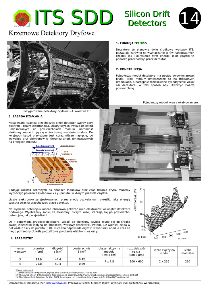 ITS SDD Silicon Drift Detectors 14 Krzemowe Detektory Dryfowe 1. FUNKCJA ITS SDD Detektory te stanowią dwie środkowe warstwy ITS, pozwalają zarówno na wyznaczanie torów naładowanych cząstek jak i określenie strat energii, jakie cząstki te ponoszą przechodząc przez detektor. 2. KONSTRUKCJA Pojedynczy moduł detektora ma postać dwuwymiarowej płytki, takie moduły umieszczone są na trójkątnych drabinkach, a następnie rozlokowane cylindrycznie wokół osi detektora, w taki sposób aby utworzyć zwartą powierzchnię. Pojedynczy moduł wraz z okablowaniem Przygotowane detektory dryfowe – 4. warstwa ITS 3. ZASADA DZIAŁANIA Naładowana cząstka przechodząc przez detektor tworzy pary elektron – dziura elektronowa. Dziury szybko trafiają do katod umieszczonych na powierzchniach modułu, natomiast elektrony koncentrują się w środkowej warstwie modułu. Do kolejnych katod przyłożone jest coraz niższe napięcie, co wywołuje dryf elektronów w kierunku anod, umieszczonych na brzegach modułu. Badając rozkład zebranych na anodach ładunków oraz czas trwania dryfu, możemy wyznaczyć położenie (składowe x i y) punktu, w którym przeszła cząstka. Liczba elektronów zarejestrowanych przez anody pozwala nam określić, jaką energię cząstka straciła przechodząc przez detektor. Na wykresie potencjału można obrazowo pokazać ruch elektronów wewnątrz detektora dryfowego. Wyobraźmy sobie, że elektrony, niczym kulki, staczają się po powierzchni potencjału, jak po zjeżdżalni. Oś x odpowiada grubości detektora, widać, że elektrony szybko zsuną się do środka swojej zjeżdżalni (spłyną do środkowej warstwy detektora). Potem, już wolniej, zjadą w dół wzdłuż osi y do punktu (0,0). Ruch ten odpowiada dryfowi w kierunku anod, a czas na niego potrzebny określa początkowe położenie elektronu na osi y. x 4. PARAMETRY numer warstwy promień r [cm] długość z [cm] powierzchnia S [m2] 3 14.9 44.4 0.42 4 23.8 59.4 0.89 obszar aktywny modułu [cm x cm] rozdzielczość rφ x z [μm x μm] liczba złączy na moduł liczba modułów 7 x 7.5 200 x 600 2 x 256 260 Więcej informacji: [1] Strona oficjalna http://www.physics.ohio-state.edu/~nilsen/ALICE_ITS/sdd.html [2] The ALICE silicon drift detectors: Production and assembly, http://www.roma1.infn.it/exp/alice/pdf/alice_silicon_drift.pdf [3] The Silicon Drift Detectors for the ALICE Experiment, M. I. Martínez, http://www.le.infn.it/ifae/PDF/Martinez.pdf Opracowanie: Tomasz Cetner ([email protected]), Pracownia Reakcji Ciężkich Jonów, Wydział Fizyki Politechniki Warszawskiej
