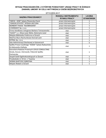 WYKAZ PRACODAWCÓW, Z KTÓRYMI POWIATOWY URZĄD PRACY W ŻORACH ZAWARŁ UMOWY W CELU AKTYWIZACJI OSÓB BEZROBOTNYCH STYCZEŃ 2017 NAZWA PRACODAWCY "ARCHI - KON" Sylwia Płoneczka-Parot "JENION ESTATES" SPÓŁKA AKCYJNA NORBERT PADOŁ "BUDBRADERS" U DORADCY Sp. z o.o. Firma Handlowo-Usługowa Barbara Tomaszewska "ALKAT" s.c. Alicja Lazar-Biela, Katarzyna Lazar Miejska Biblioteka Publiczna w Żorach MedTax Biuro Rachunkowe Konrad Lech EXTRAL Sp. z o.o. Izba Administracji Skarbowej w Katowicach Spółka Prawa Cywilnego "KAMA" Sylwia Radwańska & Aleksandra Kiełtyka Kancelaria Radców Prawnych LEXUS CONSULTING Gicala, Koczar, Ostrowski, Pokorski Spółka Partnerska Zespół Szkół Ogólnokształcących w Żorach Przedszkole nr 19 im. J. Tuwima WEBMI BARTOSZ CĘBRZYNA Miejski Żłobek w Żorach RODZAJ INSTRUMENTU RYNKU PRACY prace interwencyjne prace interwencyjne prace interwencyjne prace interwencyjne staż staż staż staż staż staż LICZBA STANOWISK 1 1 1 1 1 1 1 1 1 5 staż 1 staż 1 staż staż staż staż 1 1 1 1