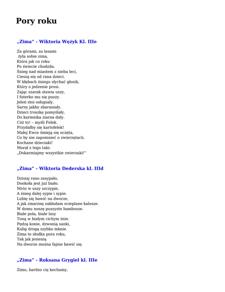 Pory roku „Zima” - Wiktoria Wężyk Kl. IIIe Za górami, za lasami żyła sobie zima, Która jak co roku Po świecie chodziła. Śnieg nad miastem z nieba leci, Cieszą się od rana dzieci. W kłębach śniegu słychać głosik, Który o jedzenie prosi. Zając szarak stawia uszy, I futerko mu się puszy. Jeleń stoi osłupiały, Sarny jakby zbaraniały. Dzieci troszkę pomyślały, Do karmnika ziarna dały. Cóż to! – myśli Felek. Przydałby się kartofelek! Małej Ewce śmieją się oczęta, Co by nie zapomnieć o zwierzętach. Kochane dzieciaki! Morał z tego taki: „Dokarmiajmy wszystkie zwierzaki!” „Zima” - Wiktoria Dederska kl. IIId Dzisiaj rano zasypało, Dookoła jest już biało. Mróz w uszy szczypie, A śnieg dalej sypie i sypie. Lubię się bawić na dworze, A jak zmarznę zakładam ocieplane kalosze. W domu noszę puszyste bambosze. Białe pola, białe lasy Toną w białym cichym śnie. Pędzą konie, dzwonią sanki, Kulig drogą szybko mknie. Zima to słodka pora roku, Tak jak jesienią Na dworze można fajnie bawić się. „Zima” - Roksana Grygiel kl. IIIe Zimo, bardzo cię kochamy, Lecz na sankach nie zjeżdżamy. Śniegu, daj nam choć troszeczkę. By ulepić choć gałeczkę. Nie leż zimo pod pierzynką, Sypnij nam choć odrobinką. Biały puch niech zleci z nieba, Wiele wcale nam nie trzeba. Niech pokryje pola, lasy, Całe miasta i tarasy. Niech nam sypnie biały puch, To saneczki pójdą w ruch. Dzięki zimo ukochana. Śnieżek sypie dziś od rana. Na saneczkach dzieci rój, I gałeczki poszły w bój. „Zima” - Patryk Kuśmierek Świat dookoła biały, Już nie taki kolorowy. Choć nie ma barw tęczy Niesie nastrój świąteczny. Zima, zima niby zła, Ale piękne chwile ma. „Zima” - Patryk Wysmyk kl.IId Ulepić bałwana Fajna sprawa. Bawmy się na śniegu Od samego rana. Ferie się zbliżają Niech śnieżki w górę latają „Wesoła zima” - Oliwia Bąkowicz kl Ig. Zima biała, śnieżna wszystko zasypała Dzieci są szczęśliwe skaczą jak piłeczki I lepią równiutkie śniegowe kuleczki W szkole też wesoło, dzisiaj nie ma lekcji Całą klasą pierwszą g. Z naszą panią Kasią Biegniemy na górkę razem bawić się "Wiosna" Anita Michalska, Weronika Mazerska, Ada Kowalska, Kasia Dąbrowska Przyszła wiosna, Piękna i radosna, Najpiękniejsza pora roku Zawitała nam w tym roku. Promykami słońca życie oświeciła, A golutkie drzewa pąkami ozdobiła. Wszystkie zwierzęta ze snu się wybudzają, A szczęśliwe ptaki ćwierkaniem nas witają. Pierwsze kwiaty już śnieg przebiły I początek wiosny nam umiliły. Kiedy mrozy już od nas odejdą, Ogrodnicy nasiona siać będą. "Wiosna" Mariola Pirek Wiosną wszystko budzi się ze snu, Mówi się nawet, że „jedna jaskółka wiosny nie czyni” Ale ona ją czyni, I czyni ją każdy kwiat, Każda zakwitła gałąź: Jabłoni, wiśni czy gruszy, Czyni ją także każde zwierzę i każdy ptak, Który wraca po zimie z ciepłych krajów, Wiosna to coś wspaniałego, To najpiękniejsza pora roku, Najpiękniejszy moment roku. "Wiosna" Agnieszka Frądczak Wiosna piękna i radosna Wszystko się zieleni A słońce mieni. Kwiatki kwitną W tej radości. Wiosna przyszła I radość tutaj niesie. "Pani Wiosna" Mariola Pirek Co można o niej powiedzieć? Jak można ją nazwać? Piękna pani, przywdziana płaszczem ziemi. Pani Wiosna? Piękny wielobarwny motyl, Kwiat przecudnie barwiony, Drzewo ze złocistej barwy, zielenią ubogacone. Do czego można ją porównać? Z czym może rywalizować? Jak można ją oceniać? Piękny ptak, który przyciąga spojrzenie, Niebiański zapach róż, lilii i fiołków, Rozkosz wywoływana każdym spojrzeniem. Czy to pani Wiosna? Czy to ona przynosi każdy płomyk słonka, Czy to ona wzbogaca roślinność? Czy ona budzi zwierzęta? Czy to jej zasługa? Tak to ona, pani Wiosna, W jej dłoniach ogromna moc spoczywa, Wiej spojrzeniu jasność nieba bywa. To ona dzień pochmurny zamienia w słońce, To ona puste drzewa okrywa liściem, To ona budzi niedźwiadka, To ona wypuszcza przebiśniegi, To naprawdę ona! Pamiętaj ! Co roku przychodzi 21 marca. "Przedwiośnie" Monika Niedzielska, Patrycja Gołdyn, Julita Śnioch Wiosna się zbliża wielkimi krokami, A zima odejdzie i będzie za nami. Dzieci się smucą, bo śnieg topnieje, Ponieważ słonko mocniej grzeje. Wiosna będzie wspaniałym gościem, Każdemu przyniesie wiele przyjemności. Kwiaty przyjdą razem z wiosną, Bo ten czas jest porą radosną. "Jesienne rozważania" Daria Fałek Przez cały chaos w moim życiu, zamknięta w sobie jestem, Patrzę na świat z ukrycia, zastanawiam się nad sensem życia. Spoglądam w oko - widzę jeśeń, szarą smugę na niebie, Złociste liście, i jest tak ponuro i mgliście. Można tak usiąść,tak poprostu, i zastanowić się,czy warto, Czy radzić sobie ze zmartwieniami, czy nadal walczyć z problemami. Listopadowy chłód przypomina oziębłość, oziębłość okazaną przez ludzi, Jesienne liście przypominają łzy, łzy potoki łez, które tłumiły gdzieś w sobie. Czasemsię łudzę - może będzie lepiej, czasem się pocieszam, lecz nie potrafię, Wytrącona z dawnej równowagi, dalej żyję marzeniami... "Jesienny spacer" Daria Fałek Idę chodnikiem jesienną porą, otchłań liści rozstępuje się jak Morze Czerwone, Słońce oblewa promieniami drzewa, Wrześniowy wiatr jeszcze powiewa, Tworzą się wiry złoto-brązowych płatków, Ptaki chcą uciec stąd, przed mrozem i chłodem, A ludzie siedzą tylko w domach, pracują, Czasem leżą w łóżkach, bo chorują, Piją napary, książki czytają, A ja tak idę chodnikiem jesienną porą, Podziwiam świat, pogrążona w swych myślach, Nie licząc lat. "Jesienna burza" Paulina Skalik Za oknami pada deszcz. Czy Ty widzisz też? Smutno i ponuro jest, Ale wystarczy jeden gest, I pomyśl, że ten jesienny deszcz to oranżada, Która z nieba spada. Że kałuża, to taka duża sadzawka, A w niej pływa mała ż