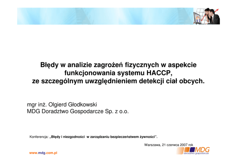 Błędy w analizie zagrożeń fizycznych w aspekcie funkcjonowania systemu HACCP, ze szczególnym uwzględnieniem detekcji ciał obcych. mgr inż. Olgierd Głodkowski MDG Doradztwo Gospodarcze Sp. z o.o. Konferencja: „Błędy i niezgodności w zarządzaniu bezpieczeństwem żywności”. Warszawa, 21 czerwca 2007 rok www.mdg.com.pl Konferencja: „Błędy i niezgodności w zarządzaniu bezpieczeństwem żywności”. Warszawa, 21 czerwca 2007 rok Definicje Zagrożenie – czynnik biologiczny, chemiczny, fizyczny w żywności lub warunek podczas jej produkcji, który potencjalnie może być niebezpieczny dla zdrowia. Zagrożenia fizyczne – to wszystkie substancje i materiały, które mogą spowodować fizyczne uszkodzenia u konsumenta (np. jamy ustnej, przełyku). Analiza zagrożeń – proces zbierania i oceniania informacji o zagrożeniach i warunkach prowadzących do ich powstania, mający na celu stwierdzenie, które z nich są istotne dla bezpieczeństwa żywności. www.mdg.com.pl Konferencja: „Błędy i niezgodności w zarządzaniu bezpieczeństwem żywności”. Warszawa, 21 czerwca 2007 rok Rodzaje zagrożeń www.mdg.com.pl Konferencja: „Błędy i niezgodności w zarządzaniu bezpieczeństwem żywności”. Warszawa, 21 czerwca 2007 rok Źródła zanieczyszczeń fizycznych Materiał Źródło - Szkło - butelki, słoiki, osłony oświetlenia, naczynia, osłony przyrządów pomiarowych, opakowania leków, termometry na halach produkcyjnych, - Drewno - palety skrzynie, środowisko, - Kamienie - środowisko, - Metal - maszyny, sprzęt, pracownicy, drut, opakowania, - Insekty - środowisko, - Izolacja - materiały budowlane, - Kości - niewłaściwy proces technologiczny, - Plastik - środowisko, pracownicy, materiały opakowaniowe, palety, - Taśmy elastyczne - pracownicy, materiał opakowaniowy, - Rzeczy pracowników - biżuteria, niedopałki papierosów, włosy, sznurki, papier, karton, www.mdg.com.pl Konferencja: „Błędy i niezgodności w zarządzaniu bezpieczeństwem żywności”. Warszawa, 21 czerwca 2007 rok Zapobieganie zagrożeniom fizycznym Sposoby zapanowania nad zagrożeniami fizycznymi: - Dobra Praktyka Produkcyjna. - Inwestycje w urządzenia do wykrywania i eliminowania zanieczyszczonych produktów z partii wyrobów gotowych. - Połączenie wyżej wymienionych. www.mdg.com.pl Konferencja: „Błędy i niezgodności w zarządzaniu bezpieczeństwem żywności”. Warszawa, 21 czerwca 2007 rok Zapobieganie zagrożeniom fizycznym Możliwości wykrywania i zapobiegania zanieczyszczeniom fizycznym Materiał / zanieczyszczenie www.mdg.com.pl Wspomaganie techniczne (wykrywacze) Dobra praktyka produkcyjna (zapobieganie) - Szkło TAK TAK - Drewno TAK TAK - Kamienie TAK TAK - Metal TAK TAK - Kości TAK TAK - Plastik, PVC TAK TAK Konferencja: „Błędy i niezgodności w zarządzaniu bezpieczeństwem żywności”. Warszawa, 21 czerwca 2007 rok Wykrywanie zanieczyszczeń fizycznych Innowacyjne metody wykrywania zanieczyszczeń fizycznych: System kontroli jakości produktów spożywczych na bazie X-ray. Opakowanie produktu to utrudnienia w wykrywaniu ciał obcych. Pomocna staje się metoda bazująca na promieniach rentgenowskich – tzw. system X-ray (por. bramki na lotniskach). Każdy system składa się ze źródła promieniowa (X-ray source) i kamery liniowej (X-ray line sensor). Zasada działania jest taka sama jak w skanerze. Przesuwany obiekt jest prześwietlany a obraz, za pomocą kamery liniowej, zapisywany w pamięci komputera, następnie analizowany lub analizowany w czasie rzeczywistym. Materiał pobrany i wykorzystany za zgodną firmy Mikromax Innovations Sp. z o.o. www.mikromax.com www.mdg.com.pl Konferencja: „Błędy i niezgodności w zarządzaniu bezpieczeństwem żywności”. Warszawa, 21 czerwca 2007 rok Wykrywanie zanieczyszczeń fizycznych Innowacyjne metody wykrywania zanieczyszczeń fizycznych: System kontroli jakości produktów spożywczych na bazie X-ray. System bazujący na X-ray obok detekcji ciał obcych może badać wiele innych własności takich jak np.: - wykrywanie metalu w produkcie i w opakowaniu, - wykrywanie kości w produkcie, - wykrywanie zanieczyszczeń PVC, teflon, plastik, - wykrywanie szkła / kamieni, - ilość produktów w opakowaniu i opakowaniach zbiorczych, - defekty opakowań – zdeformowanie produktu, - wagę produktów i jej odchylenie od normy, - ułożenie produktów w opakowaniu, - w owocach – znajdowanie miejsc zepsutych – odrzucanie odpadów, - defekt opakowania z metalowej folii. Materiał pobrany i wykorzystany za zgodną firmy Mikromax Innovations Sp. z o.o. www.mikromax.com www.mdg.com.pl Konferencja: „Błędy i niezgodności w zarządzaniu bezpieczeństwem żywności”. Warszawa, 21 czerwca 2007 rok Wykrywanie zanieczyszczeń fizycznych Innowacyjne metody wykrywania zanieczyszczeń fizycznych: System kontroli jakości produktów spożywczych na bazie X-ray – przykłady detekcji zanieczyszczeń. Słoik z kawałkami szkła Słoiki z wtrąceniami ciał obcych. Pierwsze z majonezem i kawałkami szkła. Druga z ogórkami ze szkłem, szpilką i kamieniami. Puszki z rybami. Wtrącenie opiłki metalu w pierwszej puszce. Tabliczka czekolady ze szpilkami, kamieniami i szkłem www.mdg.com.pl Paletka jogurtów z różnymi wtrąceniami i ilość kubeczków w paletce Materiał pobrany i wykorzystany za zgodną firmy Mikromax Innovations Sp. z o.o. www.mikromax.com Konferencja: „Błędy i niezgodności w zarządzaniu bezpieczeństwem żywności”. Warszawa, 21 czerwca 2007 rok Błędy w eliminowaniu zanieczyszczeń fizycznych Kłopoty z urządzeniami do wykrywania i eliminowania zanieczyszczeń fizycznych: - Brak zastosowania urządzeń, tam gdzie są wymagane. - Analiza zagrożeń HACCP, nie daje podstaw do rezygnacji ze stosowania urządzeń do wykrywania. - Nieprawidłowy dobór czułości urządzeń do wykrywania zanieczyszczeń fizycznych. - Brak zastosowania konfiskatora – eliminacja zanieczyszczonych pr