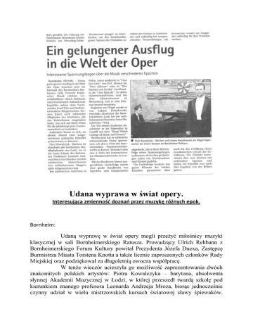 Udana wyprawa w świat opery. Interesująca zmienność doznao przez muzykę różnych epok. Bornheim: Udaną wyprawę w świat opery mogli przeżyć miłośnicy muzyki klasycznej w sali Bornheimerskiego Ratusza. Prowadzący Ulrich Rehbann z Bornheimerskiego Forum Kultury powitał Prezydenta Józefa Duexa, Zastępcę Burmistrza Miasta Torstena Knotta a także licznie zaproszonych członków Rady Miejskiej oraz podziękował za długoletnią owocna współpracę. W tenże wieczór ucieszyła go możliwość zaprezentowania dwóch znakomitych polskich artystów: Piotra Kowalczyka – barytona, absolwenta słynnej Akademii Muzycznej w Łodzi, w której przeszedł twardą szkołę pod kierunkiem znanego profesora Leonarda Andrzeja Mroza, biorąc jednocześnie czynny udział w wielu mistrzowskich kursach światowej sławy śpiewaków. Poprzez liczne występy w Polsce, między innymi jako Don Alfonso w ,,Cosi fan tutte” W. A. Mozarta czy Don Bartolo w ,,Cyruliku Sewilskim” G. Rossiniego, wiele spektakli operetkowych oraz mistrzowskim koncertem w Rheinsbergu udowodnił swój artyzm. Towarzyszący przy fortepianie Łukasz Kwiatkowski, także z Akademii Muzycznej w Łodzi ukończył studia w klasie światowej sławy pianistki Anny Wesołowskiej – Firlej. Część studiów odbył jako stypendysta w Cardiff w królewskim: „Royal Welsh College of Musik and Drama”. Zdobył dotąd także ważne nagrody: m.in. II miejsce na międzynarodowym konkursie fortepianowym w Koszycach na Słowacji czy IV nagrodę na międzynarodowym konkursie fortepianowym w Londynie. W wybranym na ten wieczór programie znalazły się pieśni z szerokiego spektrum epok i kompozytorów, które w odpowiedniej kolejności konstruowały zmienność doznań, osiągając kulminację wspaniałymi ariami Rachmaninova i Rossiniego. Dobór pieśni pozwolił na ukazanie całego kunsztu obu artystów, gwarantując publiczności muzyczną rozkosz pierwszej klasy. Na koniec, publiczność owacjami na stojąco nagrodziła artystów aplauzem, pozwalając im zejść ze sceny dopiero po trzykrotnym bisie. tłumaczenie: Wojciech Czechowski