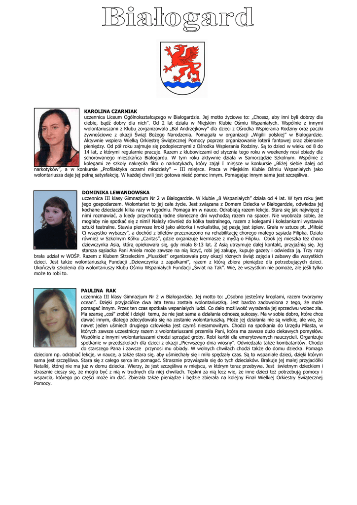 KAROLINA CZARNIAK uczennica Liceum Ogólnokształcącego w Białogardzie. Jej motto Ŝyciowe to: „Chcesz, aby inni byli dobrzy dla ciebie, bądź dobry dla nich”. Od 2 lat działa w Miejskim Klubie Ośmiu Wspaniałych. Wspólnie z innymi wolontariuszami z Klubu zorganizowała „Bal Andrzejkowy” dla dzieci z Ośrodka Wspierania Rodziny oraz paczki Ŝywnościowe z okazji Świąt BoŜego Narodzenia. Pomagała w organizacji „Wigilii polskiej” w Białogardzie. Aktywnie wspiera Wielką Orkiestrę Świątecznej Pomocy poprzez organizowanie loterii fantowej oraz zbieranie pieniędzy. Od pół roku zajmuje się podopiecznymi z Ośrodka Wspierania Rodziny. Są to dzieci w wieku od 8 do 14 lat, z którymi regularnie pracuje. Razem z klubowiczami od stycznia tego roku w weekendy nosi obiady dla schorowanego mieszkańca Białogardu. W tym roku aktywnie działa w Samorządzie Szkolnym. Wspólnie z kolegami ze szkoły nakręciła film o narkotykach, który zajął I miejsce w konkursie „BliŜej siebie dalej od narkotyków”, a w konkursie „Profilaktyka oczami młodzieŜy” – III miejsce. Praca w Miejskim Klubie Ośmiu Wspaniałych jako wolontariusza daje jej pełną satysfakcję. W kaŜdej chwili jest gotowa nieść pomoc innym. Pomagając innym sama jest szczęśliwa. DOMINIKA LEWANDOWSKA uczennica III klasy Gimnazjum Nr 2 w Białogardzie. W klubie „8 Wspaniałych” działa od 4 lat. W tym roku jest jego gospodarzem. Wolontariat to jej całe Ŝycie. Jest związana z Domem Dziecka w Białogardzie, odwiedza jej kochane dzieciaczki kilka razy w tygodniu. Pomaga im w nauce. Odrabiają razem lekcje. Stara się jak najwięcej z nimi rozmawiać, a kiedy przychodzą ładne słoneczne dni wychodzą razem na spacer. Nie wyobraŜa sobie, Ŝe mogłaby nie spotkać się z nimi! NaleŜy równieŜ do kółka teatralnego, razem z kolegami i koleŜankami wystawia sztuki teatralne. Stawia pierwsze kroki jako aktorka i wokalistka, jej pasją jest śpiew. Grała w sztuce pt. „Miłość Ci wszystko wybaczy”, a dochód z biletów przeznaczono na rehabilitację chorego małego sąsiada Filipka. Działa równieŜ w Szkolnym Kółku „Caritas”, gdzie organizuje kiermasze z myślą o Filipku. Obok jej mieszka teŜ chora dziewczynka Asia, którą opiekowała się, gdy miała 8-13 lat. Z Asią utrzymuje dalej kontakt, przyjaźnią się. Jej starsza sąsiadka Pani Aniela moŜe zawsze na nią liczyć, robi jej zakupy, kupuje gazety i odwiedza ją. Trzy razy brała udział w WOŚP. Razem z Klubem Strzeleckim „Muszkiet” organizowała przy okazji róŜnych świąt zajęcia i zabawy dla wszystkich dzieci. Jest takŜe wolontariuszką Fundacji „Dziewczynka z zapałkami”, razem z którą zbiera pieniądze dla potrzebujących dzieci. Ukończyła szkolenia dla wolontariuszy Klubu Ośmiu Wspaniałych Fundacji „Świat na Tak”. Wie, Ŝe wszystkim nie pomoŜe, ale jeśli tylko moŜe to robi to. PAULINA RAK uczennica III klasy Gimnazjum Nr 2 w Białogardzie. Jej motto to: „Osobno jesteśmy kroplami, razem tworzymy ocean”. Dzięki przyjaciółce dwa lata temu została wolontariuszką. Jest bardzo zadowolona z tego, Ŝe moŜe pomagać innym. Przez ten czas spotkała wspaniałych ludzi. Co dało moŜliwość wyraŜenia jej sprzeciwu wobec zła. Ma szansę „coś” zrobić i dzięki temu, Ŝe nie jest sama a działania odnoszą sukcesy. Ma w sobie dobro, które chce dawać innym, dlatego zdecydowała się na zostanie wolontariuszką. MoŜe jej działania nie są wielkie, ale wie, Ŝe nawet jeden uśmiech drugiego człowieka jest czymś niesamowitym. Chodzi na spotkania do Urzędu Miasta, w których zawsze uczestniczy razem z wolontariuszami przemiła Pani, która ma zawsze duŜo ciekawych pomysłów. Wspólnie z innymi wolontariuszami chodzi sprzątać groby. Robi kartki dla emerytowanych nauczycieli. Organizuje spotkanie w przedszkolach dla dzieci z okazji „Pierwszego dnia wiosny”. Odwiedzała takŜe kombatantów. Chodzi do starszego Pana i zawsze przynosi mu obiady. W wolnych chwilach chodzi takŜe do domu dziecka. Pomaga dzieciom np. odrabiać lekcje, w nauce, a takŜe stara się, aby uśmiechały się i miło spędzały czas. Są to wspaniałe dzieci, dzięki którym sama jest szczęśliwa. Stara się z całego serca im pomagać. Strasznie przywiązała się do tych dzieciaków. Brakuje jej małej przyjaciółki Natalki, której nie ma juŜ w domu dziecka. Wierzy, Ŝe jest szczęśliwa w miejscu, w którym teraz przebywa. Jest świetnym dzieckiem i strasznie cieszy się, Ŝe mogła być z nią w trudnych dla niej chwilach. Tęskni za nią lecz wie, Ŝe inne dzieci teŜ potrzebują pomocy i wsparcia, którego po części moŜe im dać. Zbierała takŜe pieniądze i będzie zbierała na kolejny Finał Wielkiej Orkiestry Świątecznej Pomocy.