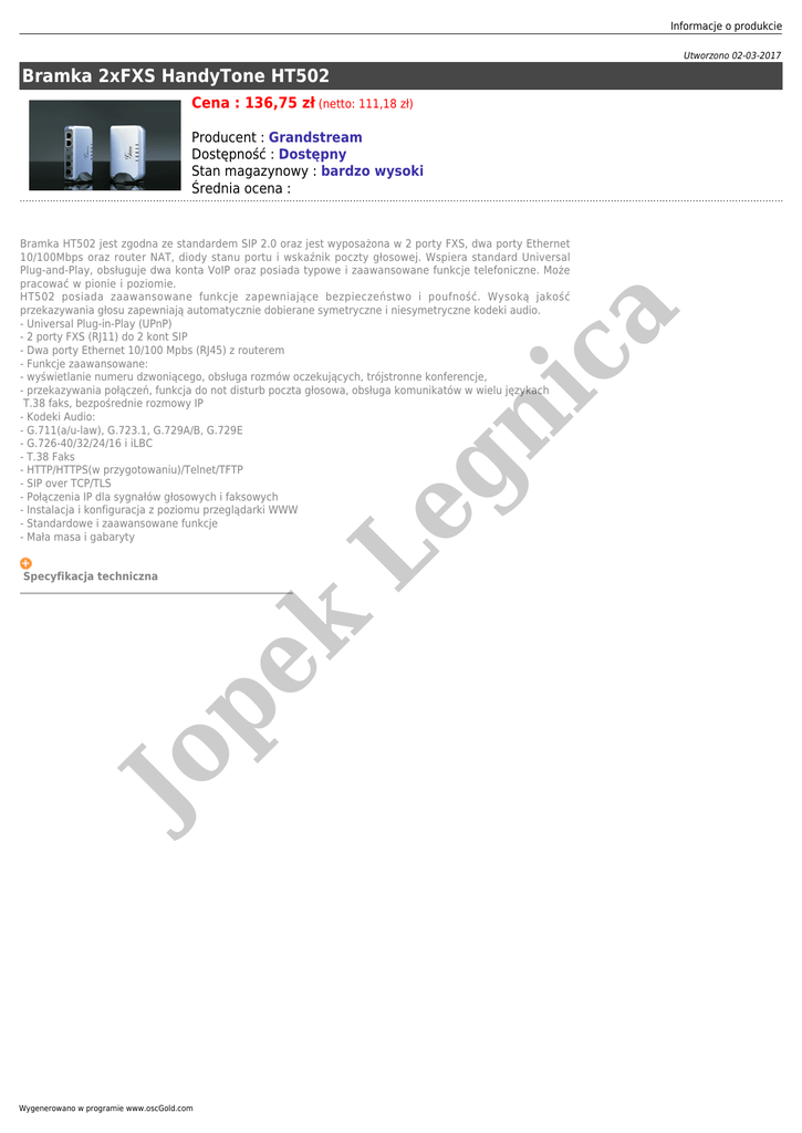 Informacje o produkcie Utworzono 02-03-2017 Bramka 2xFXS HandyTone HT502 Cena : 136,75 zł (netto: 111,18 zł) Producent : Grandstream Dostępność : Dostępny Stan magazynowy : bardzo wysoki Średnia ocena : Jo pe k Specyfikacja techniczna Le gn ic a Bramka HT502 jest zgodna ze standardem SIP 2.0 oraz jest wyposażona w 2 porty FXS, dwa porty Ethernet 10/100Mbps oraz router NAT, diody stanu portu i wskaźnik poczty głosowej. Wspiera standard Universal Plug-and-Play, obsługuje dwa konta VoIP oraz posiada typowe i zaawansowane funkcje telefoniczne. Może pracować w pionie i poziomie. HT502 posiada zaawansowane funkcje zapewniające bezpieczeństwo i poufność. Wysoką jakość przekazywania głosu zapewniają automatycznie dobierane symetryczne i niesymetryczne kodeki audio. - Universal Plug-in-Play (UPnP) - 2 porty FXS (RJ11) do 2 kont SIP - Dwa porty Ethernet 10/100 Mpbs (RJ45) z routerem - Funkcje zaawansowane: - wyświetlanie numeru dzwoniącego, obsługa rozmów oczekujących, trójstronne konferencje, - przekazywania połączeń, funkcja do not disturb poczta głosowa, obsługa komunikatów w wielu językach T.38 faks, bezpośrednie rozmowy IP - Kodeki Audio: - G.711(a/u-law), G.723.1, G.729A/B, G.729E - G.726-40/32/24/16 i iLBC - T.38 Faks - HTTP/HTTPS(w przygotowaniu)/Telnet/TFTP - SIP over TCP/TLS - Połączenia IP dla sygnałów głosowych i faksowych - Instalacja i konfiguracja z poziomu przeglądarki WWW - Standardowe i zaawansowane funkcje - Mała masa i gabaryty Wygenerowano w programie www.oscGold.com Jo pe k Le gn ic a - Port Ethernet: 2 RJ45 (LAN/WAN) - NAT/Router: Tak - DHCP: klient/Serwer - FXS Port: 2 - FXO Port: Brak - PSTN Pass-through Port: Brak - Wskaźnik poczty głosowej: Tak - Kodeki Audio: G.711(a/ulaw), iLBC, G.723, G.729A/B/E, G.726, T.38(fax) - Zdalna konfiguracje: TFTP/HTTP - Gniazdka telefoniczne: 2 porty FXS, 2 konta SIP - Gniazdka LAN/WAN: 2 10M/100 Mbps, RJ-45 - Wskaźniki LED: zasilanie, WAN, LAN, PHONE1 i PHONE2 - Reset: Przywracanie ustawień fabrycznych. - Zaawansowane funkcje VoIP: Voice Activity Detection (VAD) z CNG (comfort noise generation) i PLC (packet loss concealment), Dynamic Jitter Buffer, Modem detection & auto-switch to G.711, Packetized Voice Protocol Unit (supports RTP/RTCP and AAL2 protocol), G.168 compliant Echo Cancellation, LEC (line echo cancellation) with NLP Kodeki Audio: G.711 + Annex I (PLC), Annex II (VAD/CNG format) encoder and decoder, G.723.1A, G.726(ADPCM), G.729A/B/E, iLBC G.726 provides proprietary VAD, CNG, and signal power estimation Voice Play Out unit (reordering, fixed and adaptive jitter buffer, clock synchronization), AGC (automatic gain control), Status output, Decoder controlling via voice packet header - DHCP Serwer/klient: NAT Router lub Switched Mode Fax. over IP: T.38 compliant Group 3 Fax Relay up to 14.4kpbs and auto-switch to G.711 for Fax Pass-through (pending), Fax Datapump V.17, V.19, V.27ter, V.29 for T.38 fax relay - QoS: Diffserve, TOS, 802.1 P/Q VLAN tagging - IP Transport: RTP/RTCP - DTMF Method: Flexible DTMF transmission method, user interface of In-audio, RFC2833, and/or SIP Info - IP Signaling: SIP (RFC 3261) - Provisioning: TFTP, HTTP, HTTPS - Control: TLS/SIPS - Zarządzanie: Syslog support, HTTPS and telnet (pending), remote management using Web browser, Auto/manual provisioning system Support Layer 2 (802.1Q, VLAN, 802.1p), Layer 3 QoS (Tos, DiffSery, MPLS) - Zasilanie: Wy: 12VDC, 0.5A / We: 100-240 VAC/50-60 Hz - Warunki: - Pracy: 32°-104°F lub 0°-40°C - Przechowywania: 10°-130°F / wilgotność: 10-90% - Short & long haul: REN3: Up to150 ft on 24 AWG line - Call Handling Features: Caller ID display or block, Call waiting caller ID, Call waiting/flash, Call transfer, hold, forward, mute, 3-way conferencing - Caller ID: Bellcore Type 1 & 2, ETSI, BT, NTT, and DTMF-based CID Polarity Reversal / Wink: Yes - EMC: EN55022/EN55024 and FCC part15 Class B - Bezpieczeństwo: UL