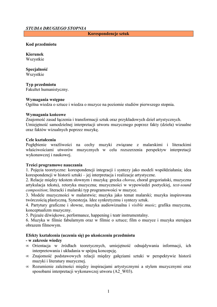 STUDIA DRUGIEGO STOPNIA Korespondencje sztuk Kod przedmiotu Kierunek Wszystkie Specjalność Wszystkie Typ przedmiotu Fakultet humanistyczny. Wymagania wstępne Ogólna wiedza o sztuce i wiedza o muzyce na poziomie studiów pierwszego stopnia. Wymagania końcowe Znajomość zasad łączenia i transformacji sztuk oraz przykładowych dzieł artystycznych. Umiejętność samodzielnej interpretacji utworu muzycznego poprzez fakty (dzieła) wizualne oraz faktów wizualnych poprzez muzykę. Cele kształcenia Pogłębienie wrażliwości na cechy muzyki związane z malarskimi i literackimi właściwościami utworów muzycznych w celu rozszerzenia perspektyw interpretacji wykonawczej i naukowej. Treści programowe nauczania 1. Pojęcia teoretyczne: korespondencji integracji i syntezy jako modeli współdziałania; idea korespondencji w historii sztuki – jej interpretacja i realizacje artystyczne. 2. Relacje między tekstem słownym i muzyką: grecka chorea, chorał gregoriański, muzyczna artykulacja tekstu), retoryka muzyczna; muzyczności w wypowiedzi poetyckiej, text-sound composition; literacki i malarski typ programowości w muzyce. 3. Modele muzyczności w malarstwie; muzyka jako temat malarski; muzyka inspirowana twórczością plastyczną. Synestezja. Idee synkretyzmu i syntezy sztuk. 4. Partytury graficzne i słowne, muzyka audiowizualna i visible music; grafika muzyczna, konceptualizm muzyczny. 5. Pejzaże dźwiękowe, performance, happening i teatr instrumentalny. 6. Muzyka w filmie fabularnym oraz w filmie o sztuce; film o muzyce i muzyka sterująca obrazem filmowym. Efekty kształcenia (uczenia się) po ukończeniu przedmiotu - w zakresie wiedzy • Orientacja w źródłach teoretycznych, umiejętność odnajdywania informacji, ich interpretowania i układania w spójną koncepcję. • Znajomość podstawowych relacji między gałęziami sztuki w perspektywie historii muzyki i literatury muzycznej. • Rozumienie zależności między inspiracjami artystycznymi a stylem muzycznymi oraz sposobami interpretacji wykonawczej utworu (A2_W03). 1 - w zakresie umiejętności • Zdolność interpretacji utworu muzycznego w kategoriach artystycznych pozamuzycznych oraz przełożenia na muzykę struktur artystycznych z innych dziedzin sztuki. • Umiejętność nazywania i opisywania "duchowej" treści utworu muzycznego i wartości estetycznych muzyki (A2_U06). - w zakresie kompetencji społecznych • Umiejętność wykorzystywania informacji dot. Inspiracji i intencji twórczych w celu realizacji własnej koncepcji interpretacyjnej i zamierzonego oddziaływania na odbiorcę. • Umiejętność samooceny własnych działań ich komentowania i prezentacji (A2_K02; A2_K04, A2_K05). Metody nauczania Wykład – prezentacja poszczególnych zagadnień estetycznych, ich ilustracja przykładami z historii sztuki i analiza wybranych przykładów z dziedziny sztuk synkretycznych, poezji i kompozycji muzycznych. Nakład pracy studenta potrzebny do osiągnięcia efektów uczenia się ROK SEMESTR Na dowolnym roku Punkty ECTS Ilość godzin w semestrze Rodzaj zaliczenia LEGENDA 1 2 2 2 30 30 zal zs zal – zaliczony; zs – zaliczenie ze stopniem; egz – egzamin; ed – egzamin dyplomowy Kryteria oceny 1. Kwestionariusz sprawdzający wiedzę o relacjach między gałęziami sztuki oraz test umiejętności ich rozpoznawania w wybranych przykładach i opisu analitycznego. 2. Interpretacja plastyczna wybranego materiału muzycznego: znalezienie lub samodzielne stworzenie ekwiwalentu wizualnego wraz z uzasadnieniem interpretacji. 3. Interpretacja muzyczna wybranej próbki sztuk wizualnych. Za każde wykonane zadanie student otrzymuje od 1 do 7 punktów. Literatura (piśmiennictwo) Kowalczykowa Alina [1980] O wzajemnym oświetlaniu się sztuk w romantyzmie. [w:] Pogranicza i korespondencje sztuk. red. T. Cieślikowska, J. Sławiński, Wrocław. Polony Leszek [1981] Program literacki i symbolika muzyczna w twórczości symfonicznej Karłowicza [w:] Muzyka polska a modernizm, Kraków. Rzepińska Maria [1989] Historia koloru w dziejach malarstwa europejskiego, Warszawa,. Starzyński Juliusz [1965] O romantycznej syntezie sztuk. Dalecroix, Chopin, Baudelaire, Warszawa. Szerszenowicz Jacek [2008] Inspiracje plastyczne w muzyce, Łódź. Język wykładowy Polski 2 Imię i nazwisko wykładowcy dr hab. Jacek Szerszenowicz 3