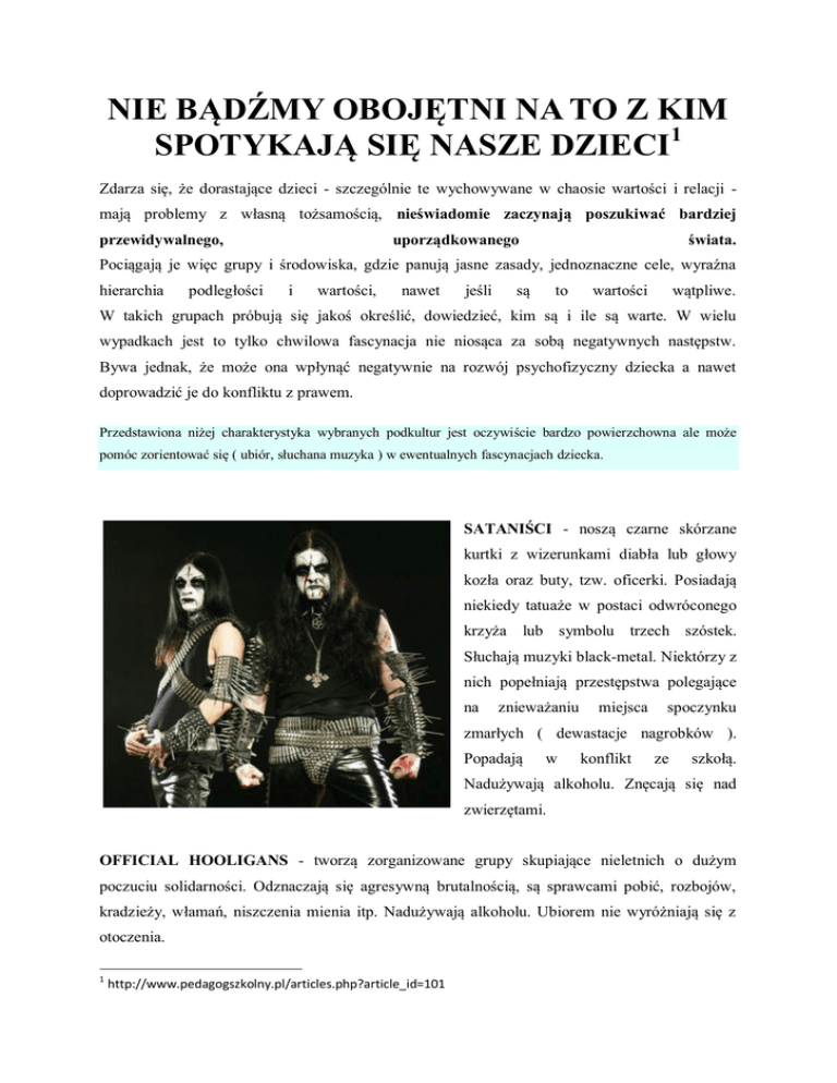 NIE BĄDŹMY OBOJĘTNI NA TO Z KIM SPOTYKAJĄ SIĘ NASZE DZIECI1 Zdarza się, że dorastające dzieci - szczególnie te wychowywane w chaosie wartości i relacji mają problemy z własną tożsamością, nieświadomie zaczynają poszukiwać bardziej przewidywalnego, uporządkowanego świata. Pociągają je więc grupy i środowiska, gdzie panują jasne zasady, jednoznaczne cele, wyraźna hierarchia podległości i wartości, nawet jeśli są to wartości wątpliwe. W takich grupach próbują się jakoś określić, dowiedzieć, kim są i ile są warte. W wielu wypadkach jest to tylko chwilowa fascynacja nie niosąca za sobą negatywnych następstw. Bywa jednak, że może ona wpłynąć negatywnie na rozwój psychofizyczny dziecka a nawet doprowadzić je do konfliktu z prawem. Przedstawiona niżej charakterystyka wybranych podkultur jest oczywiście bardzo powierzchowna ale może pomóc zorientować się ( ubiór, słuchana muzyka ) w ewentualnych fascynacjach dziecka. SATANIŚCI - noszą czarne skórzane kurtki z wizerunkami diabła lub głowy kozła oraz buty, tzw. oficerki. Posiadają niekiedy tatuaże w postaci odwróconego krzyża lub symbolu trzech szóstek. Słuchają muzyki black-metal. Niektórzy z nich popełniają przestępstwa polegające na znieważaniu miejsca spoczynku zmarłych ( dewastacje nagrobków ). Popadają w konflikt ze szkołą. Nadużywają alkoholu. Znęcają się nad zwierzętami. OFFICIAL HOOLIGANS - tworzą zorganizowane grupy skupiające nieletnich o dużym poczuciu solidarności. Odznaczają się agresywną brutalnością, są sprawcami pobić, rozbojów, kradzieży, włamań, niszczenia mienia itp. Nadużywają alkoholu. Ubiorem nie wyróżniają się z otoczenia. 1 http://www.pedagogszkolny.pl/articles.php?article_id=101 HEAVY METALOWCY - słuchają ciężkiej, posępnej, apokaliptycznej muzyki. Wyróżniają ich skórzane kurtki, na które zakładają dżinsowe kamizelki z nazwami zespołów. Noszą długie włosy, wszelkiego rodzaju wisiorki, niklowane łańcuszki, kolczyki. Spotykają się na koncertach zespołów rockowych. Bywają sprawcami czynów chuligańskich. Prowokują bójki. SZALIKOWCY - noszą koszulki i szaliki w barwach klubów sportowych, których są fanatycznymi zwolennikami. Niektórzy z nich ( pseudokibice ) są sprawcami dewastacji mienia w czasie meczów oraz w czasie podróży (bicie pasażerów, demolowanie pociągów, autobusów). Dokonują kradzieży i wymuszeń rozbójniczych. Nadużywają alkoholu. HIPPISI - (rozkwit ruchu w latach 60.) noszą długie włosy, luźne bluzy lub koszule flanelowe, dżinsy, adidasy oraz ozdoby w postaci koralików lub pacyfek. Do szczególnie niebezpiecznych zjawisk towarzyszących ruchowi hippisowskiemu w Polsce należą m.in.: negowanie obowiązku szkolnego, używanie i dystrybucja narkotyków i innych środków odurzających oraz dokonywanie na tym tle przestępstw, tj. włamań do aptek, hurtowni leków, kradzieży i podrabiania recept. ROCKERSI - pasjonują sią motocyklami. Ubierają się w czarne, skórzane kurtki lub kamizelki i skórzane buty. Na kurtkach noszą naszywki: SS, War, Werhmacht. Noszą opaski podtrzymujące długie włosy. Często naruszają przepisy ruchu drogowego. PUNKI - noszą czarne skórzane kurtki z licznymi napisami, zniszczone dżinsowe spodnie, ciężkie buty – „glany”, skórzane pasy z ćwiekami "pieszczochy", w uszach okrągłe kolczyki. Włosy podgalają na bokach głowy, najczęściej zaczesując je w tzw. irokeza. Występują przeciwko wszystkim instytucjom, które ich zdaniem ograniczają wolność i niezależność człowieka: rząd i jego aparat przymusu – policja i wojsko, zorganizowana religia, środki masowego przekazu, wielkie korporacje itp. Bywa to przyczyną wchodzenia w konflikt z obowiązującymi normami prawnymi. SKINHEDZI - strzygą włosy na krótko lub zupełnie golą głowy, noszą kurtki tzw. "flayersy" dwustronne - czarne i pomarańczowe, podczas bójki (zadymy) przekładane na jaskrawą stroną, wysokie, ciężkie buty z kolorowymi sznurowadłami. Często prezentują postawą agresji, nietolerancji o podłożu nacjonalistycznym. Są sprawcami rozbojów, pobić, a nawet zabójstw. Dokonują kradzieży i dewastacji mienia. EMO - Styl ubierania emo charakteryzuje się noszeniem dżinsów rurek zarówno przez dziewczyny, jak chłopców, długie ukośne grzywki zaczesane na jedną połowę twarzy, na jedno lub oboje oczu, oczy zarysowane czarną kredką (obie płcie) z reguły czarne, proste włosy, wąskie t-shirty często z nazwami zespołów rockowych, paski nabijane ćwiekami ( najczęściej czarnobiała szachownica ), opaski na nadgarstki, materiałowe tenisówki lub inne buty ( często stare i zniszczone ); jeżeli noszą okulary, to „muszą” mieć one grube, czarne oprawki. Ludzie emo są postrzegani jako melodramatyczni, nastolatkowie, piszący depresyjną poezję. Współcześnie emo zostało nazwane "smutną karykaturą" tego, czym było kiedyś (reakcją na agresywny i materialistyczny styl życia amerykańskich raperów ). Niektórzy oskarżają emo o promowanie samookaleczeń i samobójstw. DRESIARZE - noszą krótkie włosy oraz dresy i ubrania znanychj marek np. ”Adidas", "Nike". Często uprawiają jakiś sport ( koszykówką, piłką nożną itp.). Nie stronią od „zadym, dość często wiążą się z gangami. TECHNO i RAVE'OWCY - słuchają rytmicznej, jednostajnej muzyki. Ubierają się jaskrawo z elementami świecącymi w ultrafiolecie, im ich strój jest bardziej szokujący, tym lepiej. Są to głównie licealiści i studenci. GRAFICIARZE - miłośnicy tej sztuki to najczęściej uczniowie szkół plastycznych lub słuchacze hip-hopu i techno. Malują mury domów, szkół, wiadukty, wagony PKP. SKATEOWCY - miłośnicy deskorolek i rolek. Noszą długie, szerokie, nisko opuszczone spodnie z krokiem w kolanach oraz za dużą bluzą, przeważnie z kapturem. Ogólnie są pozytywnie nastawieni do świata. Ideologi