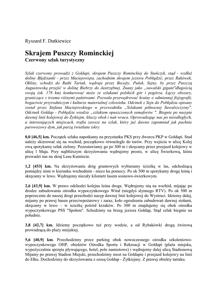 Ryszard F. Dutkiewicz Skrajem Puszczy Rominckiej Czerwony szlak turystyczny Szlak czerwony prowadzi z Gołdapi, skrajem Puszczy Rominckiej do Stańczyk, stąd - wzdłuż doliny Bfędzianki - przez Maciejowięta, zachodnim skrajem jeziora Pobłądzić, przez Rakówek, Okliny, schodzi do Rutki Tartak, wędruje przez Becejty, Puńsk, Sejny, by przez Puszczą Augustowską przejść w dolinę Biebrzy do Jastrzębnej. Znany jako „suwalski gigant"długością swoją (ok. 178 km) konkurować może ze szlakami polskich gór i pogórza. Łączy obszary, graniczące z trzema różnymi państwami. Pozwala przewędrować krainy o odmiennej fizjografii, bogactwie przyrodniczym i kulturze materialnej człowieka. Odcinek z Sejn do Pobłędzia opisany został przez Stefana Maciejewskiego w przewodniku „Szlakami północnej Suwalszczyzny". Odcinek Gołdap - Pobłędzie wiedzie „szlakiem opuszczonych semaforów ". Biegnie po nasypie dawnej linii kolejowej do Żytkiejm, kluczy obok i nań wraca. Oprowadzając nas po nieodległych, a interesujących miejscach, trafia zawsze na szlak, który już dawno zapomniał jak pachnie parowozowy dym, jak parzą świetlane iskry. 0,0 [46,5] km. Początek szlaku napotkamy na przystanku PKS przy dworcu PKP w Gołdapi. Stad należy skierować się na wschód, początkowo równolegle do torów. Przy wejściu w ulicę Kolej ową spotykamy szlak zielony. Pozostawiamy go po 300 m i skręcamy przez przejazd kolejowy w ulicę l Maja. Przy najbliższym skrzyżowaniu wędrujemy prosto, w ulicę Świerkową, która prowadzi nas na skraj Lasu Kumiecie. 1,2 [453] km. Na skrzyżowaniu dróg gruntowych wybieramy ścieżkę w las, odchodzącą pomiędzy nimi w kierunku wschodnim - nieco ku pomocy. Po ok 500 m spotykamy drogę leśną i skręcamy w lewo. Wędrujemy niecały kilometr lasem sosnowo-świerkowym. 2,6 [43,9] km. W prawo odchodzi kolejna leśna droga. Wędrujemy nią na wschód, mijając po drodze zabudowania ośrodka wypoczynkowego Witał (niegdyś słynnego RTV). Po ok 500 m poprzecznie do naszej drogi przechodzi nasyp dawnej linii kolejowej do Wystruci. Idziemy dalej, mijamy po prawej basen przeciwpożarowy i zaraz, koło ogrodzenia zabudowań dawnej stołami, skręcamy w lewo – w ścieżkę pośród krzaków. Po 300 m znajdujemy się obok ośrodka wypoczynkowego PSS "Społem". Schodzimy na brzeg jeziora Gołdap, Stąd szlak biegnie na południe. 3,8 [42,7] km. Idziemy początkowo tuż przy wodzie, a od Rybakówki drogą żwirową prowadzącą do plaży miejskiej. 5,6 [40,9] km. Przechodzimy przez parking obok nowoczesnego ośrodka szkoleniowowypoczynkowego OHP, obiektów Ośrodka Sportu i Rekreacji w Gołdapi (plaża miejska, wypożyczalnia sprzętu pływającego, hotel, pole namiotowe) i wędrujemy dalej ulicą Stadionową Mijamy po prawej Stadion Miejski, przechodzimy most na Gołdapie i przejazd kolejowy na linii do Ełku. Dochodzimy do skrzyżowania z szosą Gołdap - Żytkiejmy. Z prawej obiekty tartaku. 6,8 [39,7] km. Spotykamy tu znów szlak zielony, z którym powędrujemy szosą przez najbliższe 2,5 km. Kierujemy się na wschód. Po mniej więcej kilometrze, z prawej strony odsłania się widok na obniżenie ku południowi. W prawo odchodzi droga do gospodarstwa rolnego w Botkunach i pobliskiej wsi Kolniszki, gdzie znajdują się ślady dawnego grodziska. Idziemy prosto pod górę, by po chwili dojść do wiaduktu kolejowego - biegnącej cały czas po lewej - linii kolejowej. 9,1 [37,4] km. Tuż za wiaduktem skręcamy w prawo, pozostawiając szlak zielony biegnący dalej na północ. Brukową, w dość kiepskim stanie, drogą przechodzimy przez skład drewna, by po kolejnych 300 m dojść do granicy lasu. Leśną drogą wędrujemy prawie dwa kilometry i dochodzimy do kolejnego wiaduktu, tym razem na nieczynnym już odcinku linii kolejowej do Żytkiejm. Skręcamy w lewo tuż przed nim, wchodzimy na nasyp, i po ok. 200 m dochodzimy do zespołu dwóch mostów kolejowych na Jarce. Przerzucone są one przez dolinę niewielkiej tu rzeki, na wysokości 15 m. Nie są tak wielkie jak dużo słynniejsze w Stańczykach, niemniej robią wrażenie. Jeszcze 900 m wzdłuż nasypu, porośniętego po obu stronach mieszanym drzewostanem. Dochodzimy do małej polanki z lewej strony, przez którą biegnie licha, wyboista droga polna. Idziemy nią, by po kilometrze dotrzeć do szosy Gołdap - Żytkiejmy we wsi Galwiecie. 13,6 [32,9] km. Przekraczamy szosę obok przystanku PKS i wędrujemy prosto obok osiedla. Po około 250 m pozostawiamy z prawej strome zejście do dawnego pałacu w Galwieciach (obecnie zakład rolny), i po kolejnych 130 m dochodzimy do skrzyżowania przy wadze samochodowej. Tu skręcamy w lewo i zakreślamy półkilometrowy łuk na północ ku wschodowi), aby obejść tereny zakładu rolnego. Po kolejnych 100 m stajemy na skrzyżowaniu polnych dróg, gdzie kierujemy się w lewo pod górkę. 14,2 [32,3] km. Wędrujemy piaszczystą drogą, dochodząc do rozwidlenia wśród pól i zabudowań osady Czamówko (15,5 km). Tu kierujemy się w prawo, i drogąw kierunku Pluszkiejm, dochodzimy do nasypu kolejowego, który opuściliśmy przed Galwieciami. Skręcamy w lewo i mając po prawej zabudowania wsi i szosę, obchodzimy Pluszkiejmy od północy. Wędrując tak l,5 km dochodzimy do resztek zabudowań stacji kolejowej w Budwieciach. Wchodzimy na szosę, która prowadzi do osady leśnej Boczki. Za nami po prawej wiadukt ponad linią kolejową, przed nami rozległe obniżenie, w którym rozsiadły się zabudowania wsi Budwiecie. Po 1400 m dochodzimy do rozwidlenia. W lewo dalej biegnie szosa, w prawo lokalna droga, obchodząca od zachodu rozległe wyniesienie morenowe, kierująca się do Rogajn. 20,2 [26,3] km. Idziemy prosto na wschód starą, bardzo rozjeżdżoną drogą. Droga wprowadza nas w Puszczę - wyraźnie na wschód. Trakt, którym wędrujemy jest miejscami mocno porośnięty trawami i krzewami. Mimo to, łatwo utrzymać kierunek, bowiem droga jest szeroka 