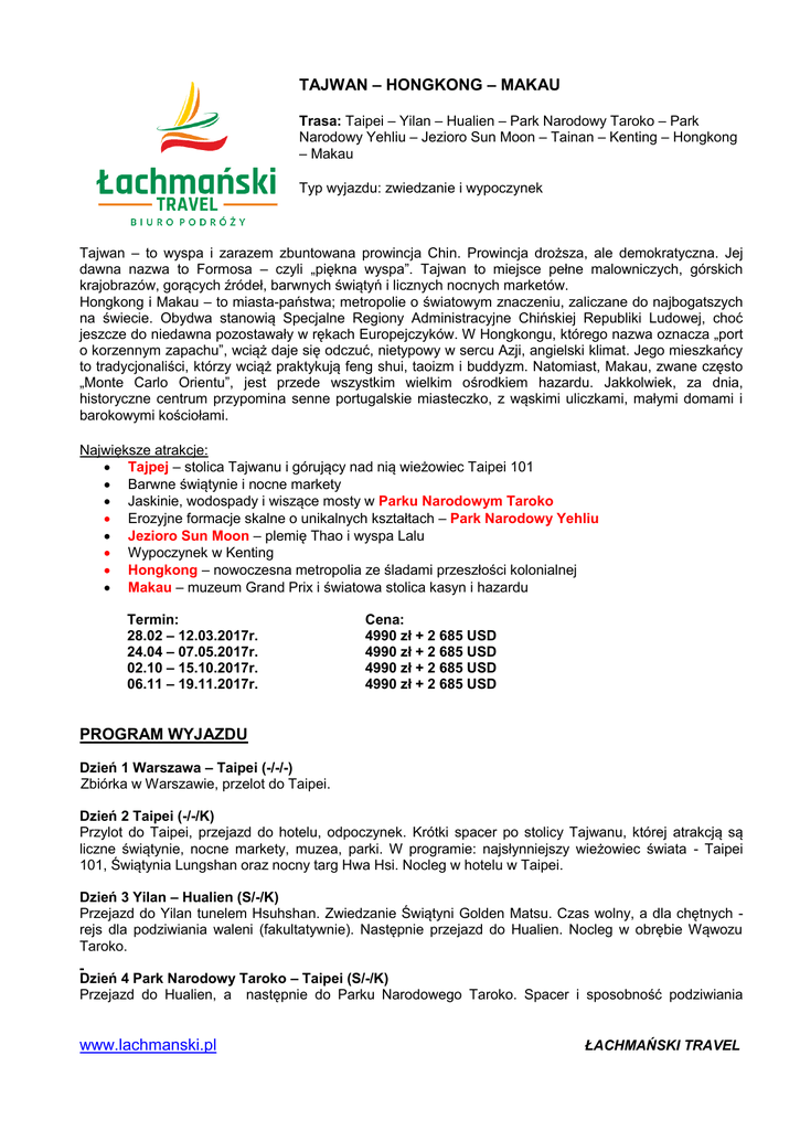 TAJWAN – HONGKONG – MAKAU Trasa: Taipei – Yilan – Hualien – Park Narodowy Taroko – Park Narodowy Yehliu – Jezioro Sun Moon – Tainan – Kenting – Hongkong – Makau Typ wyjazdu: zwiedzanie i wypoczynek Tajwan – to wyspa i zarazem zbuntowana prowincja Chin. Prowincja droższa, ale demokratyczna. Jej dawna nazwa to Formosa – czyli „piękna wyspa”. Tajwan to miejsce pełne malowniczych, górskich krajobrazów, gorących źródeł, barwnych świątyń i licznych nocnych marketów. Hongkong i Makau – to miasta-państwa; metropolie o światowym znaczeniu, zaliczane do najbogatszych na świecie. Obydwa stanowią Specjalne Regiony Administracyjne Chińskiej Republiki Ludowej, choć jeszcze do niedawna pozostawały w rękach Europejczyków. W Hongkongu, którego nazwa oznacza „port o korzennym zapachu”, wciąż daje się odczuć, nietypowy w sercu Azji, angielski klimat. Jego mieszkańcy to tradycjonaliści, którzy wciąż praktykują feng shui, taoizm i buddyzm. Natomiast, Makau, zwane często „Monte Carlo Orientu”, jest przede wszystkim wielkim ośrodkiem hazardu. Jakkolwiek, za dnia, historyczne centrum przypomina senne portugalskie miasteczko, z wąskimi uliczkami, małymi domami i barokowymi kościołami. Największe atrakcje: Tajpej – stolica Tajwanu i górujący nad nią wieżowiec Taipei 101 Barwne świątynie i nocne markety Jaskinie, wodospady i wiszące mosty w Parku Narodowym Taroko Erozyjne formacje skalne o unikalnych kształtach – Park Narodowy Yehliu Jezioro Sun Moon – plemię Thao i wyspa Lalu Wypoczynek w Kenting Hongkong – nowoczesna metropolia ze śladami przeszłości kolonialnej Makau – muzeum Grand Prix i światowa stolica kasyn i hazardu Termin: 28.02 – 12.03.2017r. 24.04 – 07.05.2017r. 02.10 – 15.10.2017r. 06.11 – 19.11.2017r. Cena: 4990 zł + 2 685 USD 4990 zł + 2 685 USD 4990 zł + 2 685 USD 4990 zł + 2 685 USD PROGRAM WYJAZDU Dzień 1 Warszawa – Taipei (-/-/-) Zbiórka w Warszawie, przelot do Taipei. Dzień 2 Taipei (-/-/K) Przylot do Taipei, przejazd do hotelu, odpoczynek. Krótki spacer po stolicy Tajwanu, której atrakcją są liczne świątynie, nocne markety, muzea, parki. W programie: najsłynniejszy wieżowiec świata - Taipei 101, Świątynia Lungshan oraz nocny targ Hwa Hsi. Nocleg w hotelu w Taipei. Dzień 3 Yilan – Hualien (S/-/K) Przejazd do Yilan tunelem Hsuhshan. Zwiedzanie Świątyni Golden Matsu. Czas wolny, a dla chętnych rejs dla podziwiania waleni (fakultatywnie). Następnie przejazd do Hualien. Nocleg w obrębie Wąwozu Taroko. Dzień 4 Park Narodowy Taroko – Taipei (S/-/K) Przejazd do Hualien, a następnie do Parku Narodowego Taroko. Spacer i sposobność podziwiania www.lachmanski.pl ŁACHMAŃSKI TRAVEL wspaniałych, zapierających dech widoków skalistych, górskich wąwozów - z wodospadami, jaskiniami i klifami. Wizyta w Świątyni Changchun (Wiecznej Wiosny). Powrót do Taipei. Nocleg w hotelu w Taipei. Dzień 5 Park Narodowy Yehliu – Taipei (S/-/K) Przejazd do Parku Narodowego Yehliu, gdzie można podziwiać różnorodność formacji skalnych, które przybrały unikalne kształty na skutek procesu erozji. Powrót do Taipei i dalsze zwiedzanie stolicy. W programie: Świątynia Martyrs, Memoriał Chiang Kai Shek, Muzeum Pałac Narodowy oraz nocny targ Shihlin. Nocleg w hotelu w Taipei. Dzień 6 Jezioro Sun Moon (S/-/K) Przejazd nad Jezioro Sun Moon. Rejs dookoła Wyspy Lalu, zwiedzanie Świątyni Wen Wu oraz Pagody Tse-En i Świątyni Świętego Mnicha. Nocleg w hotelu w okolicy Jeziora Sun Moon. Dzień 7 Tainan – Kenting (S/-/K) Przejazd do Tainan, miasta świątyń, których jest tu ponad 200. Jedne - tętniące życiem i zatłoczone, inne - uśpione, jakby zapomniane. Dominują buddyjskie, ale są też taoistyczne i konfucjańskie. Przed niektórymi stoją stragany, na których można kupić składane w ofierze owoce, kadzidełka czy tzw. Pieniądze Duchów, następnie spalane... Wycieczka po mieście – zobaczymy najważniejsze atrakcje, jak: Złoty Zamek Yi Tzai, Muzeum-Świątynię Koxinga oraz Kompleks Klasztorny Fo Guang Shan w Kaohsiung. Po zakończeniu programu - przejazd do Kenting. Zakwaterowanie. Nocleg w hotelu w Kenting. Dzień 8 Kenting (S/-/K) Czas wolny na odpoczynek i rekreację. Nocleg w hotelu w Kenting. Dzień 9 Kenting – Hong Kong (S/-/K) Transfer na lotnisko, przelot do Hong Kongu, metropolii będącej jeszcze kilka lat temu kolonią brytyjską, miejsca legendarnego dziś cudu gospodarczego i zarazem skansenu starego chińskiego folkloru. Transfer do hotelu, odpoczynek. Wieczorem krótka wycieczka do Alei Gwiazd. Kolacja w lokalnej restauracji. Nocleg w Hong Kongu. Dzień 10 Hong Kong (S/-/K) Zwiedzanie Hong Kongu. W programie: Chuk Lam Sim Yuen, Świątynia w Lam Tsuen i Złota Plaża. Odkryjemy bajecznie kolorowe, tętniące życiem i folklorem uliczki miasta, półwysep Kowloon od strony wody. Wizyta w Zatoce Repulse oraz w wiosce rybackiej Aberdeen. W programie również: Chi Lin Nunnery i Kompleks Ogrodów Nan Lian, Kowloon Walled City Park, Ulica Tung Choi oraz Ptasi Ogród . Kolacja w lokalnej restauracji. Nocleg w Hong Kongu. Dzień 11 Hong Kong (S/-/K) Dalsze zwiedzanie Hong Kongu. W programie: Plac Golden Bauhinia, słynne drapacze chmur z punktu widokowego na szczycie Victorii, skąd rozpościera się wspaniały widok na miasto i zatokę, Plaża Repulse; zatrzymamy się również na słynnym Stanley Market. Po południu czas wolny na indywidualną eksplorację miasta. Kolacja w lokalnej restauracji. Nocleg w Hong Kongu. Dzień 12 Hong Kong – Makau (S/-/K) Transfer do przystani promowej, następnie rejs szybkim promem do Makau, niewielkiej enklawy na terytorium Chin, przy ujściu rzeki Czu-ciang do Morza Południowochińskiego. Makau przez prawie 450 lat znajdowało się pod zarządem Portugalii i ciągle stanowi doskonałą mieszankę kultury Wschodu i Zachodu. Zwiedzanie Makau. W programie: Świątynia Bogini Mórz, Świątynia Królowej