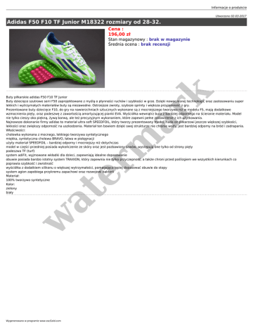 Informacje o produkcie Utworzono 02-03-2017 Adidas F50 F10 TF Junior M18322 rozmiary od 28-32. Cena : 196,00 zł er m ar k Stan magazynowy : brak w magazynie Średnia ocena : brak recenzji w at Buty piłkarskie adidas F50 F10 TF Junior Buty dziecięce szutrowe serii F50 zaprojektowane z myślą o płynności ruchów i szybkości w grze. Dzięki nowoczesnej technologii, oraz zastosowaniu super lekkich i wytrzymałych materiałów buty są niezawodne. Ostrzejsze zwroty, szybsze sprinty i większa przyjemność z gry. Prezentowane buty dziecięce F10, do gry na nawierzchniach sztucznych wykonane są z mocniejszego tworzywa niż w modelu F5, mają dodatkowe wzmocnienia pięty, oraz podeszwę z zawartością amortyzującej pianki EVA. Wyściółka wewnątrz buta z bardziej odpornego na ścieranie materiału. Model nie tylko cieszy oko piękną, żywą barwą, ale też precyzyjnym wykonaniem, które zapewni pełne zadowolenie z ich użytkowania. Najnowsze dokonanie firmy adidas to materiał ultra soft SPEEDFOIL, który tworzy prezentowany model, nada on piłkarzowi jeszcze większej szybkości, lekkości oraz zwiększy odporność na uszkodzenia. Materiał ten bowiem dzięki swej strukturze nie chłonie wody, jest bardziej odporny na bród i zadrapania. Właściwości: cholewka wykonana z mocnego, lekkiego tworzywa syntetycznego miękka, syntetyczna cholewa BRAVO, łatwa w pielęgnacji użyty materiał SPEEDFOIL – bardziej odporny i mocniejszy niż dotychczas model w części przedniej posiada wykończenie ze skóry oraz jest pozbawiony szwów, występują one tylko od strony pięty podeszwa TF (turf) system adiFit, wyjmowane wkładki dla dzieci, zapewniają idealne dopasowanie obuwie posiada bardzo istotny system TRAXION, który zapewnia nie tylko przyczepność, a także chroni przed poślizgiem we wszystkich kierunkach co poprawia szybkość i zwrotność wyściółka z dodatkiem silikonu o większej wytrzymałości, pomagająca lepiej dopasować obuwie do stopy system agion zapobiega przykremu zapachowi oraz rozwojowi bakterii Materiał: 100% tworzywo syntetyczne Kolor: zielony biały Wygenerowano w programie www.oscGold.com