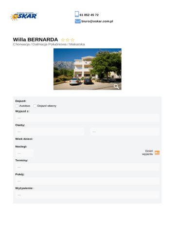 61 852 45 72 [email protected] Willa BERNARDA Chorwacja / Dalmacja Południowa / Makarska Dojazd: Autobus Dojazd własny Wyjazd z: Osoby: Wiek dzieci: Noclegi: Dzień wyjazdu Terminy: Pokój: Wyżywienie: Najtańsza oferta Styczniowe Rabaty zniżka 20% cena katalogowa do 5 marca 2017: 1714,00 zł do 5 marca 2017: 514,20 zł do 7 września 2017: 0,00 zł do 7 września 2017: 1199,80 zł Suma: 1714,00 zł Suma: 1714,00 zł Opis oferty Miejscowość Atuty Wycieczki aneksy kuchenne we wszystkich studiach/apartamentach fakultatywne sympatyczni właściciele taras/balkon we wszystkich studiach/apartamentach Opinie 600 metrów do plaży przyjazny dla rodzin z dziećmi Położenie Kameralny pensjonat usytuowany w willowej dzielnicy Zelenka, oddalony około 600 m od morza. Sympatyczni właściciele tworzą rodzinną atmosferę podczas pobytu, która sprawia, że więzi kulturowe między Polską a Chorwacją zacieśniają się. Zakwaterowanie Studia dwuosobowe z łazienkami, składające się z sypialni oraz pokoju dziennego, w którym znajduje się TV, aneks kuchenny z lodówką. Studia trzyosobowe z łazienkami składają się z pokoju, połączonego z aneksem kuchennym z lodówką. W studio znajduję się TV. Studia posiadają na piętrze ogólnodostępny taras lub balkon, klimatyzacja - opcjonalna dopłata na miejscu w wysokości 8 euro/dzień/studio. Apartamenty w systemie 2+2, 2+3 lub 2+2+2 z łazienkami, składają się z dwóch oddzielnych sypialni oraz pokoju dziennego z aneksem kuchennym i lodówką. Oferta szczególnie polecana dla rodzin z dziećmi. Wszystkie apartamenty, poza jednym - usytuowanym na parterze budynku mają swój balkon lub taras. W każdym z apartamentów znajduje się TV, klimatyzacja - opcjonalna dopłata na miejscu w wysokości 8 euro/dzień/apartament. Brak możliwości dokwaterowania - rezerwacje dla jednej osoby wymagają wykupienia pokoju jednoosobowego. Dostępne opcje zakwaterowania studio 2 osobowe studio 3 osobowe aparatment 4 osobowy [2+2] apartament 4-6 osobowy [2+2+2] dokwaterowanie (brak możliwości) / studio 1 osobowe (dopłata) Dostępne opcje wyżywienia we własnym zakresie śniadania obiadokolacje śniadania i obiadokolacje możliwość wykupienia wyżywienie na miejscu u rezydenta w cenie 14 euro/dzień/os/pakiet HB minimalny pakiet na 6 dni Pakiet KOMFORT gwarancja wyboru miejsca w autokarze napoje w autokarze w cenie (6 x do wyboru: kawa, herbata, zimny napój 0,2l) cena: 50 zł/os Pakiet PRESTIGE gwarancja wyboru miejsca w autokarze napoje w autokarze w cenie (6 x do wyboru: kawa, herbata, zimny napój 0,2l) pierwszeństwo wejścia na pokład autokaru nadbagaż 5 kg w cenie suchy prowiant na drogę powrotną cena: 100 zł/os Opieka / Animacje dla dzieci Opieka nad dzieckiem połączona z animacją czasu wolnego prowadzona przez osobę posiadającą odpowiednie kwalifikacje oraz uprawnienia. Możliwość wykupienia na miejscu u rezydenta pakietów opieki / animacji dla dzieci wg wybranej opcji dla dzieci w wieku od 3 do 12 lat: - 3 dniowy pakiet dzienny w cenie 20 euro; zajęcia to plażowanie oraz gry zespołowe (siatkówka plażowa, piłka nożna plażowa, podchody itd.); obowiązuje w godz. 10:00 - 17:00; deklaracja u rezydenta na miejscu i rezerwacja 3 wybranych dni, którymi ma być objęty pakiet opiekuńczo/animacyjny - 1 dniowy pakiet wieczorny w cenie 15 euro; zajęcia dostosowywane do wieku i liczby osób; obowiązuje w godz. 20-00 - 24-00; deklaracja u rezydenta na miejscu i rezerwacja wybranego dnia oferta obowiązuje w miesiącach lipiec i sierpień Karta Dużej Rodziny www.oskar.com.pl/zalaczniki/karta_duzej_rodziny Warunki promocji FIRST MINUTE www.oskar.com.pl/zalaczniki/warunki_promocji Ubezpieczenie Warunki ubezpieczenia Bezpieczne Podróże Signal Iduna dokument do pobrania www.oskar.com.pl/zalaczniki/owu Warunki ubezpieczenia Kosztów Imprezy Turystycznej Signal Iduna dokument do pobrania www.oskar.com.pl/zalaczniki/owurg Turystyczny Fundusz Gwarancyjny W związku z powołaniem do życia w dniu 26.11.2016 Turystycznego Funduszu Gwarancyjnego każdy klient Biura Podróży Oskar zobowiązany jest do zapłaty kwoty w wysokości 10zł/os. przy każdorazowej rezerwacji imprezy turystycznej (obowiązuje od dnia 26.11.2016). Kwota przeznaczona na Turystyczny Fundusz Gwarancyjny zostanie automatycznie doliczona do wartości rezerwacji (w momencie jej dokonania). Wyjątkiem są imprezy turystyczne odbywające się w krajach posiadających granicę z Rzeczpospolitą Polską. Składka nie jest przychodem biura. cena obejmuje przejazd autokarem klasy LUX (klimatyzacja, cafe - bar, DVD, WC) zakwaterowanie: 7 noclegów w Willi BERNARDA opiekę pilota w czasie podróży opieka rezydenta na miejscu oferta obejmuje sprzątanie początkowe i końcowe; w czasie pobytu sprzątanie we własnym zakresie wyżywienie wg wybranej opcji ubezpieczenie KL 10000 euro, NNW 10000 zł, bagaż (utrata 500 zł) Udogodnienia Klimatyzacja Animacje dla dzieci Regulowane fotele Tacki Nowoczesna flota Zawodowy kierowca Pasy bezpieczeństwa Toaleta w autokarze Podnóżki Dla rodzin z dziećmi Wi-Fi Lodówka AGD RTV Bez paszportu Spokojna okolica Region nadmorski Program ramowy Dzień 1 Wyjazd z Polski zgodnie z rozkładem jazdy autokarów. Przejazd przez Czechy, Słowację, Węgry. Dzień 2 Przyjazd do Makarskiej w godzinach przedpołudniowych. Czas wolny. Zakwaterowanie od godz. 12:00. Dzień 3-8 Pobyt na miejscu. Możliwość korzystania z dodatkowych wycieczek fakultatywnych, np. Dubrownik, Split i Trogir, Park Narodowy Krka, Jeziora Plitvickie, Medugorije + Mostar, Rejs statkiem na Hvar i Brac - Fish Picnic, Park Przyrody Biokovo. Dzień 9 Wykwaterowanie do godziny 09:00. Czas wolny. Wyjazd do Polski w godzinach popołudniowych (ok. godz. 15:00). Przejazd przez Węgry, Słowację, Czechy. Dzień 10 Przyjazd do Polski. Orientacyjne godziny powrotu do poszczególnych miast zgodnie z rozkładem jazdy autokarów. Cena nie obejmuje Dopłaty wymagane na miejscu opła