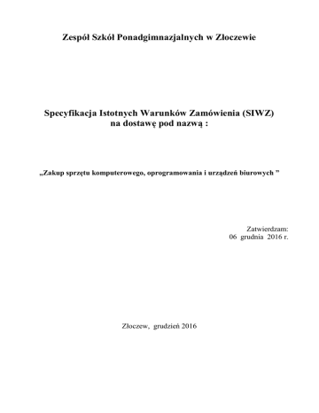 Zespół Szkół Ponadgimnazjalnych w Złoczewie Specyfikacja Istotnych Warunków Zamówienia (SIWZ) na dostawę pod nazwą : „Zakup sprzętu komputerowego, oprogramowania i urządzeń biurowych ” Zatwierdzam: 06 grudnia 2016 r. Złoczew, grudzień 2016 Specyfikacja Istotnych Warunków Zamówienia zawiera: Tom I: INSTRUKCJA DLA WYKONAWCÓW WRAZ Z FORMULARZAMI Rozdział 1 Instrukcja dla Wykonawców Rozdział 2 Formularz Oferty i Formularze załączników do Oferty: Formularz 2.1. Oferta Formularz 2.2. Formularz Zgodności Oferowanego sprzętu dla Zadania I Rozdział 3 Formularze dotyczące wiarygodności Wykonawcy: Formularz 3.1. Oświadczenie Wykonawcy dotyczące spełniania warunków udziału w postępowaniu określonych w art. 25a ust. 1 ustawy Prawo zamówień publicznych. Formularz 3.2. Oświadczenie Wykonawcy dotyczące przesłanek wykluczenia z postępowania określonych w art. 25a ust. 1 ustawy Prawo zamówień publicznych. Formularz 3.3. Wykaz dostaw. Formularz 3.4. Oświadczenie Wykonawcy o przynależności do grupy kapitałowej Tom I INSTRUKCJA DLA WYKONAWCÓW WRAZ Z FORMULARZAMI 1. ZAMAWIAJĄCY Zespół Szkół Ponadgimnazjalnych w Złoczewie ul. Szeroka 1/7 98-270 Złoczew tel. 043 820 22 12 fax.043 820 20 35 e-mail: [email protected] adres strony internetowej: http://www.zspzloczew.weebly.com Godziny urzędowania: od 7.30 do 15.30. 2. OZNACZENIE POSTĘPOWANIA Postępowanie, którego dotyczy niniejszy dokument oznaczone jest znakiem: ZSP /EFS-1/2016 Wykonawcy winni we wszelkich kontaktach z Zamawiającym powoływać się na wyżej podane oznaczenie. 3. TRYB UDZIELENIA ZAMÓWIENIA 3.1. Postępowanie o udzielenie zamówienia prowadzone jest w trybie przetargu nieograniczonego na podstawie ustawy z dnia 29 stycznia 2004 roku Prawo zamówień publicznych (tekst jednolity Dz. U. z 2015 roku, poz. 2164 ze zm.). Ilekroć w niniejszej SIWZ użyte jest pojęcie „ustawa Pzp”, należy przez to rozumieć ustawę Prawo zamówień publicznych, o której mowa w pkt 3.1. 3.2. 4. ŹRÓDŁA FINANSOWANIA Zamówienie współfinansowane jest ze środków EFS w ramach RPO Województwa Łódzkiego na lata 2014-2020 5. OPIS PRZEDMIOTU ZAMÓWIENIA 5.1. Przedmiotem zamówienia jest dostawa: a) 30 sztuk komputerów klasy PC z systemem operacyjnym b) 30 sztuk monitorów c) 30 sztuk Pakiet Microsoft Office Professional Plus 2013 na komputer PC –wersja EDUd) 7 licencji oprogramowania Windows Server Standard 2012 R2 e) 15 licencji oprogramowania Adobe Photoshop CS 6 f) 2 sztuki projektor multimedialny z różnymi portami komunikacji g) 2 sztuki Drukarka laserowa czarno-biała h) 2 sztuki skaner i) 1 sztuka Aparat fotograficzny j) 1 sztuka Niszczarka k) 1 sztuka Bindownica Zgodnie z wymaganiami zawartymi poniżej : 30 sztuk komputerów klasy PC wraz z oprogramowaniem lub równoważnych Specyfikacja ( nie mniej niż): Procesor: Intel Core i5-6400 (4 rdzenie, od 2.70 GHz do 3.30 GHz, 6 MB cache) Pamięć RAM: 16 GB (DIMM DDR4, 2133 MHz) (Maksymalna obsługiwana ilość pamięci RAM: 64 GB) Karta graficzna : Intel HD Graphics 530 Dysk twardy: nie mniej niż Express Cache 8 GB 1000 GB SATA 7200 obr. Wbudowane napędy optyczne : Nagrywarka DVD+/-RW DualLayer Dźwięk : Zintegrowana karta dźwiękowa zgodna z Intel High Definition Audio Łączność: Wi-Fi 802.11 b/g/n/ac, Bluetooth, LAN 10/100/1000 Mbps Rodzaje wejść / wyjść (nie mniej niż) -, Wyjście słuchawkowe - 1 szt. Wejście mikrofonowe 1 szt. - 1 szt. Czytnik kart pamięci - 1 szt. USB 3.1 Gen. 1 (USB 3.0) - 2 szt. szt. RJ-45 (LAN) - 1 szt. HDMI - 1 szt. VGA (D-sub) - 1 szt. Zasilacz 400 W System operacyjny: Windows 10 w wersji Professional licencja OEM -64bit lub Windows 7 w wersji Professional licencja OEM -64 bit Dołączone akcesoria: Klawiatura przewodowa , Mysz przewodowa , Kabel zasilający, Kabel HDMI , Gwarancja 24 miesiące (gwarancja producenta) 30 sztuk monitorów Specyfikacja ( nie mniej niż) : Przekątna ekranu: 21,5" , Powłoka matrycy: Matowa, Rodzaj matrycy :LED, IPS, Rozdzielczość ekranu: 1920 x 1080 (FullHD), Format ekranu:16:9 Jasność :250 cd/m², Kontrast dynamiczny : 5 000 000:1, Kąt widzenia w poziomie: 178 stopni, Kąt widzenia w pionie: 178 stopni, Czas reakcji :5 ms , Liczba wyświetlanych kolorów :16,7 mln Rodzaje wejść / wyjść DC-in (wejście zasilania) - 1 szt. DVI-D - 1 szt. HDMI - 1 szt, VGA (D-sub) - 1 szt. Dołączone akcesoria: Kabel zasilający, Kabel VGA Gwarancja 24 miesiące (gwarancja producenta) 30 sztuk Pakiet Microsoft Office Professional Plus 2013 na komputer PC –wersja EDU 7 licencji oprogramowania Windows Server Standard 2012 R2 z nośnikiem i kluczem produktu 15 licencji oprogramowania Adobe Photoshop CS 6 z nośnikiem i kluczem produktu 2 sztuki projektor multimedialny z różnymi portami komunikacji Specyfikacja ( nie mniej niż) Full HD, HD Ready, Rozdzielczość podstawowa: HD 1080p (1920x1080), Rozdzielczość maksymalna: UXGA (1600x1200) Porty/złącza wejścia/wyjścia: D-Sub – 2 szt, RCA (video) 1 szt, S-Video, HDMI 1 szt, stereo mini Jack , Composite video RCA Cinch - 1 szt, Wejście audio RCA Cinch - 1 szt. Gniazdo RS-232 - 1 szt. Gniazdo USB typ B 1 szt. Głośniki : 1x10Watt Technologia:DLP Jasność:3000 ANSI lumen Moc lampy:210W Żywotność lampy (normal) minimum: 4500 h Żywotność lampy (econo) minimum : 6500 h Kontrast : 10000 :1 Format obrazu (standard) :16:9 Korekcja pionowa:+,-40 Stopni Min. wielkość obrazu :45 cale Maks. wielkość obrazu : 300 cale Wejście audio RCA Cinch (ilość) 1 szt. Gwarancja na projektor 36 mies Gwarancja na lampę 12 miesięcy lub równoważny 2 sztuki Drukarka laserowa czarno-biała Specyfikacja ( nie mniej niż) Monochromatyczna drukarka dla formatu A4 Szybkość: Do 40stron na minutę dla formatu A4 Rozdzielczość: nie mniej niż 1,200 dpi Czas nagrzewania: nie więcej niż 15 sekund na minutę lub mniej od chwili włączenia zasilania Pamięć: Standard 256 MB RAM, max. 1,280 MB RAM Drukowanie dwustronne obsługujące kart