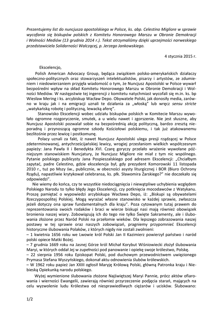 Prezentujemy list do nuncjusza apostolskiego w Polsce, ks. abp. Celestino Migliore w sprawie wycofania się biskupów polskich z Komitetu Honorowego Marszu w Obronie Demokracji i Wolności Mediów (13 grudnia 2014 r.). Tekst otrzymaliśmy dzięki uprzejmości norweskiego przedstawiciela Solidarności Walczącej, p. Jerzego Jankowskiego. 4 stycznia 2015 r. Ekscelencjo, Polish American Advocacy Group, będąca związkiem polsko-amerykańskich działaczy społeczno-politycznych oraz stowarzyszeń intelektualistów, pisarzy i artystów, ze zdumieniem i niedowierzaniem przyjęła wiadomość o tym, że Nuncjusz Apostolski w Polsce wywarł bezpośredni wpływ na skład Komitetu Honorowego Marszu w Obronie Demokracji i Wolności Mediów. W następstwie tej ingerencji z komitetu natychmiast wycofali się m.in. ks. bp Wiesław Mering i ks. arcybiskup Wacław Depo. Obywatele Polski, jak donosiły media, zarówno w kraju jak i na emigracji uznali te działania za „włoską” lub wręcz sensu stricte „watykańską robotę i polityczną, lewacką aferę”. Stanowisko Ekscelencji wobec udziału biskupów polskich w Komitecie Marszu wywołało ogromne rozgoryczenie, smutek, a u wielu nawet i zgorszenie. Nie jest słuszne, aby Nuncjusz Apostolski pozwalał sobie na bezpośrednią akcję polityczną, bardzo zresztą nieporadną i przynoszącą ogromne szkody Kościołowi polskiemu, i tak już atakowanemu bezlitośnie przez lewicę i postkomunę. Polacy uznali za fakt, iż nawet Nuncjusz Apostolski ulega presji rządzącej w Polsce zdeterminowanej, antychrześcijańskiej lewicy, wrogiej przesłaniom wielkich współczesnym papieży: Jana Pawła II i Benedykta XVI. Czarę goryczy przelało wrażenie wywołane późniejszym stanowiskiem Nuncjatury, że Nuncjusz Migliore nie miał z tym nic wspólnego. Pytanie polskiego publicysty Jana Pospieszalskiego pod adresem Ekscelencji: „Chciałbym zapytać, padre Celestino, gdzie ekscelencja był, gdy prezydent Komorowski 11 listopada 2010 r., tuż po Mszy św., publicznie, w obecności asysty liturgicznej i BOR (Biuro Ochrony Rządu), napastliwie krytykował celebransa, ks. płk. Sławomira Żarskiego?” nie doczekało się odpowiedzi”. Nie wiemy do końca, czy te wszystkie niedociągnięcia i niewątpliwe uchybienia względem Polskiego Narodu to tylko błędy Jego Ekscelencji, czy potknięcia mocodawców z Watykanu. Proszę pamiętać o wypowiedzi arcybiskupa Wacława Depo, iż: „Biskupi są obywatelami Rzeczypospolitej Polskiej. Mogą wyrażać własne stanowisko w każdej sprawie, zwłaszcza jeżeli dotyczy ona spraw fundamentalnych dla kraju”. Poza cytowanym tutaj prawem do reprezentowania swoich rodaków i braci w wierze biskupi nasi mają również obowiązek bronienia naszej wiary. Zobowiązują ich do tego nie tylko Święte Sakramenty, ale i ślubowania złożone przez Naród Polski na przełomie wieków. Dla lepszego zobrazowania naszej postawy w tej sprawie oraz naszych zobowiązań, pragniemy przypomnieć Ekscelencji historyczne ślubowania Polaków, z których nigdy nie zostali zwolnieni: – 1 kwietnia 1656 roku we Lwowie król Polski Jan II Kazimierz powierzył państwo i naród polski opiece Matki Bożej. – 7 grudnia 1669 roku na Jasnej Górze król Michał Korybut Wiśniowiecki złożył ślubowania Maryi, w których oddał Jej w zupełności pod panowanie i opiekę swoje królestwo, Polskę. – 22 sierpnia 1956 roku Episkopat Polski, pod duchowym przewodnictwem uwięzionego Prymasa Stefana Wyszyńskiego, dokonał aktu odnowienia ślubów królewskich. – W 1962 roku papież Jan XXIII ogłosił Maryję Królową Polski, główną Patronka kraju i Niebieską Opiekunką narodu polskiego. Wyżej wymienione ślubowania złożone Najświętszej Maryi Pannie, prócz aktów ofiarowania i wierności Ewangelii, zawierają również przyrzeczenie podjęcia starań, mających na celu wyzwolenie ludu Królestwa od niesprawiedliwych ciężarów i ucisków. Ślubowano: 1/2 „Przyrzekamy uczynić wszystko, co leży w naszej mocy, aby Polska była rzeczywistym Królestwem Twoim i Twojego Syna, poddanym całkowicie pod Twoje panowanie w życiu naszym osobistym, rodzinnym, narodowym i społecznym” oraz: „Oddani Tobie w niewolę pragniemy czynić w naszym życiu osobistym, rodzinnym, społecznym i narodowym nie wolę własną, ale wolę Twoją i Twojego Syna” Śluby zobowiązują Polaków również do: 1. Przekazania nienaruszonego skarbu wiary nadchodzącym pokoleniom, 2. Wychowania młodego pokolenia w wierności Chrystusowej, 3. Obrony młodego pokolenia przed bezbożnictwem i zepsuciem. Jak więc w obliczu wywołanej przez Ekscelencję sytuacji ocenić ostatnie zachowanie zarówno Jego Ekscelencji, jak i naszego Episkopatu w stosunku do wizji Polski jako Królestwa Maryi? Dla Polaków katolików stało się oczywiste i znamienne, że odbierając naszym biskupom prawo głosu w obronie naszej wiary, Ekscelencja jawnie i z premedytacją poparł dążenia do zmienienia naszej ojczyzny w państwo niemoralne i ateistyczne. Zdecydowana większość polskojęzycznych mediów jest antykatolicka i pogańska. Często obraża się w nich nie tylko katolików, ale i Najświętszą Marię Pannę i Jezusa Chrystusa. Oczekiwaliśmy więc od naszych biskupów uczestnictwa w Marszu Niepodległości, aby upomnieli się tam o nasze prawa do wiary w Przenajświętszy Kościół Chrystusowy, aby domagali się, by prawo państwowe opierało się na prawie Bożym, a nie na bezbożnym prawodawstwie Zjednoczonej Europy. Oczekiwaliśmy manifestacji publicznej, katolickiej aktywności – zabrania głosu, reakcji na publiczne bluźnierstwa, profanacje, dechrystianizację i poganizację Polski. Na skutek akcji Jego Ekscelencji okazja o upomnienie się o Polskę katolicką została zmarnowana. Nakaz, jaki wydał Ekscelencja polskiemu Episkopatowi nie jest dla nas niczym innym, jak doprowadzęniem naszych przywódców duchowych do sprzeniewierzenia się obowiązującym