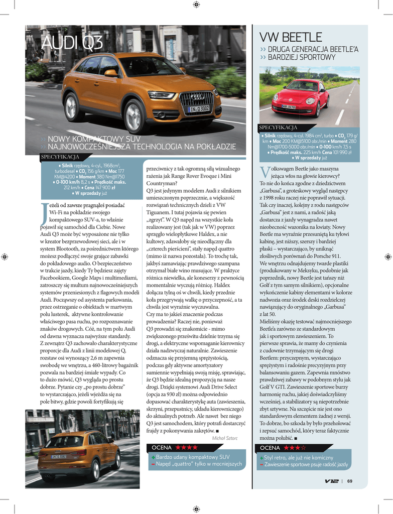 VW BEETLE AUDI Q3 >> DRUGA GENERACJA BEETLE’A >> BARDZIEJ SPORTOWY SPECYFIKACJA >> NOWY KOMPAKTOWY SUV >> NAJNOWOCZEŚNIEJSZA TECHNOLOGIA NA POKŁADZIE SPECYFIKACJA J • Silnik rzędowy, 4-cyl., 1968cm3, turbodiesel • CO2 156 g/km • Moc 177 KM@4200 • Moment 380 Nm@1750 • 0-100 km/h 8,2 s • Prędkość maks. 212 km/h • Cena 147 900 zł • W sprzedaży już Wi-Fi na pokładzie swojego kompaktowego SUV-a, to właśnie pojawił się samochód dla Ciebie. Nowe Audi Q3 może być wyposażone nie tylko w kreator bezprzewodowej sieci, ale i w system Blootooth, za pośrednictwem którego możesz podłączyć swoje grające zabawki do pokładowego audio. O bezpieczeństwo w trakcie jazdy, kiedy Ty będziesz zajęty Facebookiem, Google Maps i multimediami, zatroszczy się multum najnowocześniejszych systemów przeniesionych z flagowych modeli Audi. Począwszy od asystenta parkowania, przez ostrzeganie o obiektach w martwym polu lusterek, aktywne kontrolowanie właściwego pasa ruchu, po rozpoznawanie znaków drogowych. Cóż, na tym polu Audi od dawna wyznacza najwyższe standardy. Z zewnątrz Q3 zachowało charakterystyczne proporcje dla Audi z linii modelowej Q, rozstaw osi wynoszący 2,6 m zapewnia swobodę we wnętrzu, a 460-litrowy bagażnik pozwala na bardziej śmiałe wypady. Co to dużo mówić, Q3 wygląda po prostu dobrze. Pytanie czy „po prostu dobrze” to wystarczająco, jeżeli wjeżdża się na pole bitwy, gdzie powoli fortyfikują się przeciwnicy z tak ogromną siłą wizualnego rażenia jak Range Rover Evoque i Mini Countryman? Q3 jest jedynym modelem Audi z silnikiem umieszczonym poprzecznie, a większość rozwiązań technicznych dzieli z VW Tiguanem. I tutaj pojawia się pewien „zgrzyt”. W Q3 napęd na wszystkie koła realizowany jest (tak jak w VW) poprzez sprzęgło wielopłytkowe Haldex, a nie kultowy, zdawałoby się nieodłączny dla „czterech pierścieni”, stały napęd quattro (mimo iż nazwa pozostała). To trochę tak, jakbyś zamawiając prawdziwego szampana otrzymał białe wino musujące. W praktyce różnica niewielka, ale koneserzy z pewnością momentalnie wyczują różnicę. Haldex dołącza tylną oś w chwili, kiedy przednie koła przegrywają walkę o przyczepność, a ta chwila jest wyraźnie wyczuwalna. Czy ma to jakieś znaczenie podczas prowadzenia? Raczej nie, ponieważ Q3 prowadzi się znakomicie - mimo zwiększonego prześwitu dzielnie trzyma się drogi, a elektryczne wspomaganie kierownicy działa nadzwyczaj naturalnie. Zawieszenie odznacza się przyjemną sprężystością, podczas gdy aktywne amortyzatory sumiennie wypełniają swoją misję, sprawiając, że Q3 będzie idealną propozycją na nasze drogi. Dzięki systemowi Audi Drive Select (opcja za 930 zł) można odpowiednio dopasować charakterystykę auta (zawieszenia, skrzyni, przepustnicy, układu kierowniczego) do aktualnych potrzeb. Ale nawet bez niego Q3 jest samochodem, który potrafi dostarczyć frajdy z pokonywania zakrętów. ■ Michał Sztorc • Silnik rzędowy, 4-cyl. 1984 cm3, turbo • CO2 179 g/ km • Moc 200 KM@5100 obr./min • Moment 280 Nm@1700-5000 obr./min • 0-100 km/h 7,5 s • Prędkość maks. 225 km/h Cena 101 990 zł • W sprzedaży już V olkswagen Beetle jako maszyna jeżąca włos na głowie kierowcy? To nie do końca zgodne z dziedzictwem „Garbusa”, a groteskowy wygląd następcy z 1998 roku raczej nie poprawił sytuacji. Tak czy inaczej, kolejny z rodu następców „Garbusa” jest z nami, a radość jaką dostarcza z jazdy wynagradza nawet nieobecność wazonika na kwiaty. Nowy Beetle ma wyraźnie przesuniętą ku tyłowi kabinę, jest niższy, szerszy i bardziej płaski – wystarczająco, by uniknąć złośliwych porównań do Porsche 911. We wnętrzu odnajdujemy twarde plastiki (produkowany w Meksyku, podobnie jak poprzednik, nowy Beetle jest tańszy niż Golf z tym samym silnikiem), opcjonalne wykończenie kabiny elementami w kolorze nadwozia oraz środek deski rozdzielczej nawiązujący do oryginalnego „Garbusa” z lat 50. Mieliśmy okazję testować najmocniejszego Beetle’a zarówno ze standardowym jak i sportowym zawieszeniem. To pierwsze sprawia, że mamy do czynienia z cudownie trzymającym się drogi Beetlem: przyczepnym, wystarczająco sprężystym i radośnie precyzyjnym przy balansowaniu gazem. Zapewnia mnóstwo prawdziwej zabawy w podobnym stylu jak Golf V GTI. Zawieszenie sportowe burzy harmonię ruchu, jakiej doświadczyliśmy wcześniej, a stabilizatory są niepotrzebnie zbyt sztywne. Na szczęście nie jest ono standardowym elementem żadnej z wersji. To dobrze, bo szkoda by było przeholować i zepsuć samochód, który teraz faktycznie można polubić. ■ OCENA OCENA + Bardzo udany kompaktowy SUV – Napęd „quattro” tylko w mocniejszych + Styl retro, ale już nie komiczny – Zawieszenie sportowe psuje radość jazdy 69