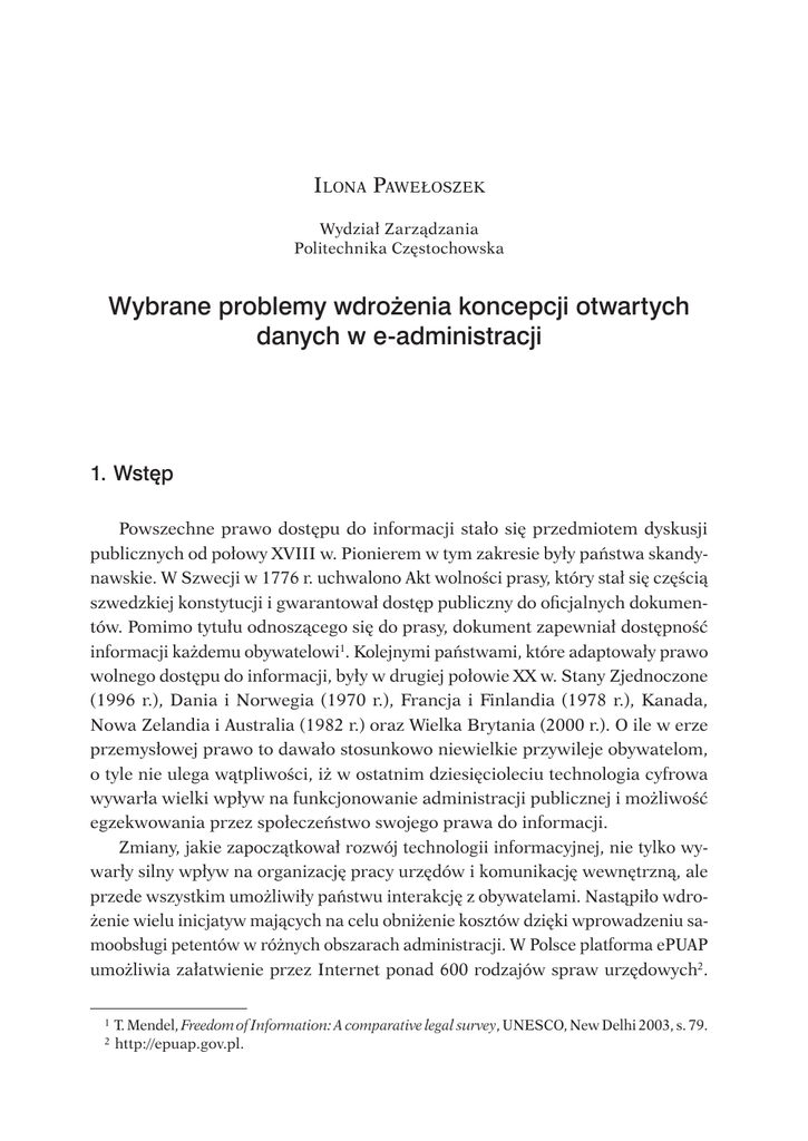 Wybrane problemy wdrożenia koncepcji otwartych danych w e‑administracji 455 Ilona Pawełoszek Wydział Zarządzania Politechnika Częstochowska Wybrane problemy wdrożenia koncepcji otwartych danych w e‑administracji 1. Wstęp Powszechne prawo dostępu do informacji stało się przedmiotem dyskusji publicznych od połowy XVIII w. Pionierem w tym zakresie były państwa skandy‑ nawskie. W Szwecji w 1776 r. uchwalono Akt wolności prasy, który stał się częścią szwedzkiej konstytucji i gwarantował dostęp publiczny do oficjalnych dokumen‑ tów. Pomimo tytułu odnoszącego się do prasy, dokument zapewniał dostępność informacji każdemu obywatelowi1. Kolejnymi państwami, które adaptowały prawo wolnego dostępu do informacji, były w drugiej połowie XX w. Stany Zjednoczone (1996 r.), Dania i Norwegia (1970 r.), Francja i Finlandia (1978 r.), Kanada, Nowa Zelandia i Australia (1982 r.) oraz Wielka Brytania (2000 r.). O ile w erze przemysłowej prawo to dawało stosunkowo niewielkie przywileje obywatelom, o tyle nie ulega wątpliwości, iż w ostatnim dziesięcioleciu technologia cyfrowa wywarła wielki wpływ na funkcjonowanie administracji publicznej i możliwość egzekwowania przez społeczeństwo swojego prawa do informacji. Zmiany, jakie zapoczątkował rozwój technologii informacyjnej, nie tylko wy‑ warły silny wpływ na organizację pracy urzędów i komunikację wewnętrzną, ale przede wszystkim umożliwiły państwu interakcję z obywatelami. Nastąpiło wdro‑ żenie wielu inicjatyw mających na celu obniżenie kosztów dzięki wprowadzeniu sa‑ moobsługi petentów w różnych obszarach administracji. W Polsce platforma ePUAP umożliwia załatwienie przez Internet ponad 600 rodzajów spraw urzędowych2. 1 T. Mendel, Freedom of Information: A comparative legal survey, UNESCO, New Delhi 2003, s. 79. 2 http://epuap.gov.pl. 456 Ilona Pawełoszek Jednakże cyfrowa rewolucja w administracji nie ogranicza się jedynie do usprawnienia przesyłania danych, ograniczenia liczby błędów i redukcji kosztów. Coraz większą rolę w komunikacji z obywatelami odgrywają media społecz‑ nościowe – platformy takie jak Facebook czy Twitter. W ten sposób jednostki administracji informują o swoich działaniach lub odpowiadają na pytania. Oprócz samoobsługi petentów i komunikacji za pomocą mediów społeczno‑ ściowych główny trend, który pojawił się w ostatnich latach i jest postrzegany jako ogromne źródło innowacji, stanowi inicjatywa otwartych danych (ang. Open Data). Koncepcja ta opisuje zbiory danych, które są bez ograniczeń dostępne i mogą być używane, jak również przetwarzane i publikowane przez każdego bez restrykcji dotyczących praw autorskich lub patentów, z zastrzeżeniem co najwyżej do wymogu podania źródła czy umożliwienia dalszej dystrybucji przetworzonych treści na takich samych zasadach3. Celem inicjatywy Open Data jest w szczegól‑ ności udostępnienie wszystkich danych nieosobowych (nienaruszających praw obywateli do ochrony danych osobowych) i niekomercyjnych (nienaruszających tajemnicy handlowej) posiadanych przez organizacje rządowe. W tym nurcie instytucje administracji publicznej w wielu krajach rozpo‑ częły udostępnianie danych rządowych na swoich portalach w sieci Internet w postaci usług webowych (ang. Web Services) lub przez interfejsy typu REST. W założeniu ma to prowadzić do lepszego zrozumienia polityki instytucji ad‑ ministracji publicznej przez obywateli, uczynienia jej w ten sposób bardziej wiarygodną i skuteczną. Otwartość danych rządowych dla społeczeństwa ma również zwiększyć uczestnictwo obywateli we współpracy z organami władzy oraz pobudzić innowacyjność. Publikowane dane odnoszą się do wielu dziedzin, najbardziej popularne to: ochrona środowiska, dane i statystyki dotyczące zatrud‑ nienia, budżety jednostek samorządowych, mapy, rozkłady jazdy komunikacji publicznej itp. Publikować je mogą indywidualne jednostki administracji lub dostawcy większych repozytoriów, które gromadzą publiczne zbiory danych i udostępniają je w scentralizowanej i standaryzowanej formie. Pomimo tego samego celu leżącego u podstaw ich udostępniania, repozytoria mogą bardzo się od siebie różnić. Różnice te mogą dotyczyć dziedzin, zakresu, rozmiaru, a także stosowanych standardów zapisu danych. Niewątpliwie najważniejszą cechą zbiorów otwartych danych jest ich użyteczność w świetle konkretnych zadań. Aby przyczyniać się do rozwoju otwartego społeczeństwa, platformy publikacji 3 P. Kozierski, R. Kabaciński, M. Lis, P. Kaczmarek, Open Access. Analiza zjawiska z punktu widzenia polskiego naukowca, s. 8, http://opendatahandbook.org/pdf/OpenDataHandbook. pdf. Wybrane problemy wdrożenia koncepcji otwartych danych w e‑administracji 457 otwartych danych powinny spełniać określone wymogi prawne, administracyjne, jak również techniczne. Celem niniejszego artykułu jest prezentacja korzyści oraz problemów i za‑ grożeń wynikających z wykorzystania otwartych danych. 2. Istota otwartego rządu i otwartych danych Otwarty rząd to pojęcie obejmujące wiele różnorodnych terminów i kon‑ cepcji. Często otwarty rząd traktowany jest jako synonim słowa e‑government i wykorzystania technologii informacyjno‑komunikacyjnej w administracji. Jednakże takie porównanie nie jest do końca poprawne, gdyż otwarty rząd jest paradygmatem teoretycznym, natomiast technologia jest narzędziem, którym rząd się posługuje. Należy też nadmienić, iż administracja najczęściej opiera się na technologiach już sprawdzonych w biznesie (np. systemach zarządzania treścią, obiegu dokumentów, systemach klasy ERP, rozwiązaniach mobilnych czy rozwiązaniach funkcjonujących w chmurze). W wielu źródłach literaturowych istnieje zgodność co do tego, że otwartość jest podstawowym przymiotem e‑rządu funkcjonującego w duchu demokracji XXI 