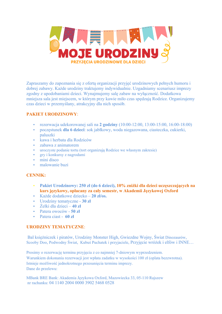 Zapraszamy do zapoznania się z ofertą organizacji przyjęć urodzinowych pełnych humoru i dobrej zabawy. Każde urodziny traktujemy indywidualnie. Uzgadniamy scenariusz imprezy zgodny z upodobaniami dzieci. Wynajmujemy salę zabaw na wyłączność. Dodatkowa mniejsza sala jest miejscem, w którym przy kawie miło czas spędzają Rodzice. Organizujemy czas dzieci w przemyślany, atrakcyjny dla nich sposób. PAKIET URODZINOWY: • • • • • • • • rezerwacja udekorowanej sali na 2 godziny (10:00-12:00, 13:00-15:00, 16:00-18:00) poczęstunek dla 6 dzieci: sok jabłkowy, woda niegazowana, ciasteczka, cukierki, paluszki kawa i herbata dla Rodziców zabawa z animatorem uroczyste podanie tortu (tort organizują Rodzice we własnym zakresie) gry i konkursy z nagrodami mini disco malowanie buzi CENNIK: • • • • • • Pakiet Urodzinowy: 250 zł (do 6 dzieci), 10% zniżki dla dzieci uczęszczających na kurs językowy, opłacany za cały semestr, w Akademii Językowej Oxford Każde dodatkowe dziecko – 20 zł/os. Urodziny tematyczne - 30 zł Żelki dla dzieci – 40 zł Patera owoców - 50 zł Patera ciast - 60 zł URODZINY TEMATYCZNE: Bal księżniczek i piratów, Urodziny Monster High, Gwiezdne Wojny, Świat Dinozaurów, Scooby Doo, Podwodny Świat, Kubuś Puchatek i przyjaciele, Przyjęcie wróżek i elfów i INNE… Prosimy o rezerwację terminu przyjęcia z co najmniej 7-dniowym wyprzedzeniem. Warunkiem dokonania rezerwacji jest wpłata zadatku w wysokości 100 zł (oplata bezzwrotna). Istnieje możliwość jednokrotnego przesunięcia terminu imprezy. Dane do przelewu: MBank BRE Bank: Akademia Językowa Oxford, Mazowiecka 33, 05-110 Rajszew nr rachunku: 04 1140 2004 0000 3902 5468 0528 Regulamin rezerwacji urodzin: Rezerwacji terminu urodzin można dokonać osobiście, telefonicznie lub pocztą elektroniczną. W celu potwierdzenia rezerwacji terminu urodzin należy dokonać przedpłaty 100 zł w formie zadatku. Zadatek nie podlega zwrotowi w przypadku rezygnacji z organizacji urodzin z winy usługobiorcy. Istnieje możliwość jednokrotnego przełożenia terminu imprezy urodzinowej, z co najmniej 5dniowym wyprzedzeniem, za zgodą usługodawcy. Wpłacenie zadatku jest jednoznaczne z akceptacją warunków niniejszego regulaminu. Niedokonanie wpłaty zadatku w ciągu 7 dni od daty rezerwacji zwalnia usługodawcę z obowiązku świadczenia usługi. Obowiązuje całkowity zakaz wnoszenia własnego jedzenia i napojów do sali. Usługobiorca zobowiązany jest do opłacenia równowartości deklarowanej liczby gości, zgodnie z informacją podaną co najmniej 3 dni przed uroczystością. W przypadku obecności na imprezie mniejszej liczby gości koszty opłaty nie ulegają zmianie, różnica nie będzie zwracana. W przypadku powiększenia liczby gości organizator uiszcza dopłatę zgodnie z cennikiem. Organizator zezwala na dostarczenie własnego tortu przez Zamawiającego, jednak nie ponosi za to odpowiedzialności. Usługobiorca jest odpowiedzialny za gości zaproszonych na urodziny i ponosi odpowiedzialność finansową za szkody spowodowane przez swoich gości.