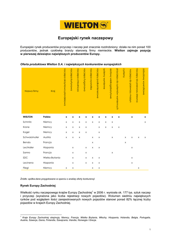 Europejski rynek naczepowy Europejski rynek producentów przyczep i naczep jest znacznie rozdrobniony: działa na nim ponad 100 producentów, jednak czołówkę branŜy stanowią firmy niemieckie. Wielton zajmuje pozycję w pierwszej dziesiątce największych producentów Europy. Oferta produktowa Wielton S.A. i największych konkurentów europejskich x x x x x x x x Schmitz Niemcy x x x x x x x x Krone Niemcy x x x x x x x Kogel Niemcy x x x x x Schwarzmuller Austria x x x Benalu Francja Lecitrailer Hiszpania x x Samro Francja x x SDC Wielka Brytania x x x x x Lecinena Hiszpania x x x x x Fliegl Niemcy x x x x x x x x x zabudowy wywrotkowe Polska naczepy do przewozu drewna WIELTON x x naczepy do przewozu maszyn cysterny przyczepy do systemów wymiennych zestawy wielkogabarytowe systemy wymienne naczepy podkontenerowe naczepa wywrotka naczepa furgonowa naczepa chłodnicza naczepa kurtynowa Kraj naczepa skrzyniowo-plandekowa Nazwa firmy x x x x x x x x x x x x Źródło: spółka-dane przygotowane w oparciu o analizę oferty konkurencji Rynek Europy Zachodniej 1 Wielkość rynku naczepowego krajów Europy Zachodniej w 2006 r. wyniosła ok. 177 tys. sztuk naczep i przyczep (wyraŜona jako liczba rejestracji nowych pojazdów). Wolumen siedmiu największych rynków pod względem ilości zarejestrowanych nowych pojazdów stanowi ponad 82% łącznej liczby pojazdów w krajach Europy Zachodniej. 1 Kraje Europy Zachodniej obejmują: Niemcy, Francja, Wielka Brytania, Włochy, Hiszpania, Holandia, Belgia, Portugalia, Austria, Szwecja, Dania, Finlandia, Szwajcaria, Irlandia, Norwegia i Grecja. 1 Rejestracje nowych przyczep i naczep w 7 największych krajach-producentach Europy Zachodniej (w tys. sztuk) i roczna procentowa zmiana liczby rejestracji w tych państwach w latach 2004 – 2009P 150 145 140 20% 149,9 145,9 146,9 145,3 15% 16,0% 10% 8,1% 137,2 134,4 135 0,7% 2,0% 5% Zmiana (w %) Rejestracje (w tys. sztuk) 155 0% 130 -2,0% 0,4% 125 -5% 2004 2005 2006 2007P 2008P Liczba rejest racji (w t y s. szt uk) - lew a oś 2009P Zmiana (w %) - praw a oś Źródło: CLEAR, “The Western European Trailer Market – Forecast Report“, styczeń 2007 Spadek sprzedaŜy w 2005 r. był wynikiem zwiększonego popytu inwestycyjnego wygenerowanego w 2004 r. Prognoza na lata 2006 - 2009 zakłada wzrost ilości sprzedanych sztuk głównie z uwagi na rosnący popyt odtworzeniowy w poszczególnych krajach. Oczekiwany wzrost będzie obserwowany głównie w segmencie naczep, zaś w segmencie przyczep liczba sprzedanych sztuk ustabilizuje się w kolejnych latach na poziomie z 2006 r. Rynek Europy Środkowo-Wschodniej 2 Wielton sprzedaje swoje produkty do większości państw Europy Środkowo-Wschodniej, w tym do Rosji, na Ukrainę, Litwę, Łotwę, do Czech, Bułgarii i Rumunii. Rynek Europy Środkowo-Wschodniej charakteryzuje się znacznym zapotrzebowaniem na pojazdy spełniające wymagania UE. Większość pojazdów, będących obecnie w uŜytkowaniu jest przestarzała i droga w eksploatacji, a ponadto widoczne jest rosnące zapotrzebowanie na powiększanie bazy transportowej w tych krajach. Przewidywania CLEAR zakładają wzrost rynku średnio o 3-4% rocznie. Rejestracje nowych przyczep i naczep (dotyczy wyłącznie produktów o standardzie zachodnioeuropejskim) w krajach Europy Środkowo-Wschodniej (w tys. sztuk) i roczna procentowa zmiana liczby rejestracji w tych państwach w latach 2004 – 2009P. 50 48,7 51,0 52,5 54,7 56,8 35% 30% 45,1 25% 40 20% 30 15% 20 10% 10 7,9% 0 2004 2005 Zmiana (w %) Rejestracje (w tys. sztuk) 60 5% 4,7% 2006 3,1% 4,2% 3,8% 2007P 2008P 2009P Liczba rejest racji (w t y s. sztuk) - lew a oś 0% Zmiana (w %) - praw a oś Źródło: CLEAR, “The Eastern European Trailer Market – Forecast Report“, styczeń 2007 2 Kraje Europy Środkowo-Wschodniej: Rosja, Ukraina, Polska, Turcja, Czechy, Węgry, Rumunia, Litwa, Bułgaria, Estonia, Łotwa, Słowenia. 2 NajwaŜniejszym rynkiem w Europie Środkowo-Wschodniej jest rynek rosyjski, stanowiący prawie ¼ tego rynku (blisko 14 tys. sztuk w 2006 r.). Wzrost zapotrzebowania na nowe pojazdy jest przewidywany we wszystkich krajach regionu. Polski rynek naczepowy Wielton jest największym polskim producentem przyczep i naczep, posiadającym w swojej ofercie blisko 60 typów pojazdów transportowych. Spółka wyznacza trendy, które krajowa konkurencja naśladuje. Oferta produktowa Wielton S.A. i największych konkurentów krajowych Szczerców Sommer Polska Sieradz x x x x x CMT Chojnice Chojnice x x x x Zasław Zagórz x x x x x Polkon Trzcianka x x x x x zabudowy wywrotkowe Bodex x naczepy do przewozu drewna x naczepy do przewozu maszyn x cysterny x przyczepy do systemów wymiennych Wieluń zestawy wielkogabarytowe WIELTON systemy wymienne x naczepy podkontenerowe x naczepa wywrotka x naczepa furgonowa x naczepa chłodnicza x naczepa kurtynowa Miejscowość naczepa skrzyniowo-plandekowa Nazwa firmy x x x KH-Kipper Zagnańsk x Janmil Janów Nowy k. Bełchatowa x Mega Nysa Feber Sieradz x x x x x x x x x x x x x x x X Źródło: spółka- dane w oparciu o analizę oferty konkurencji Rozwój rynku naczepowego w Polsce, podobnie jak w innych krajach Europy, jest związany z intensyfikacją transportu drogowego. Przewóz ładunków transportem drogowym wzrósł prawie dwukrotnie z poziomu 69,5 mld tkm w 1998 r. do ok. 112 mld tkm w 2005 r., a do 2020 r. 3 prognozowany jest dalszy jego wzrost do poziomu ok. 158 mld tkm . OŜywienie na rynku transportu drogowego pociągnęło za sobą wzrost popytu na przyczepy i naczepy na rynku krajowym. 3 Ministerstwo Transportu i Gospodarki Morskiej „Polityka transportowa państwa na lata 2001-2015 dla zrównowaŜonego rozwoju kraju”. 3 14 50% 52,5% 12 10 60% 13,8 9,7 40% 10,1 9,0 30% 8 20% 6 10% 4 0% 2 Zmiana SprzedaŜ (w tys. sztuk) 16 -10% -6,7% 0 -20% 2004 2005 SprzedaŜ (w t y s. szt uk) - lew a oś 2006 I pół. 2007 Zmiana (w %) - praw a oś Źródło: Centralna Ewidencja Pojazdów i Kierowców MSWiA. W 2