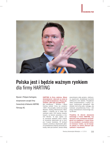Rozmowa PAR Polska jest i będzie ważnym rynkiem dla firmy HARTING Wywiad z Philipem Hartingiem, wiceprezesem zarządu firmy Connectivity & Networks HARTING Führungs AG. HARTING to firma rodzinna, Wasze doświadczenie i obecność na rynku to ponad 68 lat działalności. Proszę opowiedzieć, jakie były początki firmy. Moi dziadkowie – Wilhelm i Marie Harting założyli firmę we wrześniu 1945 r. Na początku nosiła ona nazwę Wilhelm Harting Mechanische Werkstätten i mieściła się w małej hali, wielkości około 100 metrów kwadratowych, na terenie warsztatu w mieście Minden. To były ciężkie czasy, ponieważ zaledwie cztery miesiące wcześniej zakończyła się w Europie II wojna światowa. W tamtych czasach produkcja obejmowała głównie podstawowe artykuły pierwszej potrzeby, takie jak żarówki, bardzo wtedy poszukiwane płyty grzejne, elektryczne zapalniczki, dwupłytowe kuchenki elektryczne oraz żelazka. Początkowo zatem produkowaliśmy z myślą o naszych codziennych potrzebach. Mój dziadek miał silną wolę i odwagę, aby budować przyszłościową firmę i dać pracę mieszkańcom zniszczonego wojną Minden. Przejdźmy do obecnie stosowanej technologii w firmie HARTING. Czy tworzycie nowe rozwiązania technologiczne we współpracy z innymi firmami czy ośrodkami, na przykład centrami innowacji i badań, czy też bazujecie jedynie na swoich własnych specjalistach i inżynierach? Pomiary Automatyka Robotyka nr 12/2013 33 Rozmowa PAR Philip Harting, wnuk założycieli firmy HARTING, urodził się 11 września 1974 r. w niemieckim Bünde. Stanowisko pierwszego wiceprezesa Connectivity & Networks HARTING Führungs AG objął w marcu 2008 r. Wcześniej, od czerwca 2005 r., piastował funkcję asystenta kierownictwa HARTING KGaA, zaś we wrześniu 2005 r. objął stanowisko dyrektora zarządzającego na Azję w HARTING (HK) Ltd. w Hong Kongu. W latach 1994–1995 przeszedł w ramach zasadniczej służby wojskowej szkolenie jako radiooperator. Następnie w latach 1995–1998 w Hartmann & Braun w Minden odbył specjalistyczny kurs z zakresu elektroniki przemysłowej. W latach 1998–2005 studiował na kierunkach Industrial Electrical Engineering w Braunschweig oraz Business Administration w Kolonii. Dyplom na kierunku Business Administration obronił w maju 2005 r. Philip Harting jest członkiem honorowym wielu organizacji i stowarzyszeń: Stowarzyszenia Niemieckiego Przemysłu Targowego AUMA (Association of the German Trade Fair Industry), Federalnego Zrzeszenia Niemieckiego Przemysłu BDI (Federation of German Industries’), komitetu organizacji ZVEI na rzecz handlu zagranicznego, Komisji Polityki Transportowej ZVEI (ZVEI Commission Transport Policy) oraz Trade Fair Advisory Council Industrial Automation HMI (DMAG) w Hanowerze. 34 Ogólnie ujmując, polegamy na umiejętnościach i wiedzy naszych specjalistów i inżynierów. Zależy nam, aby zatrzymać ich fachową i obszerną wiedzę w naszej firmie. Z tego względu obecnie budujemy nasze nowe centrum Jakości i Technologii HARTING (HQT) w Espelkamp. Prace budowlane dobiegną końca wiosną 2014 r. Tam też będziemy prowadzić badania i pracować nad dalszym rozwojem nowych produktów, z myślą o ich przyszłościowych zastosowaniach. Współpracujemy również z partnerami, przykładowo prowadzimy wspólne badania i prace rozwojowe z firmą partnerską LEONI oraz z Uniwersytetem Reutlingen. Celem projektu jest badanie możliwości symetrycznego kabla miedzianego przy 100 Gb/s. Prowadzimy testy dla złączy Kat 6A, Kat 7, Kat 7A oraz dla nowych technik łączenia. Co istotne, odnotowujemy postępy w naszym projekcie. Produkcja złączy modułowych to obecnie bardzo istotna część działalności firmy. Co jest głównym powodem rozwoju takiego asortymentu produktów? Jaka jest najistotniejsza zaleta złączy modułowych w porównaniu z innymi rodzajami złączy? Nasz system złączy modułowych HanModular to logiczne rozszerzenie serii Han-Com, która jest systemem łączeniowym, mającym na celu doprowadzenie równocześnie zasilania oraz sygnałów, dostosowanym do indywidualnych zamówień klientów. Jednak Han-Modular to znacznie więcej niż złącza zasilające i sygnałowe. Han-Modular oferuje ponad 40 różnych modułów: zasilania, sygnału, przesyłu danych, interfejsów optycznych i pneumatycznych. Obecna rodzina obejmuje moduły zasilające z zakresu od 40 A do 200 A, moduły sygnałowe – nawet do 25 kontaktów na moduł, moduły ekranowane, moduły danych dla USB, FireWire, RJ45 lub Gigabit Ethernet, interfejsy optyczne dla POF lub włókna szklanego a także moduły pneumatyczne. Ze względu na swoją elastyczność i niezawodność Han-Modular to ugruntowany już na rynku standard złączy modułowych. Korzystanie ze złączy Han-Modular przynosi naszym klientom ogromne korzyści. Można połączyć jedno, dwa, trzy lub więcej złączy w jedno. W praktyce oznacza to, że koszty złączy są niższe, dodatkowo skraca się czas ich instalacji i zwiększa oszczędność miejsca. Które z gałęzi przemysłu są głównymi odbiorcami Waszych produktów na terenie Polski? Czy nasz rynek różni się pod tym względem od innych rynków? W Polsce mamy raczej takie same rynki docelowe, jak w pozostałych krajach europejskich. Są to takie branże i sektory jak: technologia transportowa, budowa maszyn, technologia automatyki, branża energetyczna, technologia zarządzania sprzętem scenicznym, technologia medyczna, wbudowane systemy komputerowe, infrastruktura sieci przemysłowych. Polski rynek jest niemal identyczny, jak inne rynki w Europie. Polska przeszła zdumiewające i głębokie zmiany po upadku komunizmu. Co istotne: jesteście jedynym krajem w Unii Europejskiej, który przetrwał międzynarodowy krach finansowy bez recesji. To świadczy o zdrowej Fot. Harting Chcemy być siłą napędową zmian technologicznych i postępu, czy to w przemyśle, czy to dla klientów, na przykład w zakres