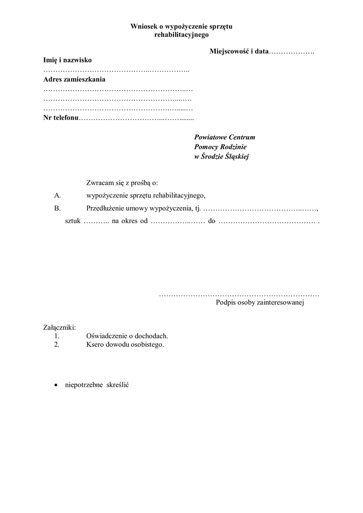 Wniosek o wypożyczenie sprzętu rehabilitacyjnego