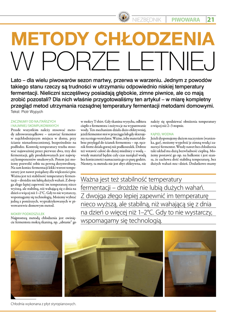 niezbędnik piwowara 21 Metody chłodzenia w porze letniej Lato – dla wielu piwowarów sezon martwy, przerwa w warzeniu. Jednym z powodów takiego stanu rzeczy są trudności w utrzymaniu odpowiednio niskiej temperatury fermentacji. Nieliczni szczęśliwcy posiadają głębokie, zimne piwnice, ale co mają zrobić pozostali? Dla nich właśnie przygotowaliśmy ten artykuł – w miarę kompletny przegląd metod utrzymania rozsądnej temperatury fermentacji metodami domowymi. Tekst: Piotr Wypych Zacznijmy od najtańszych i najmniej skomplikowanych Przede wszystkim należy stosować metody zdroworozsądkowe – ustawiać fermentor w najchłodniejszym miejscu w domu, przy ścianie nienasłonecznionej, bezpośrednio na podłodze. Kontrolę temperatury trzeba stosować najuważniej przez pierwsze dwa, trzy dni fermentacji, gdy produkowanych jest najwięcej komponentów smakowych. Potem już możemy pozwolić sobie na pewną dezynwolturę. Na sam koniec fermentacji lekki wzrost temperatury jest nawet pożądany dla większości piw. Ważna jest też stabilność temperatury fermentacji – drożdże nie lubią dużych wahań. Z dwojga złego lepiej zapewnić im temperaturę nieco wyższą, ale stabilną, niż wahającą się z dnia na dzień o więcej niż 1–2°C. Gdy to nie wystarczy, wspomagamy się technologią. Możemy wybrać jedną z poniższych, wypraktykowanych w piwowarstwie domowym metod. Mokry podkoszulek Najprostszą metodą chłodzenia jest owinięcie fermentora mokrą tkaniną, np. „ubranie” go Chłodnia wykonana z płyt styropianowych. w mokry T-shirt. Gdy tkanina wysycha, odbiera ciepło z fermentora i zużywa je na wyparowanie wody. Ten mechanizm działa dużo efektywniej, jeżeli fermentor stoi w przeciągu lub gdy skierujemy na niego wentylator. Ważne, żeby materiał dobrze przylegał do ścianek fermentora – np. ręcznik frotte działa gorzej niż podkoszulek. Dobrze też wstawić całość do dużej miednicy z wodą – wtedy materiał będzie cały czas nasiąkał wodą bez konieczności namaczania go co parę godzin. Niestety, ta metoda nie jest zbyt efektywna, nie należy się spodziewać obniżenia temperatury o więcej niż 2–3 stopnie. Kąpiel wodna Jeżeli dysponujemy dużym naczyniem (wanienka, gar), możemy wypełnić je zimną wodą i zanurzyć fermentor. Wtedy nawet bez chłodzenia taki układ ma dużą bezwładność cieplną. Możemy postawić go np. na balkonie i jest szansa, że zachowa dość stabilną temperaturę, bez dużych wahań noc–dzień. Dodatkowo mamy Ważna jest też stabilność temperatury fermentacji – drożdże nie lubią dużych wahań. Z dwojga złego lepiej zapewnić im temperaturę nieco wyższą, ale stabilną, niż wahającą się z dnia na dzień o więcej niż 1–2°C. Gdy to nie wystarczy, wspomagamy się technologią.