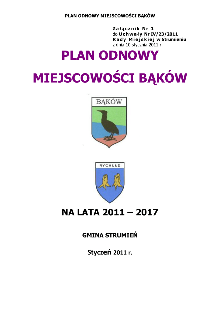 PLAN ODNOWY MIEJSCOWOŚCI BĄKÓW Załącznik Nr 1 do U c h w a ł y Nr IV/23/2011 R a d y M i e j s k i e j w Strumieniu z dnia 10 stycznia 2011 r. PLAN ODNOWY MIEJSCOWOŚCI BĄKÓW NA LATA 2011 – 2017 GMINA STRUMIEŃ Styczeń 2011 r. PLAN ODNOWY MIEJSCOWOŚCI BĄKÓW Spis treści I. WSTĘP .................................................................................................................. 3 II. ANALIZA ZASOBÓW SOŁECTWA ................................................................ 4 1. Położenie geograficzne ............................................................................................... 4 2. Walory przyrodnicze i krajobrazowe ..........................................................................8 3. Wody powierzchniowe i głębinowe ............................................................................ 8 4. Gleby ........................................................................................................................... 10 5. Gospodarka ................................................................................................................ 11 6. Rys historyczny Bąkowa ............................................................................................ 13 7. Zabytki i turystyka ..................................................................................................... 14 8. Kultura ........................................................................................................................ 20 9. Demografia ................................................................................................................. 21 10. Infrastruktura techniczna ........................................................................................ 22 11. Oświata i sport ......................................................................................................... 28 12. Opieka społeczna i zdrowotna ................................................................................ 33 III. ANALIZA SWOT............................................................................................ 37 IV. DIAGNOZA AKTUALNEJ SYTUACJI WSI ................................................ 39 V. WIZJA ROZWOJU WSI.................................................................................. 40 VI. ZIDENTYFIKOWANE PROBLEMY ............................................................. 41 VII. OPIS INWESTYCJI NA LATA 2011 – 2017 .......................................... 42 VII.I ZADANIA NIEUJĘTE W WYKAZIE PLANU ODNOWY MIEJSCOWOŚCI SOŁECTWA BĄKÓW ........................................................... 47 VIII.OPIS ZNACZENIU I CHARAKTERYSTYKA DLA OBSZARÓW ZASPOKOJENIA POTRZEB O SZCZEGÓLNYM MIESZKAŃCÓW, SPRZYJAJĄCYCH NAWIĄZYWANIU KONTAKTÓW SPOŁECZNYCH, ZE WZGLĘDU NA ICH POŁOŻENIE ORAZ CECHY FUNKCJONALNOPRZESTRZENNE, W SZCZEGÓLNOŚCI POPRZEZ ODNAWIANIE LUB BUDOWĘ PLACÓW PARKINGOWYCH, CHODNIKÓW LUB OŚWIETLENIA ULICZNEGO ............................................................................. 49 2 PLAN ODNOWY MIEJSCOWOŚCI BĄKÓW IX. ZARZĄDZANIE ............................................................................................... 52 1. Wdrażanie................................................................................................................... 52 Instrumenty realizacji .................................................................. 52 2. Monitorowanie ........................................................................................................... 53 Wskaźniki produktu .............................................................................................. 54 Wskaźniki rezultatu .............................................................................................. 54 Wskaźniki oddziaływania ..................................................................................... 54 X. BIBLIOGRAFIA ............................................................................................... 57 XI. SPIS ZDJĘĆ I TABEL .................................................................................... 58 XII. SPOTKANIA MIESZKAŃCÓW BĄKOWA................................................ 59 3 PLAN ODNOWY MIEJSCOWOŚCI BĄKÓW I. Wstęp Polska wieś staje, na początku XXI wieku, do rywalizacji przede wszystkim gospodarczej z zrównoważonego cywilizacją rozwoju krajów obszarów Unii Europejskiej. wiejskich niezbędne Dla zapewnienia jest zapewnienie wielofunkcyjności rolnictwa i wsi, zwiększenie funkcji gospodarczych i społecznych wsi, ochrony środowiska na obszarach wiejskich, ograniczenie bezrobocia oraz poprawa warunków życia ludności wiejskiej. Warunkiem niezbędnym do aktywnego włączenia się mieszkańców miejscowości wiejskich w realizację przedsięwzięć na rzecz rozwoju i promocji lokalnych walorów kulturowych i przyrodniczych jest integracja społeczności lokalnej wokół budowy wspólnego planu działania, który można nazwać planem odnowy miejscowości. Jest to postępowanie odmienne od działań podejmowanych w innych programach ze względu na element integracji na najniższym poziomie współdziałania mieszkańców pojedynczej wsi. Niniejsze opracowanie jest właśnie takim Planem działania przygotowanym dla miejscowości Bąków, w której mieszkańcy zintegrowali się wokół wspólnych celów oraz postanowili wykorzystać szansę jaką daje jej położenie, wyjątkowe bogactwo krajobrazu i dorobek kulturowy ludzi, którzy tę wieś wybrali jako miejsce stałego zamieszkania. Poniższy dokument jest zgodny ze „Strategią Rozwoju Gminy Strumień na lata 2005 – 2013”, „Planem Ochrony środowiska i Gospodarki Odpadami” oraz „Studium uwarunkowań i kierunków zagospodarowania przestrzennego Gminy Strumień”, Plan Odnowy Miejscowości stanowi ich uzupełnienie. II. Analiza zasobów sołectwa 1. Położenie geograficzne Bąków (niem. Bonkau) to wieś sołecka w gminie Strum