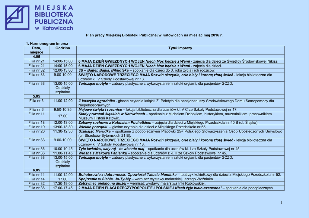 Plan pracy Miejskiej Biblioteki Publicznej w Katowicach na miesiąc maj 2016 r.