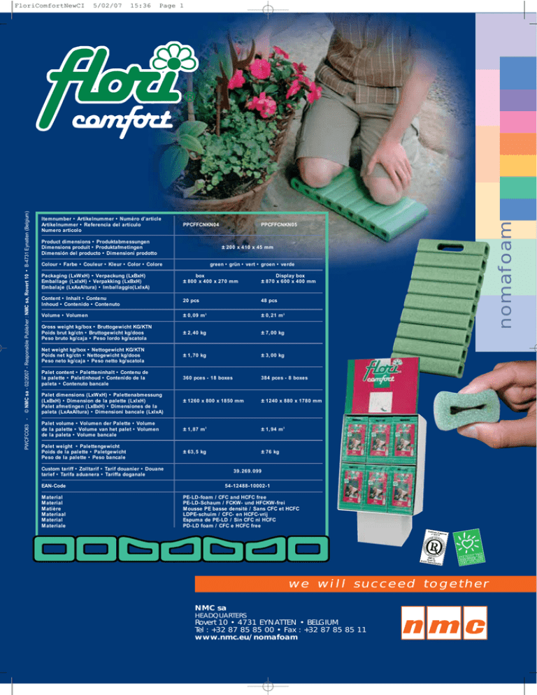 PWCFCO63 - 5/02/07 15:36 Page 1 Itemnumber • Artikelnummer • Numéro d’article Artikelnummer • Referencia del artículo Numero articolo PPCFFCNKN04 Product dimensions • Produktabmessungen Dimensions produit • Produktafmetingen Dimensión del producto • Dimensioni prodotto PPCFFCNKN05 ± 200 x 410 x 45 mm Colour • Farbe • Couleur • Kleur • Color • Colore green • grün • vert • groen • verde Packaging (LxWxH) • Verpackung (LxBxH) Emballage (LxIxH) • Verpakking (LxBxH) Embalaje (LxAxAltura) • Imballaggio(LxIxA) box ± 800 x 400 x 270 mm Display box ± 870 x 600 x 400 mm Content • Inhalt • Contenu Inhoud • Contenido • Contenuto 20 pcs 48 pcs Volume • Volumen ± 0,09 m3 ± 0,21 m3 Gross weight kg/box • Bruttogewicht KG/KTN Poids brut kg/ctn • Bruttogewicht kg/doos Peso bruto kg/caja • Peso lordo kg/scatola ± 2,40 kg ± 7,00 kg Net weight kg/box • Nettogewicht KG/KTN Poids net kg/ctn • Nettogewicht kg/doos Peso neto kg/caja • Peso netto kg/scatola ± 1,70 kg ± 3,00 kg Palet content • Paletteninhalt • Contenu de la palette • Paletinhoud • Contenido de la paleta • Contenuto bancale 360 pces - 18 boxes 384 pces - 8 boxes ± 1260 x 800 x 1850 mm ± 1240 x 880 x 1780 mm Palet volume • Volumen der Palette • Volume de la palette • Volume van het palet • Volumen de la paleta • Volume bancale ± 1,87 m3 ± 1,94 m3 Palet weight • Palettengewicht Poids de la palette • Paletgewicht Peso de la palette • Peso bancale ± 63,5 kg ± 76 kg Palet dimensions (LxWxH) • Palettenabmessung (LxBxH) • Dimension de la palette (LxIxH) Palet afmetingen (LxBxH) • Dimensiones de la paleta (LxAxAltura) • Dimensioni bancale (LxIxA) Custom tariff • Zolltarif • Tarif douanier • Douane tarief • Tarifa aduanera • Tariffa doganale EAN-Code Material Material Matière Materiaal Material Materiale 39.269.099 54-12488-10002-1 PE-LD-foam / CFC and HCFC free PE-LD-Schaum / FCKW- und HFCKW-frei Mousse PE basse densité / Sans CFC et HCFC LDPE-schuim / CFC- en HCFC-vrij Espuma de PE-LD / Sin CFC ni HCFC PD-LD foam / CFC e HCFC free we will succeed together NMC sa HEADQUARTERS Rovert 10 • 4731 EYNATTEN • BELGIUM Tel : +32 87 85 85 00 • Fax : +32 87 85 85 11 www.nmc.eu/nomafoam nomafoam © NMC sa - 02/2007 - Responsible Publisher : NMC sa, Rovert 10 • B-4731 Eynatten (Belgium) FloriComfortNewCI