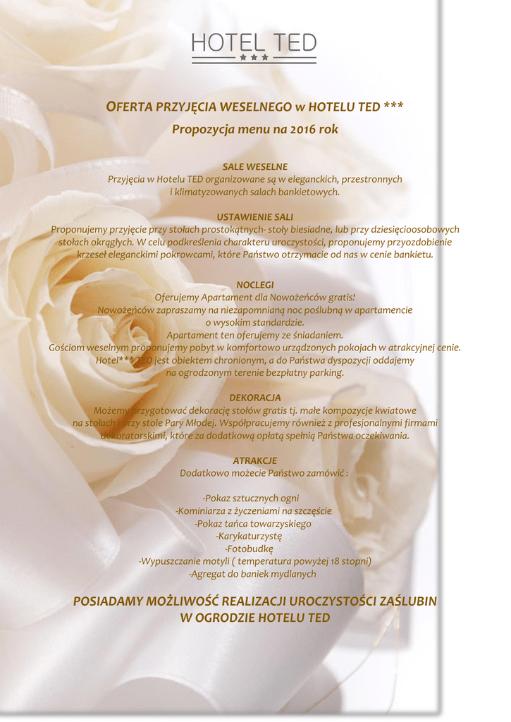 OFERTA PRZYJĘCIA WESELNEGO w HOTELU TED *** Propozycja menu na 2016 rok SALE WESELNE Przyjęcia w Hotelu TED organizowane są w eleganckich, przestronnych i klimatyzowanych salach bankietowych. USTAWIENIE SALI Proponujemy przyjęcie przy stołach prostokątnych- stoły biesiadne, lub przy dziesięcioosobowych stołach okrągłych. W celu podkreślenia charakteru uroczystości, proponujemy przyozdobienie krzeseł eleganckimi pokrowcami, które Państwo otrzymacie od nas w cenie bankietu. NOCLEGI Oferujemy Apartament dla Nowożeńców gratis! Nowożeńców zapraszamy na niezapomnianą noc poślubną w apartamencie o wysokim standardzie. Apartament ten oferujemy ze śniadaniem. Gościom weselnym proponujemy pobyt w komfortowo urządzonych pokojach w atrakcyjnej cenie. Hotel*** TED jest obiektem chronionym, a do Państwa dyspozycji oddajemy na ogrodzonym terenie bezpłatny parking. DEKORACJA Możemy przygotować dekorację stołów gratis tj. małe kompozycje kwiatowe na stołach i przy stole Pary Młodej. Współpracujemy również z profesjonalnymi firmami dekoratorskimi, które za dodatkową opłatą spełnią Państwa oczekiwania. ATRAKCJE Dodatkowo możecie Państwo zamówić : -Pokaz sztucznych ogni -Kominiarza z życzeniami na szczęście -Pokaz tańca towarzyskiego -Karykaturzystę -Fotobudkę -Wypuszczanie motyli ( temperatura powyżej 18 stopni) -Agregat do baniek mydlanych POSIADAMY MOŻLIWOŚĆ REALIZACJI UROCZYSTOŚCI ZAŚLUBIN W OGRODZIE HOTELU TED MENU WESELNE Specjalnie dla Państwa przygotowaliśmy propozycję menu weselnego, które zaspokoi Państwa oczekiwania Przyjęcie weselne rozpoczynamy powitaniem Pary Młodej chlebem i solą - w cenie bankietu Brak opłat za wniesiony własny alkohol Brak opłat za kelnera roznoszącego alkohol Maksymalnie 1 kelner na 20 osób OFERTA WESELNA W CENIE 190,00 ZŁ BRUTTO / OSOBĘ UROCZYSTY OBIAD ZUPA – jedna do wyboru: rosół mięsny z makaronem bulion grzybowy z chrupiącym pierożkiem krem z białych warzyw z pieczonym bekonem MIĘSA NA PÓŁMISKACH ( dwa mięsa na osobę) MIĘSO W SOSIE- do wyboru jedno: polędwiczka wieprzowa w sosie kurkowym zraz wieprzowy z ogórkiem i boczkiem w sosie własnym rolka z indyka ze szpinakiem i suszonym pomidorem w białym sosie tymiankowym MIĘSA SMAŻONE: de volaille z masłem i pietruszką cordon bleu z szynką i serem udko z kurczaka nadziane pieczarkami supreme z kurczaka z chrupiącą skórką bryzol wieprzowy z pieczarkami i serem ziemniaki z wody ziemniaki opiekane ryż z warzywami marchewka z groszkiem bukiet surówek (3 rodzaje) DODATKI: DESER: jeden do wyboru: lody z owocami i bitą śmietaną mus czekoladowy z wiśniami w żelu krem brulee z owocami panna cotta z sosem malinowym DRUGIE DANIE CIEPŁE SERWOWANE: jedno do wyboru: bogracz węgierski z ciepłymi bułeczkami rosół carski z kawałkami kurczaka i kluseczkami z jajka flaczki wołowe z gorącym chlebem krem z borowika z knelkiem drobiowym TRZECIE DANIE CIEPŁE: jeden z proponowanych zestawów: szynki wieprzowe, żeberka w sosie BBQ, buraczki w miodzie, gnocchi z masłem czosnkowym, warzywa maślane udziec barani, golonki w piwie, czerwona kapusta z jabłkami, kasza gryczana z borowikiem, zapiekanka ziemniaczana udziec z dzika, szaszłyki wieprzowe, kapusta z grzybami, ziemniaki opiekane, pęczak z grzybami łosoś w cieście francuskim, pałki z indyka w ostrej marynacie, warzywa maślane, rissotto z zielonym groszkiem, krokiety ziemniaczane CZWARTE DANIE CIEPŁE : jedno do wyboru: filet z łososia z ziołowym veloute, czarny ryż, zapiekanka warzywna specjał drobiowy w sosie borowikowym z kluskami śląskimi i kapustą zasmażaną rolada śląska w sosie z czerwonego wina, kapusta modra, kluseczki śląskie filet z indyka pieczony z sosem żubrówkowo- żurawinowym, noisety ziemniaczane, sałaty tournedos z polędwiczki wieprzowej na smażonych grzybach, ziemniaki w ziołach, fasolka PIĄTE DANIE CIEPŁE: jedno do wyboru: barszcz czerwony z krokietami pieczonymi i pierogami zupa chrzanowa z białą kiełbasą i jajkiem ZIMNA PŁYTA: pasztet z marynatami galantyna z kurczaka z orzeszkami mięsa pieczyste(karczek, schab ze śliwką i morelą) terina wieprzowa z warzywami mus z pstrąga z palonymi migdałami galaretka wieprzowa z musem chrzanowym rolka z indyka z winogronem i malagą polędwiczka wieprzowa z musem i bekonem jajka z plastrem wędzonego łososia royal z warzywami i grzybami śledzie na dwa sposoby sałatka z brokułami i serem feta sałatka z wędzonego drobiu pieczywo BUFET SŁODKI: kompozycja owocowa na lustrze ciasteczka koktajlowe ciasta deserki amuse bouche BUFET KAWOWY: kawa z ekspresu przelewowego – bez ograniczeń herbata z cytryną – bez ograniczeń woda niegazowana 0,5l / os. WIEJSKI STÓŁ: dodatkowo płatny 100osób 1 500,00 zł szynka wiejska z kością wędzona wyroby swojskie(kaszanka , pasztetowa, czarne) salcesony, pasztety marynaty i kiszonki wiejski chleb placek drożdżowy POPRAWINY w cenie 60,00zł / osoba OBIAD ZUPA – jedna do wyboru: żurek staropolski z kiełbasą i jajkiem lub Radomszczańska zalewajka DANIE GŁÓWNE - jedno do wyboru: pieczeń wieprzowa w sosie własnym, ziemniaki, zestaw surówek żeberka w sosie musztardowym , ziemniaki z wody , zestaw surówek zrazy z grzybami w sosie, ziemniaki z koperkiem, bukiet surówek plus dodatkowo podane na półmiskach mięsa pozostałe z wesela DRUGIE DANIE CIEPŁE - do wyboru: gołąbki z mięsem w sosie pomidorowym, gołąbki z kaszą i grzybami w sosie pieczarkowym kluchy wiejskie nadziewane mięsem, kapusta zasmażana udka z kurczaka w sezamie , noisety ziemniaczane, kalafior i fasolka TRZECIE DANIE CIEPŁE – jedno do wyboru: frykadelki z pieczarkami, bigos flaczki staropolskie z gorącymi bułeczkami rolka z indyka ze szpinakiem, sos serowy, ryż z warzywami ZAKĄSKI ZIMNE pasztet staropolski galantyna z kurczaka z pistacjami galaretka drobiowa jajka w sosie tatarskim mięsa pieczyste sałatka z tuńczykiem sałatka grecka śled