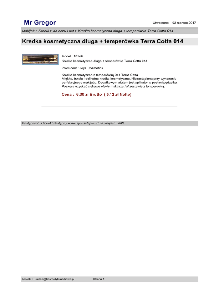 Mr Gregor Utworzono : 02 marzec 2017 Makijaż > Kredki > do oczu i ust > Kredka kosmetyczna długa + temperówka Terra Cotta 014 Kredka kosmetyczna długa + temperówka Terra Cotta 014 Model : 10149 Kredka kosmetyczna długa + temperówka Terra Cotta 014 Producent : Joya Cosmetics Kredka kosmetyczna z temperówką 014 Terra Cotta Miękka, trwała i delikatna kredka kosmetyczna. Niezastąpiona przy wykonaniu perfekcyjnego makijażu. Dodatkowym atutem jest aplikator w postaci pędzelka. Pozwala uzyskać ciekawe efekty makijażu. W zestawie z temperówką. Cena : 6,30 zł Brutto ( 5,12 zł Netto) Dostępność: Produkt dostępny w naszym sklepie od 26 sierpień 2009 kontakt : - [email protected] Strona 1