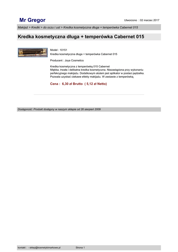 Mr Gregor Utworzono : 02 marzec 2017 Makijaż > Kredki > do oczu i ust > Kredka kosmetyczna długa + temperówka Cabernet 015 Kredka kosmetyczna długa + temperówka Cabernet 015 Model : 10151 Kredka kosmetyczna długa + temperówka Cabernet 015 Producent : Joya Cosmetics Kredka kosmetyczna z temperówką 015 Cabernet Miękka, trwała i delikatna kredka kosmetyczna. Niezastąpiona przy wykonaniu perfekcyjnego makijażu. Dodatkowym atutem jest aplikator w postaci pędzelka. Pozwala uzyskać ciekawe efekty makijażu. W zestawie z temperówką. Cena : 6,30 zł Brutto ( 5,12 zł Netto) Dostępność: Produkt dostępny w naszym sklepie od 26 sierpień 2009 kontakt : - [email protected] Strona 1