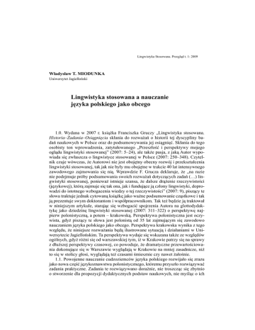 Lingwistyka Stosowana. Przegląd t. 1: 2009 61 Władysław T. MIODUNKA Uniwersytet Jagielloński Lingwistyka stosowana a nauczanie języka polskiego jako obcego 1.0. Wydana w 2007 r. książka Franciszka Gruczy „Lingwistyka stosowana. Historia–Zadania–Osiągnięcia skłania do rozważań o historii tej dyscypliny badań naukowych w Polsce oraz do podsumowywania jej osiągnięć. Skłania do tego osobisty ton wprowadzenia, zatytułowanego „Przeszłość i perspektywy mojego oglądu lingwistyki stosowanej” (2007: 5–24), ale także pasja, z jaką Autor wypowiada się zwłaszcza o lingwistyce stosowanej w Polsce (2007: 250–348). Czytelnik czuje wówczas, że Autorowi nie jest obojętny obecny rozwój i przekształcenia lingwistyki stosowanej, tak jak nie były mu obojętne w trakcie 40 lat intensywnego zawodowego zajmowania się nią. Wprawdzie F. Grucza deklaruje, że „na razie nie podejmuje próby podsumowania swoich rozważań dotyczących zadań (…) lingwistyki stosowanej, ponieważ istnieje szansa, że dalsze drążenie rzeczywistości (językowej), którą zajmuje się tak ona, jak i fundujące ją człony lingwistyki, doprowadzi do istotnego wzbogacenia wiedzy o tej rzeczywistości” (2007: 9), piszący te słowa traktuje jednak cytowaną książkę jako ważne podsumowanie cząstkowe i tak ją prezentuje swym doktorantom i współpracownikom. Tak też będzie ją traktował w niniejszym artykule, starając się wzbogacić spojrzenia Autora na glottodydaktykę jako dziedzinę lingwistyki stosowanej (2007: 311–322) o perspektywę najpierw polonistyczną, a potem – krakowską. Perspektywa polonistyczna jest oczywista, gdyż piszący te słowa jest polonistą od 35 lat zajmującym się zawodowo nauczaniem języka polskiego jako obcego. Perspektywa krakowska wynika z tego względu, że niniejsze rozważania będą ilustrowane sytuacją i działaniami w Uniwersytecie Jagiellońskim. Ta perspektywa wydaje się wskazana także ze względów ogólnych, gdyż różni się od warszawskiej tym, iż w Krakowie patrzy się na sprawy z dłuższej perspektywy czasowej, co powoduje, że dramatyczne przewartościowania dokonujące się w Warszawie wyglądają w Krakowie na mniej zasadnicze, niż to się w stolicy głosi, wyglądają też czasami śmiesznie czy nawet żałośnie. 1.1. Powojenne nauczanie cudzoziemców języka polskiego rozwijało się zrazu jako nowa część językoznawstwa polonistycznego, któremu przyszło rozwiązywać zadania praktyczne. Zadania te rozwiązywano doraźnie, nie troszcząc się zbytnio o stworzenie dla propozycji dydaktycznych podstaw naukowych, nie myśląc o ich 62 WŁADYSŁAW T. MIODUNKA korekcie w oparciu o badania naukowe. Tak powstawały pierwsze ośrodki kształcenia cudzoziemców w Polsce: znany w świecie Instytut Języka i Kultury Polskiej „Polonicum” Uniwersytetu Warszawskiego (1956), przez wiele lat największa placówka tego typu w Polsce, Studium Języka Polskiego dla Cudzoziemców Uniwersytetu Łódzkiego (1958) czy wreszcie Szkoła Letnia Języka i Kultury Polskiej Uniwersytetu Jagiellońskiego (1970), która później, bo w 1976 r., weszła w skład Instytutu Badań Polonijnych UJ (W. Miodunka 1999: 34–48). „Polonicum” było ośrodkiem specjalizującym się w kształceniu slawistów i polonistów zagranicznych, łódzkie Studium – ośrodkiem przygotowywania do studiów w Polsce studentów w krajów tzw. Trzeciego Świata, krakowska Szkoła Letnia zaś – ośrodkiem kształcącym młodzież polskiego pochodzenia, głównie z Ameryki i Europy Zachodniej. Mimo że kształcenie każdej z tych grup było oparte na innych, ważnych w owym czasie, podstawach ideologicznych, powoli stawało się jasne, że kształcenie cudzoziemców w Polsce traci swój doraźny charakter, stając się stałą częścią działalności akademickiej polskich uczelni, w wyniku czego powinno uzyskać zarówno odpowiedni status organizacyjny, jak i podstawy naukowe. 1.2. Wyliczone tu instytucje nauczające cudzoziemców języka polskiego nie obejmują wszystkich form kształcenia w zakresie nauczania języka polskiego jako obcego i drugiego. Wszystkie formy istniejące w latach 1948–1982 dokumentuje w swej monografii Nauczanie języka polskiego cudzoziemców w Polsce Jan Lewandowski (1985: 19–33), który w zakończeniu swej pracy proponuje podział „kształtowania się metodyki nauczania języka polskiego jako obcego w Polsce powojennej” na cztery okresy: 1. okres I w latach 1948/1952–1961, który nazywa okresem metodyki przednaukowej lub intuicyjnej; 2. okres II w latach 1962–1970, nazwany przez niego „okresem prekursorów, a także okresem postulatywnym”; 3. okres III w latach 1971–1982 to – jego zdaniem – „okres pełnego rozwoju metodyki teoretycznej”; 4. okres IV w latach 1981–1985 związany z realizacją ogólnopolskiego programu badań „Nauczanie języka polskiego jako obcego” (J. Lewandowski 1985: 241–242). Przypominając tu podział chronologiczny kształtowania się dydaktyki języka polskiego jako obcego J. Lewandowskiego, zdajemy sobie sprawę, że obecnie patrzymy na tę samą rzeczywistość z perspektywy o 25 lat dłuższej, która musi zmieniać ocenę faktów uznawanych na początku lat 80. za decydujące w wyróżnieniu poszczególnych okresów. Ta perspektywa musi się zmienić jeszcze bardziej, jeśli weźmiemy pod uwagę wszystkie zmiany społeczno-polityczne, które dokonały się w Polsce w drugiej połowie lat 80., nie wspominając już o wejściu Polski do Unii Europejskiej w 2004 r., co jeszcze bardziej zmieniło nasze spojrzenie na polską dydaktykę języków obcych, dodając do tego spojrzenia perspektywę europejską (zob. H. Komorowska 2007). LINGWISTYKA STOSOWANA A NAUCZANIE JĘZYKA POLSKIEGO JAKO OBCEGO 63 Monografia J. Lewandowskiego nie traci jednak swego znaczenia jako jedyne źródło wiedzy o nauczaniu języka polskiego jako obcego, źródło tym ważniejsze, że dysponuj