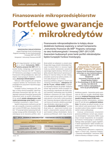 Ludzie i pieniądze I rynek bankowy Finansowanie mikroprzedsiębiorstw Portfelowe gwarancje mikrokredytów magdalena Małachowska ekspert Krajowego Punktu Kontaktowego Programu ramowego na rzecz konkurencyjności i innowacji 2007–2013 (CIP). Komponent: Instrumenty Finansowe dla MŚP B anki mogą skorzystać z tej formy wsparcia w ramach Instrumentu SMEG – Systemu poręczeń dla MŚP (SME Guarantee Facility), dostępnego w komponencie „Instrumenty Finansowe dla MŚP” Programu CIP. Mechanizmy pozwalające na aktywniejsze finansowanie mikroprzedsiębiorstw, także tych dopiero rozpoczynających działalność, zawiera opcja „Gwarancje mikrokredytów”. Głównym celem programu jest zachęcenie i wsparcie banków do finansowania mikroprzedsiębiorców pożyczkami nieprzekraczającymi 25 000 euro. Europejski Fundusz Inwestycyjny (EFI), działając w imieniu Komisji Europejskiej, ułatwił bezpieczniejsze finansowanie tego typu firm, udostępniając instytucjom finansowym gwarancje dla budowanych przez nie portfeli mikrokredytów. W ten sposób została zabezpieczona część ryzyka ponoszonego przez banki związana z transakcjami zawieranymi z małymi firmami. Sposób funkcjonowania mechanizmu jest taki sam, jak w przypadku omawianej w październikowym numerze MF BANK opcji „Gwarancje kredytów”. EFI przyznaje bankowi gwarancję dla budowanego nowego portfela mikrokredytów. Ten zaś zobowiązuje się do stworzenia portfela o okre- Finansowanie mikroprzedsiębiorstw to kolejny obszar działalności bankowej wspierany w ramach komponentu „Instrumenty Finansowe dla MŚP” Programu ramowego na rzecz konkurencyjności i innowacji 2007–2013 (CIP). Gwarantem budowanych przez banki portfeli mikrokredytów będzie Europejski Fundusz Inwestycyjny. ślonej wartości we wskazanym w umowie czasie. W jego skład mogą wchodzić mikrokredyty finansujące inwestycje (także te w rzeczowy majątek trwały czy wartości niematerialne i prawne) lub zapewniające kapitał obrotowy. Minimalny okres spłaty pożyczek obejmowanych gwarancją portfelową nie może być krótszy niż sześć miesięcy, priorytetem powinny być jednak produkty o terminie spłaty dłuższym niż 12 miesięcy. Gwarancja portfelowa, dostępna w ramach opcji „Gwarancje mikrokredytów”, zabezpiecza nawet do 75 proc. wkładu banku w pojedynczy mikrokredyt włączony do portfela. Ostateczną wartość tego parametru określa Europejski Fundusz Inwestycyjny indywidualnie dla każdej instytucji finansowej i budowanego przez nią portfela. Dodatkowo wskazywana jest także maksymalna kwota wypłat gwarancyjnych, jaką EFI będzie mógł wykonać na rzecz banku z tytułu powstałych strat. Gwarancja obowiązuje maksymalnie pięć lat i jest liczona od momentu udzielenia poszczególnego mikrokredytu włączonego do portfela. Opcja „Gwarancje mikrokredytów” ma także drugi ważny cel – ograniczenie trudności związanych z proporcjonalnie wyższymi jednostkowymi kosztami obsługi mikrokredytów. Oprócz gwarancji portfelowych, banki mogą otrzymać Rys 1. Opcja „Gwarancje mikrokredytów” – podstawowe korzyści dla banków GWARANCJE MIKROKREDYTÓW – WSPARCIE BANKÓW W FINANSOWANIU MIKROPRZEDSIĘBIORSTW Gwarancja portfelowa – podział ryzyka – EFI i bank 50 000 euro – bezzwrotne wsparcie techniczne dla banku Bez opłaty gwarancyjnej – bez żadnych prowizji, bez żadnych kosztów Źródło: KPK. 32| Informacji w zakresie „Instrumentów Finansowych dla MŚP” Programu CIP udziela: Krajowy Punkt Kontaktowy Programu ramowego na rzecz konkurencyjności i innowacji 2007–2013 (CIP) Komponent: Instrumenty Finansowe dla MŚP Związek Banków Polskich ul. Kruczkowskiego 8, 00-380 Warszawa, tel./faks: 022 696 64 95 infolinia mailowa: [email protected], www.cip.gov.pl/eip/kpkzbp dodatkowe wsparcie – bezzwrotne granty wynoszące do 200 euro na jeden mikrokredyt objęty gwarancją. Instytucja finansowa może w ten sposób otrzymać nawet 50 000 euro. Gwarancja portfela mikrokredytów, udzielana przez EFI, jest dla banku praktycznie bezkosztowa. Nie pobiera się żadnych prowizji, nie ma także żadnych opłat gwarancyjnych. Banki muszą jedynie pokryć koszty związane z przygotowaniem wniosku aplikacyjnego. Instytucje zainteresowane otrzymaniem gwarancji portfelowej w ramach opcji „Gwarancje mikrokredytów” Instrumentu SMEG muszą złożyć wniosek bezpośrednio do Europejskiego Funduszu Inwestycyjnego w Luksemburgu. Aplikację należy sporządzić w języku angielskim, w dwóch egzemplarzach. Nabór wniosków prowadzony jest w trybie ciągłym (nie obowiązują tutaj rundy aplikacyjne). Przebieg procesu aplikowania o wsparcie dostępne w ramach opcji „Gwarancje kredytów” i „Gwarancje mikrokredytów” Instrumentu SMEG zostanie omówiony w kolejnym numerze. miesięcznik finansowy bank | listopad | 2009
