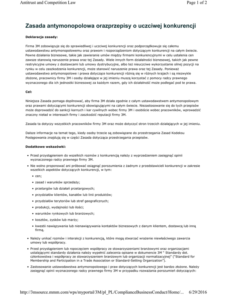 Antitrust and Competition Law Page 1 of 2 Zasada antymonopolowa orazprzepisy o uczciwej konkurencji Deklaracja zasady: Firma 3M zobowiązuje się do sprawiedliwej i uczciwej konkurencji oraz podporządkowuje się całemu ustawodawstwu antymonopolowemu oraz prawom i rozporządzeniom dotyczącym konkurencji na całym świecie. Pewne działania biznesowe, takie jak zawieranie umów między firmami konkurencyjnymi w celu ustalenia cen zawsze stanowią naruszenie prawa oraz tej Zasady. Wiele innych form działalności biznesowej, takich jak pewne restrykcyjne umowy z dostawcami lub umowy dystrybucyjne, albo też nieuczciwe wykorzystanie silnej pozycji na rynku w celu zaszkodzenia konkurencji, może stanowić naruszenie prawa oraz tej Zasady. Ponieważ ustawodawstwo antymonopolowe i prawa dotyczące konkurencji różnią się w różnych krajach i są niezwykle złożone, pracownicy firmy 3M i osoby działające w jej imieniu muszą korzystać z pomocy radcy prawnego wyznaczonego dla ich jednostki biznesowej za każdym razem, gdy ich działalność może podlegać pod te prawa. Cel: Niniejsza Zasada pomaga dopilnować, aby firma 3M działa zgodnie z całym ustawodawstwem antymonopolowym oraz prawami dotyczącymi konkurencji obowiązującymi na całym świecie. Niezastosowanie się do tych przepisów może doprowadzić do sankcji karnych i kar cywilnych wobec firmy 3M i osobiście wobec pracowników, wprowadzić znaczny nieład w interesach firmy i zaszkodzić reputacji firmy 3M. Zasada ta dotyczy wszystkich pracowników firmy 3M oraz może dotyczyć stron trzecich działających w jej imieniu. Dalsze informacje na temat tego, kiedy osoby trzecie są zobowiązane do przestrzegania Zasad Kodeksu Postępowania znajdują się w części Zasada dotycząca przestrzegania przepisów. Dodatkowe wskazówki: • Przed przystąpieniem do wszelkich rozmów z konkurencją należy z wyprzedzeniem zasięgnąć opinii wyznaczonego radcy prawnego firmy 3M. • Nie wolno proponować ani próbować osiągnąć porozumienia z żadnym z przedstawicieli konkurencji w zakresie wszelkich aspektów dotyczących konkurencji, w tym: • cen; • zasad i warunków sprzedaży; • przetargów lub działań przetargowych; • przydziałów klientów, kanałów lub linii produktów; • przydziałów terytoriów lub stref geograficznych; • produkcji, wydajności lub ilości; • warunków rynkowych lub branżowych; • kosztów, zysków lub marży; • kwestii nawiązywania lub nienawiązywania kontaktów biznesowych z danym klientem, dostawcą lub inną firmą. • Należy unikać rozmów i interakcji z konkurencją, które mogą stwarzać wrażenie niewłaściwego zawarcia umowy lub współpracy. • Przed przystąpieniem lub ropoczęciem współpracy ze stowarzyszeniami branżowymi oraz organizacjami ustalającymi standardy działania należy wypełnić zalecenia opisane w dokumencie 3M “ Standardy dot. członkowstwa i współpracy ze stowarzyszeniem branżowym lub organizacji normalizacyjnej” (“Standard for Membership and Participation in a Trade Association or Standard-Setting Organization”). • Zastosowanie ustawodawstwa antymonopolowego i praw dotyczących konkurencji jest bardzo złożone. Należy zasięgnąć opinii wyznaczonego radcy prawnego firmy 3M w przypadku rozważania porozumień dotyczących: http://3msource.mmm.com/wps/myportal/3M/pl_PL/ComplianceBusinessConduct/Home/... 6/29/2016 Antitrust and Competition Law Page 2 of 2 • zawierania umów na wyłączność sprzedaży lub zakupu; • relacji lub zakończenia relacji z dostawcami; • selektywnego obniżania cen; • sprzedaży wiązanej towarów i usług; • ograniczeń w odsprzedaży produktów lub usług firmy 3M; • umów licencyjnych dotyczących technologii, które nakładają ograniczenia na licencjobiorcę lub licencjodawcę; • działań lub programów zaprojektowanych w celu uzyskania lub utrzymania dominującej pozycji na rynku. Kary: Niezastosowanie się do ustawodawstwa antymonopolowego i prawa konkurencji może zaszkodzić reputacji firmy 3M i doprowadzić do zastosowania sankcji karnych i kar cywilnych wobec firmy 3M i osobiście wobec pracownika oraz wprowadzić znaczny nieład w działaniach biznesowych firmy. Naruszenie Kodeksu Postępowania firmy 3M spowoduje kary dyscyplinarne, ze zwolnieniem z pracy włącznie. http://3msource.mmm.com/wps/myportal/3M/pl_PL/ComplianceBusinessConduct/Home/... 6/29/2016
