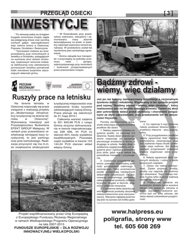 PRZEGLĄD OSIECKI [3] INWESTYCJE * Po zimowej walce ze śniegiem brygada remontowa Urzędu zajęła się pielęgnacją drzew oraz wycinką suchych gałęzi. Uporządkowano więc zielone tereny w Osiecznej, Popowie, Grodzisku i Świerczynie. * Tymczasem malarze po przeprowadzeniu prac remontowych w świetlicy w Grodzisku, polegających na wymianie okuć stolarki drzwiowej, częściowym remoncie instalacji elektrycznej oraz odmalowaniu pomieszczeń świetlicy pomalowali klatki schodowe budynków stanowiących własność gminy. * W Drzeczkowie przy przedszkolu wykonano, zakupiono i zamontowano nowy zbiornik bezoodpływowy na ścieki, w świetlicy natomiast wykonano remont kanalizacji. W przedszkolu został też wymieniony piec centralnego ogrzewania. * Gmina zakupiła bus transporter z przyczepką na potrzeby przewozu osób i sprzętu, wykorzystywanego przy remontach i budowach przeprowadzanych przez pracowników Urzędu. Ruszyły prace na letnisku Na terenie letniska w Osiecznej rozpoczęły się prace związane z realizacją projektu pn.,,Modernizacja infrastruktury turystycznej na terenie letniska w Osiecznej”. Wykonawcą inwestycji jest Przedsiębiorstwo Budowlane EFEKT GROUP Malepszy. W ramach prac przewidziano rewitalizację istniejącej bazy turystycznej, to jest parkingu oraz pola namiotowego. Realizacja przyczynić się ma m.in. do zwiększenia atrakcyjności turystycznej miejscowości oraz zwiększenia liczby turystów odwiedzających naszą Gminę. Prace planuje się zakończyć do 31 maja 2010 r. Całkowita wartość zadania to 351 840,68 PLN z czego Gmina otrzyma dofinansowanie w kwocie nieprzekraczającej 228 696, 44 PLN co stanowi 65% kwoty wydatków kwalifikowalnych. Pozostała część wydatków w kwocie 123 144,24 PLN stanowi wkład własny Gminy. Projekt współfinansowany przez Unię Europejską z Europejskiego Funduszu Rozwoju Regionalnego w ramach Wielkopolskiego Programu Operacyjnego na lata 2007-2013 FUNDUSZE EUROPEJSKIE – DLA ROZWOJU INNOWACYJNEJ WIELKOPOLSKI Bądźmy zdrowi wiemy, więc działamy Już po raz kolejny zamieszczamy informacje o racjonalnym żywieniu dzieci i młodzieży. Wspieramy w ten sposób projekt pod nazwą "Bądźmy zdrowi - wiemy, więc działamy", który realizowany jest na terenie naszego powiatu. Celem tej akcji jest uchronienie dzieci przed otyłością i chorobami związanymi ze złym odżywianiem, oraz przekonanie ich do aktywności fizycznej. Poniżej zamieszczamy wskazówki dotyczące przygotowywania posiłków dla dzieci. 1. Należy zapewnić dziecku regularne posiłki, co najmniej 4-5 dziennie. Każdy dzień dziecko powinno rozpocząć od zjedzenia pierwszego śniadania w domu, a drugiego w szkole. Należy dbać o estetyczny wygląd posiłków, ich regularne pory i spokojną atmosferę przy stole, gdyż ma to wpływ na prawidłowe trawienie i przyswajanie. 2. Codzienne pożywienie powinno zawierać różnorodną żywność pochodzenia roślinnego i zwierzęcego. Tylko urozmaicone posiłki dostarczają niezbędnych składników odżywczych. Do planowania codziennego jadłospisu należy wybierać produkty niskokaloryczne, bogate w błonnik, witaminy i składniki mineralne. 3. Codzienna dieta dziecka powinna zawierać produkty zbożowe niskoprzetworzone oraz warzywa i owoce. Warzywa najlepiej powinno się jeść na surowo lub krótko goto- wane. 4. Co najmniej 3 razy dziennie należy podawać dziecku mleko i przetwory mleczne - sery, jogurty, kefiry. 5. Przy przygotowaniu posiłków należy ograniczać ilość tłuszczu pochodzenia zwierzęcego oraz soli, wybierać mięso chude i preferować oleje roślinne. Sól można zastąpić przyprawami ziołowymi (należy organiczać ostre przyprawy). 6. Należy ograniczyć ilość zjadanych słodyczy i cukru, a także słodzonych napojów. 7. Dzieci nie należy przekarmiać. Żaden przymus, prośby, groźby czy nagrody nie powinny być stosowane. Tego rodzaju metody budzą tylko jeszcze większą niechęć do jedzenia. 8. Prawidłowe żywienie we wczesnym okresie życia wywiera decydujący wpływ na zdrowie w wieku dojrzałym. Jedzenie powinno być nie tylko zdrowe, ale także dawać człowiekowi przyjemność. www.halpress.eu poligrafia, strony www tel. 605 608 269