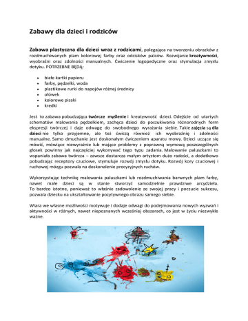 Zabawy dla dzieci i rodziców Zabawa plastyczna dla dzieci wraz z rodzicami, polegająca na tworzeniu obrazków z rozdmuchiwanych plam kolorowej farby oraz odcisków palców. Rozwijanie kreatywności, wyobraźni oraz zdolności manualnych. Ćwiczenie logopedyczne oraz stymulacja zmysłu dotyku. POTRZEBNE BĘDĄ: białe kartki papieru farby, pędzelki, woda plastikowe rurki do napojów różnej średnicy ołówek kolorowe pisaki kredki Jest to zabawa pobudzająca twórcze myślenie i kreatywnośd dzieci. Odejście od utartych schematów malowania pędzelkiem, zachęca dzieci do poszukiwania różnorodnych form ekspresji twórczej i daje odwagę do swobodnego wyrażania siebie. Takie zajęcia są dla dzieci nie tylko przyjemne, ale też dwiczą również ich wyobraźnię i zdolności manualne. Samo dmuchanie jest doskonałym dwiczeniem aparatu mowy. Dzieci uczące się mówid, mówiące niewyraźnie lub mające problemy z poprawną wymową poszczególnych głosek powinny jak najczęściej wykonywad tego typu zadania. Malowanie paluszkami to wspaniała zabawa twórcza – zawsze dostarcza małym artystom dużo radości, a dodatkowo pobudzając receptory czuciowe, stymuluje rozwój zmysłu dotyku. Rozwój kory czuciowej i ruchowej mózgu pozwala na doskonalenie precyzyjnych ruchów. Wykorzystując technikę malowania paluszkami lub rozdmuchiwania barwnych plam farby, nawet małe dzieci są w stanie stworzyd samodzielnie prawdziwe arcydzieła. To bardzo istotne, ponieważ to właśnie zadowolenie ze swojej pracy i poczucie sukcesu, pozwala dziecku na ukształtowanie pozytywnego obrazu samego siebie. Wiara we własne możliwości motywuje i dodaje odwagi do podejmowania nowych wyzwao i aktywności w różnych, nawet niepoznanych wcześniej obszarach, co jest w życiu niezwykle ważne. Smakołyki Stawiamy przed dzieckiem miseczki z różnymi potrawami o charakterystycznym smaku, np. cukier, cytrynę, czekoladę itp. Prosimy dziecko, by zamknęło oczy, a następnie za pomocą zmysłu smaku rozpoznało produkt. Zadanie można utrudnid i poprosid dziecko, by rozpoznało potrawę tylko za pomocą węchu czy dotyku. Lustro Zabawa "Lustro" uczy koncentracji i wzmacnia relacje z partnerem. Uczestnicy dobierają się w pary, jedna osoba jest lustrem, druga przeglądającym się w lustrze. Ćwiczenie polega na tym, że osoba, która gra rolę lustra, musi naśladowad swojego partnera starając się wykonywad takie same gesty. Łaocuch skojarzeo Uczestnicy siadają w kręgu. W środku ustawione są trzy krzesła. Jeden z ochotników siada na środkowym krześle i przedstawia się jako przedmiot lub osoba. Mówi np. „jestem morzem”. Po obu jego stronach siadają dwie inne osoby i przestawiają się również jako przedmiot lub osoba, która kojarzy im się w tym przypadku z „morzem”. Przedstawiają się np. jako „statek” i” ryba”. Teraz „morze musi dokonad wyboru i mówi np. wybieram „statek”. Dwie osoby siadają na swoje miejsca, a „statek” zajmuje środkowe krzesło. Krzesła z jego lewej i prawej strony zajmują np. „żeglarz” i „bocianie gniazdo”. Zabawa jest ciekawa i świetnie porusza wyobraźnie dzieci. Sprawdź jak daleko zaprowadzą was skojarzenia. Uciekająca piłeczka Do zabawy potrzebna będzie mała, lekka piłka i prześcieradło/płachta. Uczestnicy chwytają materiał i unoszą go nad ziemię. Następnie opiekun wrzuca na środek płachty piłeczkę. Zadaniem uczestników jest wprowadzenie materiału w ruch i dopilnowanie, by piłeczka nie spadła.