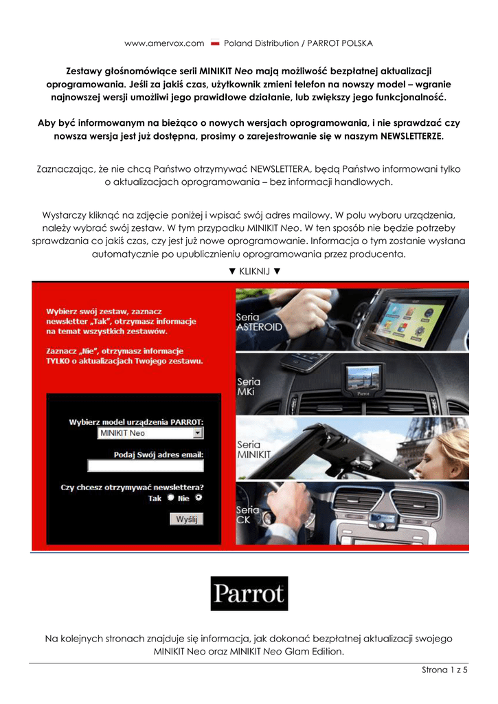 www.amervox.com Poland Distribution / PARROT POLSKA Zestawy głośnomówiące serii MINIKIT Neo mają możliwość bezpłatnej aktualizacji oprogramowania. Jeśli za jakiś czas, użytkownik zmieni telefon na nowszy model – wgranie najnowszej wersji umożliwi jego prawidłowe działanie, lub zwiększy jego funkcjonalność. Aby być informowanym na bieżąco o nowych wersjach oprogramowania, i nie sprawdzać czy nowsza wersja jest już dostępna, prosimy o zarejestrowanie się w naszym NEWSLETTERZE. Zaznaczając, że nie chcą Państwo otrzymywać NEWSLETTERA, będą Państwo informowani tylko o aktualizacjach oprogramowania – bez informacji handlowych. Wystarczy kliknąć na zdjęcie poniżej i wpisać swój adres mailowy. W polu wyboru urządzenia, należy wybrać swój zestaw. W tym przypadku MINIKIT Neo. W ten sposób nie będzie potrzeby sprawdzania co jakiś czas, czy jest już nowe oprogramowanie. Informacja o tym zostanie wysłana automatycznie po upublicznieniu oprogramowania przez producenta. ▼ KLIKNIJ ▼ Na kolejnych stronach znajduje się informacja, jak dokonać bezpłatnej aktualizacji swojego MINIKIT Neo oraz MINIKIT Neo Glam Edition. Strona 1 z 5 www.amervox.com Poland Distribution / PARROT POLSKA PROCEDURA AKTUALIZACJI PRZENOŚNEGO ZESTAWU GŁOŚNOMÓWIĄCEGO MINIKIT Neo Glam Edition oraz MINIKIT Neo KROK 1 Na stronie amervox.com przejdź do zakładki Pobierz w kategorii Wsparcie. KROK 2 Pobierz plik aktualizacyjny klikając na Język zestawu (MINIKIT Neo) w dziale Pliki aktualizacyjne. KROK 3 Wybierz opcję Zapisz i kliknij OK. Strona 2 z 5 www.amervox.com Poland Distribution / PARROT POLSKA KROK 4 Po pobraniu pliku w oknie Pobieranie plików kliknij MINIKIT_Neo_Update_PLPL.plf i wybierz opcję Otwórz folder zapisu. prawym klawiszem na Po kliknięciu otworzy się folder, w którym zapisałeś plik. KROK 5 Włącz MINIKIT Neo KROK 6 Wciśnij i przekręć przycisk pokrętła aż trafisz do menu o nazwie Aktualizacja. Aktualizacja. Strona 3 z 5 www.amervox.com Poland Distribution / PARROT POLSKA KROK 7 Następnie przyciśnij przycisk pokrętła, by przejść do trybu aktualizacji. Zestaw potwierdzi gotowość do aktualizacji. Oczekiwanie na aktualizację. KROK 8 Korzystając z przewodu dostarczonego w zestawie (miniUSB/USB) podłącz zestaw MINIKIT Neo do komputera. KROK 9 Komputer wykryje zestaw jako „Urządzenie pamięci masowej USB”. Po prostu skopiuj plik z aktualizacją (z katalogu, do którego został pobrany) do zestawu MINIKIT Neo. Strona 4 z 5 www.amervox.com Poland Distribution / PARROT POLSKA KROK 10 Usuń bezpiecznie urządzenie z systemu. Następnie odłącz przewód miniUSB/USB od zestawu. KROK 11 Zestaw poinformuje o rozpoczęciu aktualizacji. Trwa aktualizacja. Proszę czekać. KROK 12 Po kilku minutach użytkownik zostanie poinformowany o zakończeniu aktualizacji komunikatem Aktualizacja oprogramowania powiodła się. Aktualizacja oprogramowania powiodła się. Więcej informacji na temat aktualizacji oprogramowania można uzyskać kontaktując się z serwisem e-mailowo lub pod poniższym numerem telefonu. KONTAKT: e-mail: [email protected] e-mail: [email protected] Tel.: 41/368 30 66 Strona 5 z 5