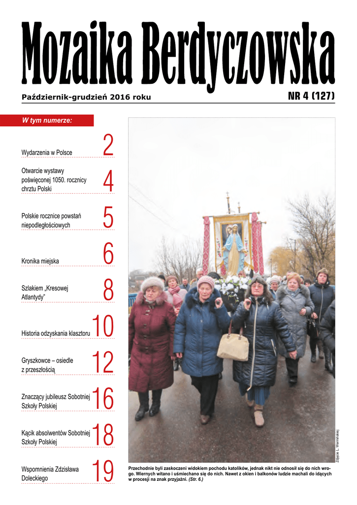 Październik-grudzień 2016 roku NR 4 (127) Wydarzenia w Polsce Otwarcie wystawy poświęconej 1050. rocznicy chrztu Polski Polskie rocznice powstań niepodległościowych Kronika miejska Szlakiem „Kresowej Atlantydy” Historia odzyskania klasztoru Gryszkowce – osiedle z przeszłością Znaczący jubileusz Sobotniej Szkoły Polskiej Kącik absolwentów Sobotniej Szkoły Polskiej Wspomnienia Zdzisława Doleckiego 2 4 5 6 8 10 12 16 18 19 Zdjęcie L. Wermińskiej W tym numerze: Przechodnie byli zaskoczeni widokiem pochodu katolików, jednak nikt nie odnosił się do nich wrogo. Wiernych witano i uśmiechano się do nich. Nawet z okien i balkonów ludzie machali do idących w procesji na znak przyjaźni. (Str. 6.) Wydarzenia w Polsce X-XII 2016 D o poważnego kryzysu parlamentarnego doszło 16 grudnia. Najpierw doszło do sporu między większością rządową i opozycją w sprawie ograniczenia praw poruszania się dziennikarzy w Sejmie. Gdy podczas debaty budżetowej głos zabierał poseł Mariusz Szczerba (Platforma Obywatelska), marszałek Sejmu Marek Kuchciński wykluczył go z obrad. W odpowiedzi, opozycja (posłowie Platformy Obywatelskiej i partii Nowoczesna) zablokowali trybunę i fotel marszałka. Przerwa trwała kilka godzin. Przez cały ten czas duża grupa posłów stała przy mównicy, a później także przy fotelu marszałka. Zebrała się również komisja regulaminowa i spraw poselskich, która rozpatrywała odwołanie posła Szczerby od wykluczenia go z obrad Sejmu. Komisja zarekomendowała negatywnie ten wniosek dla Prezydium Sejmu. O godzinie 21.30. pojawiły się na telebimach na sali plenarnej informacje, że obrady przeniesiono do Sali Kolumnowej. Część posłów opozycji była przeszła do Sali Kolumnowej, ale nie brała udziału w obradach, zarzucali oni jednocześnie, że podczas głosowań nie ma kworum; oceniono, że głosowania były nielegalne. W głosowaniach na Sali Kolumnowej posłowie w nich uczestniczący uchwalili budżet na 2017 r., wcześniej odrzucony został blok poprawek opozycji, zaakceptowano blok poprawek zgłoszony przez Prawo i Sprawiedliwość. Posłowie uczestniczący w obradach, głosowali przez podniesienie ręki. W głosowaniu nad budżetem na 2017 rok udział wzięło 236 posłów, za jego uchwaleniem było 234, przeciw 2, nikt się nie wstrzymał - takie informacje podał marszałek Sejmu Marek Kuchciński po głosowaniu. Klub PiS liczy 234 posłów. Dziennikarze nie byli obecni na sali Sali Kolumnowej, stali przed wejściem do niej; obrady były transmitowane na stronie internetowej Sejmu. Platforma Obywatelska, Nowoczesna i Polskie Stronnictwo Ludowe zażądały od marszałka Kuchcińskiego zwołania na 20 grudnia posiedzenia Sejmu „uznając za nielegalne obrady w Sali Kolumnowej”. Liderzy tych trzech ugrupowań wystosowali pismo w tej sprawie do marszałka Sejmu. Z kolei przed Sejmem zgromadzili się demonstranci popierający opozycję. Część z nich zablokowała wyjścia z Sejmu, przez co posłowie PiS mieli problem z opuszczeniem parlamentu. Sejm przyjął „Deklarację Pamięci i Solidarności” Polski i Ukrainy – analogiczny apel uchwaliła Rada Najwyższa Ukrainy. Przed głosowaniami najostrzej sprzeciwiali się poparciu uchwały posłowie niezrzeszeni: Janusz Sanocki oraz Ro- 2 W Przemyślu odbył się „Marsz Orląt Przemyskich i Lwowskich” upamiętniający 98. rocznicę bitwy pod Niżankowicami (podczas wojny polsko-ukraińskiej) bert Winnicki (ten ostatni związany ze środowiskami narodowymi). Ostatecznie „za” było 367 posłów obecnych na sali, 44 „przeciw”, a 14 wstrzymało się. Najwięcej przeciwników było w klubie Kukiz’15 – żaden z jego członków nie poparł dokumentu. Z kolei cała Nowoczesna oraz Platforma Obywatelska (1 poseł się wstrzymał – red.) poparły dokument. 211 obecnych na sali posłów PiS również było za przyjęciem tekstu, 3 „przeciw”, a 7 się wstrzymało. W dokumencie czytamy: „Wspólnie i jednocześnie przyjmujemy niniejszą Deklarację Pamięci i Solidarności, aby oddać hołd milionom ofiar poniesionych przez nasze narody w czasie II wojny światowej oraz potępić zewnętrznych agresorów, którzy próbowali zniszczyć naszą niepodległość”. Uchwała parlamentów Polski i Ukrainy przypomina tragiczne w skutkach dla obu narodów podpisanie Paktu Ribbentrop-Mołotow, a także potępia akty agresji w historii najnowszej. Uderza również w agresywną politykę Rosji wobec Ukrainy. W Przemyślu odbył się „Marsz Orląt Przemyskich i Lwowskich” upamiętniający 98. rocznicę bitwy pod Niżankowicami (podczas wojny polsko-ukraińskiej), w której życie oddali młodzi harcerze i uczniowie z Przemyśla i okolic. W akcji wzięli udział lokalni politycy, aktywiści społeczni, historycy, środowiska patriotyczne i wszyscy dla których ważna jest pamięć o poległej w obronie ojczyzny młodzieży. Główne obchody miały miejsce pod pomnikiem Orląt Przemyskich. W swoim wystąpieniu prezydent Przemyśla Robert Choma podkreślił, że młodzi ludzie poświęcili swoje życie „byśmy mogli żyć w wolnej Polsce, prawo do pamiętania o tym, że Lwów kiedyś był polskim miastem, z określoną tradycją, historią i stanowił nieodłączny element Rzeczpospolitej, wspaniałe miasto, które miało swoich bohaterów, pisarzy, naukowców. Te miasta obok siebie, rozdzielone dziś granicą nie mogą przecież powodować tego, że rośnie w nas nienawiść. Ten dzisiejszy marsz nie był przeciw czemuś, był to symbol pamięci Orląt przemyskich i lwowskich.” Gdy maszerująca kolumna mijała Ukraiński Dom Ludowy, jeden z uczestników krzyknął: „Śmierć Ukraińcom!”, co było później szeroko komentowane w Polsce i na Ukrainie, a ambasada Ukrainy w Warszawie złożyła protest. Dwa lata temu podczas podobnego wydarzenia uczestnicy pochodu, mijając Ukraiński Dom Ludowy, skandowali: „Znajdzie się kij na banderowski ryj!” a półtora roku