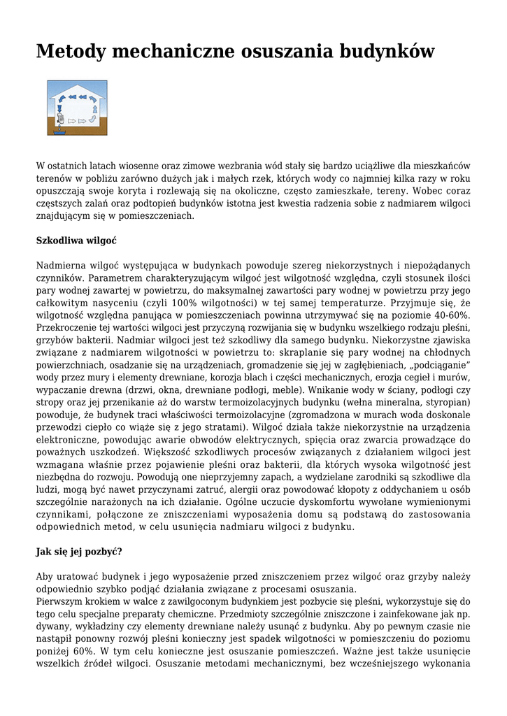 Metody mechaniczne osuszania budynków W ostatnich latach wiosenne oraz zimowe wezbrania wód stały się bardzo uciążliwe dla mieszkańców terenów w pobliżu zarówno dużych jak i małych rzek, których wody co najmniej kilka razy w roku opuszczają swoje koryta i rozlewają się na okoliczne, często zamieszkałe, tereny. Wobec coraz częstszych zalań oraz podtopień budynków istotna jest kwestia radzenia sobie z nadmiarem wilgoci znajdującym się w pomieszczeniach. Szkodliwa wilgoć Nadmierna wilgoć występująca w budynkach powoduje szereg niekorzystnych i niepożądanych czynników. Parametrem charakteryzującym wilgoć jest wilgotność względna, czyli stosunek ilości pary wodnej zawartej w powietrzu, do maksymalnej zawartości pary wodnej w powietrzu przy jego całkowitym nasyceniu (czyli 100% wilgotności) w tej samej temperaturze. Przyjmuje się, że wilgotność względna panująca w pomieszczeniach powinna utrzymywać się na poziomie 40-60%. Przekroczenie tej wartości wilgoci jest przyczyną rozwijania się w budynku wszelkiego rodzaju pleśni, grzybów bakterii. Nadmiar wilgoci jest też szkodliwy dla samego budynku. Niekorzystne zjawiska związane z nadmiarem wilgotności w powietrzu to: skraplanie się pary wodnej na chłodnych powierzchniach, osadzanie się na urządzeniach, gromadzenie się jej w zagłębieniach, „podciąganie” wody przez mury i elementy drewniane, korozja blach i części mechanicznych, erozja cegieł i murów, wypaczanie drewna (drzwi, okna, drewniane podłogi, meble). Wnikanie wody w ściany, podłogi czy stropy oraz jej przenikanie aż do warstw termoizolacyjnych budynku (wełna mineralna, styropian) powoduje, że budynek traci właściwości termoizolacyjne (zgromadzona w murach woda doskonale przewodzi ciepło co wiąże się z jego stratami). Wilgoć działa także niekorzystnie na urządzenia elektroniczne, powodując awarie obwodów elektrycznych, spięcia oraz zwarcia prowadzące do poważnych uszkodzeń. Większość szkodliwych procesów związanych z działaniem wilgoci jest wzmagana właśnie przez pojawienie pleśni oraz bakterii, dla których wysoka wilgotność jest niezbędna do rozwoju. Powodują one nieprzyjemny zapach, a wydzielane zarodniki są szkodliwe dla ludzi, mogą być nawet przyczynami zatruć, alergii oraz powodować kłopoty z oddychaniem u osób szczególnie narażonych na ich działanie. Ogólne uczucie dyskomfortu wywołane wymienionymi czynnikami, połączone ze zniszczeniami wyposażenia domu są podstawą do zastosowania odpowiednich metod, w celu usunięcia nadmiaru wilgoci z budynku. Jak się jej pozbyć? Aby uratować budynek i jego wyposażenie przed zniszczeniem przez wilgoć oraz grzyby należy odpowiednio szybko podjąć działania związane z procesami osuszania. Pierwszym krokiem w walce z zawilgoconym budynkiem jest pozbycie się pleśni, wykorzystuje się do tego celu specjalne preparaty chemiczne. Przedmioty szczególnie zniszczone i zainfekowane jak np. dywany, wykładziny czy elementy drewniane należy usunąć z budynku. Aby po pewnym czasie nie nastąpił ponowny rozwój pleśni konieczny jest spadek wilgotności w pomieszczeniu do poziomu poniżej 60%. W tym celu konieczne jest osuszanie pomieszczeń. Ważne jest także usunięcie wszelkich źródeł wilgoci. Osuszanie metodami mechanicznymi, bez wcześniejszego wykonania izolacji przeciwwilgociowych, spowoduje że wilgoć po pewnym czasie powróci. Nawet wykonanie samych izolacji przeciwwilgociowych poziomych i pionowych, przy małym poziomie zawilgocenia, może spowodować, że po pewnym czasie budynek wyschnie w sposób naturalny. Osuszanie to proces usuwania wody z głębi lub z powierzchni wszelkiego rodzaju materiałów wykorzystując właściwości fizyczne wody. Najprostszym rozwiązaniem jest suszenie naturalne czyli intensywne wietrzenie pomieszczenia, dzięki otwartym drzwiom i oknom oraz kratkach wentylacyjnych ustawionych na maksymalny przepływ powietrza. Takie suszenie jest jednak długotrwałe i zależne od warunków pogodowych. Suche, słoneczne i wietrzne dni są sprzymierzeńcem, natomiast podczas opadów kiedy rośnie zawartość wilgoci w powietrzu zewnętrznym można nawet pogorszyć sytuację w suszonych pomieszczeniach. Osuszanie naturalne Działanie metod nieinwazyjnych opiera się na zasadach osuszania naturalnego. Proces naturalnego osuszania pomieszczeń jest złożony i zależy zarówno od wilgotności i temperatury panującej wewnątrz i na zewnątrz budynków, jak i od rodzaju oraz konstrukcji przegród budowlanych. Poza zapewnieniem odpowiedniej wentylacji ważne jest, szczególnie w okresie zimowym, podniesienie temperatury panującej w pomieszczeniu, ponieważ w powietrzu cieplejszym mieści się więcej pary wodnej niż w powietrzu zimniejszym, przy tym samym ciśnieniu. Ochłodzenie powodowałoby nasycenie powietrza parą wodna i jej kondensację, która objawiałaby się niepożądanym skraplaniem wody wewnątrz budynku. Należy jednak wziąć pod uwagę fakt, iż samo ogrzewanie pomieszczenia nie spowoduje osuszania przegród budynku. Wobec braku dostatecznej wentylacji możliwe jest przemieszczanie się wilgoci pomiędzy poszczególnymi materiałami lub pomieszczeniami. Wilgotne, podgrzane powietrze może stykać się z chłodniejszymi fragmentami ścian i innych elementów budynku, co prowadziłoby do wykraplania się na nich wilgoci. Aby tego uniknąć konieczne jest zapewnienie dostatecznej wymiany powietrza w osuszanym pomieszczeniu. Należy także pamiętać, że zbyt wysoka temperatura wilgotnego powietrza w pomieszczeniu spowoduje wypaczanie się wszelkich drewnianych elementów wyposażenia. Do ogrzewania pomieszczenia często wystarczy zastosować jedynie instalację centralnego ogrzewania. Jednak kiedy w okresie letnim, budynek, który nie posiada niezależnej jednostki grzewczej, a więc jest uzależniony od sieci miejskiej, nie jest możliwe uruchomienie ogrzewania lub po prostu przep