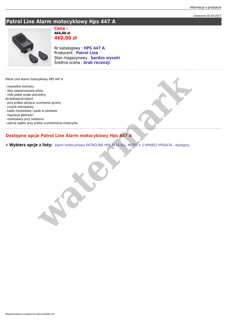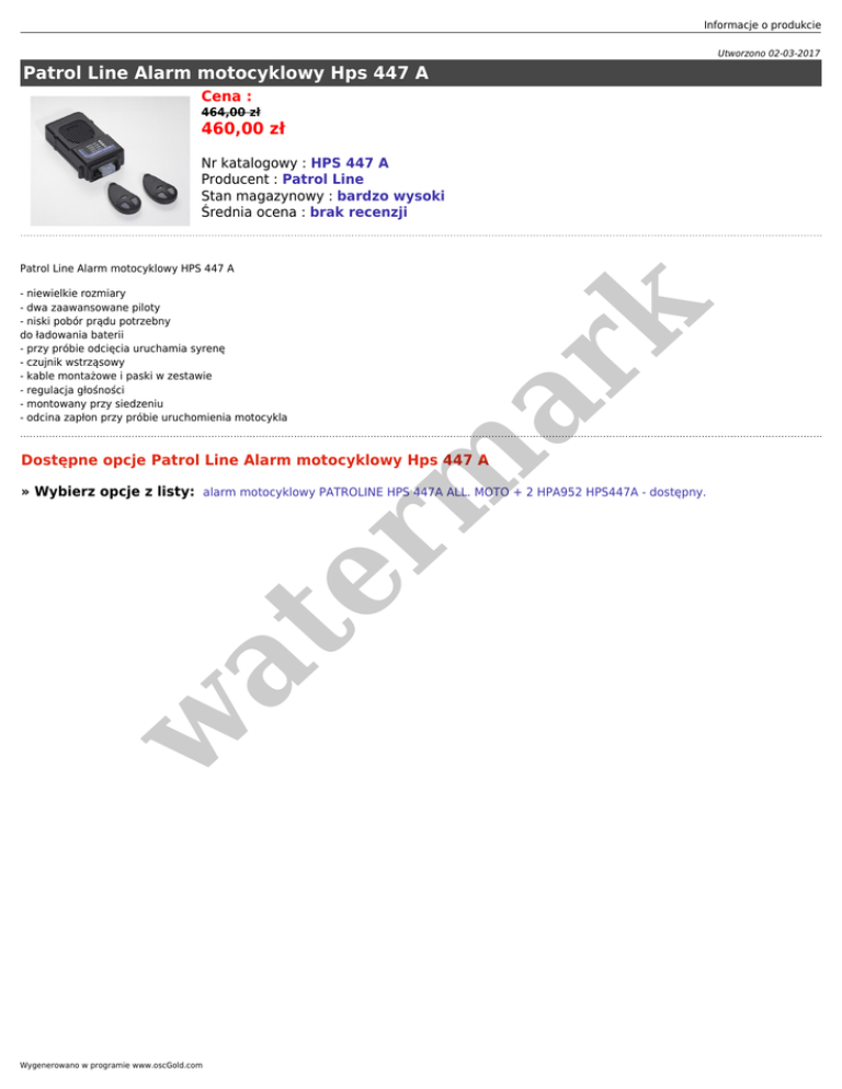 Informacje o produkcie Utworzono 02-03-2017 Patrol Line Alarm motocyklowy Hps 447 A Cena : 464,00 zł 460,00 zł Nr katalogowy : HPS 447 A Producent : Patrol Line Stan magazynowy : bardzo wysoki Średnia ocena : brak recenzji Patrol Line Alarm motocyklowy HPS 447 A er m ar k - niewielkie rozmiary - dwa zaawansowane piloty - niski pobór prądu potrzebny do ładowania baterii - przy próbie odcięcia uruchamia syrenę - czujnik wstrząsowy - kable montażowe i paski w zestawie - regulacja głośności - montowany przy siedzeniu - odcina zapłon przy próbie uruchomienia motocykla Dostępne opcje Patrol Line Alarm motocyklowy Hps 447 A w at » Wybierz opcje z listy: alarm motocyklowy PATROLINE HPS 447A ALL. MOTO + 2 HPA952 HPS447A - dostępny. Wygenerowano w programie www.oscGold.com