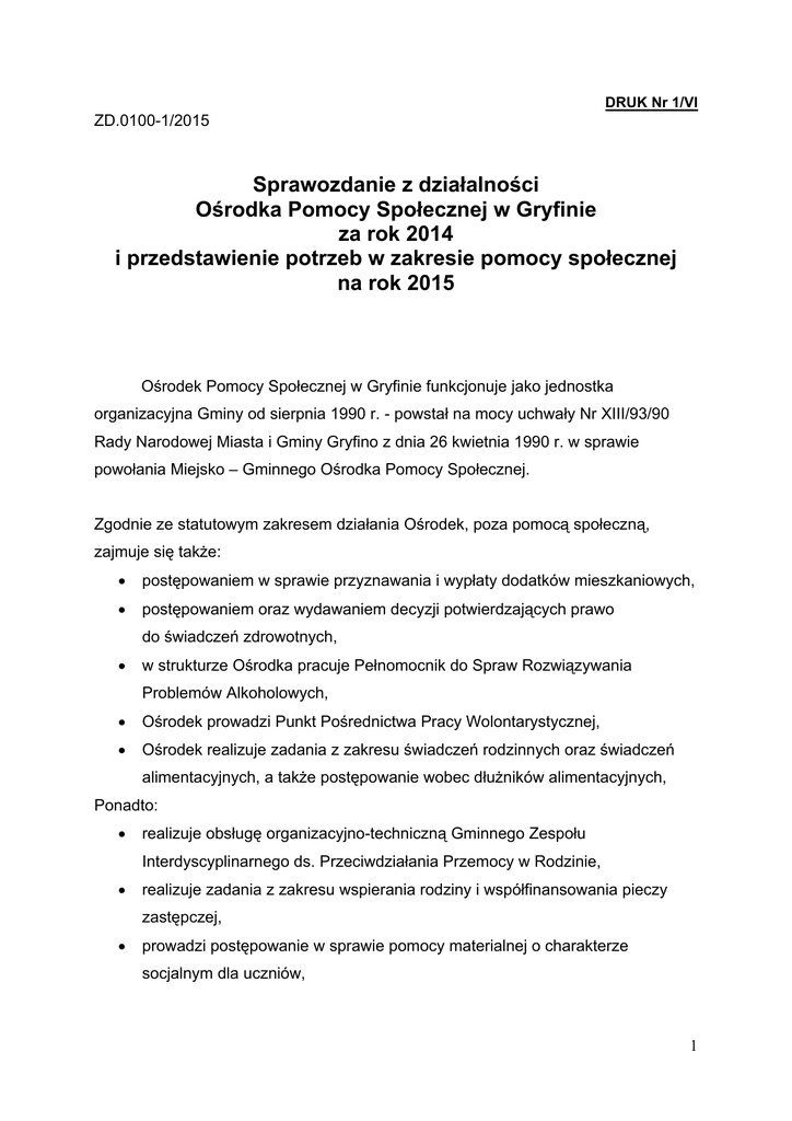 DRUK Nr 1/VI ZD.0100-1/2015 Sprawozdanie z działalności Ośrodka Pomocy Społecznej w Gryfinie za rok 2014 i przedstawienie potrzeb w zakresie pomocy społecznej na rok 2015 Ośrodek Pomocy Społecznej w Gryfinie funkcjonuje jako jednostka organizacyjna Gminy od sierpnia 1990 r. - powstał na mocy uchwały Nr XIII/93/90 Rady Narodowej Miasta i Gminy Gryfino z dnia 26 kwietnia 1990 r. w sprawie powołania Miejsko – Gminnego Ośrodka Pomocy Społecznej. Zgodnie ze statutowym zakresem działania Ośrodek, poza pomocą społeczną, zajmuje się także: • postępowaniem w sprawie przyznawania i wypłaty dodatków mieszkaniowych, • postępowaniem oraz wydawaniem decyzji potwierdzających prawo do świadczeń zdrowotnych, • w strukturze Ośrodka pracuje Pełnomocnik do Spraw Rozwiązywania Problemów Alkoholowych, • Ośrodek prowadzi Punkt Pośrednictwa Pracy Wolontarystycznej, • Ośrodek realizuje zadania z zakresu świadczeń rodzinnych oraz świadczeń alimentacyjnych, a także postępowanie wobec dłużników alimentacyjnych, Ponadto: • realizuje obsługę organizacyjno-techniczną Gminnego Zespołu Interdyscyplinarnego ds. Przeciwdziałania Przemocy w Rodzinie, • realizuje zadania z zakresu wspierania rodziny i współfinansowania pieczy zastępczej, • prowadzi postępowanie w sprawie pomocy materialnej o charakterze socjalnym dla uczniów, 1 • zajmuje się wydawaniem opinii dotyczących potwierdzenia sprawowania opieki faktycznej nad osobami uprawnionymi do renty socjalnej, w przypadku gdy nie mogą one odebrać renty samodzielnie. • przeprowadza wywiady środowiskowe w celu weryfikacji okoliczności dotyczących spełniania warunków wynikających z art. 16a i art.17 ustawy z dnia 28 listopada 2003 r. o świadczeniach rodzinnych tj. uprawnień do świadczenia pielęgnacyjnego i specjalnego zasiłku opiekuńczego. • Ośrodek prowadzi sprawy związane z przyznawaniem zryczałtowanego dodatku energetycznego dla odbiorców wrażliwych energii elektrycznej, o których mowa w art. 3 pkt 13c ustawy z dnia 10 kwietnia 1997 r. – Prawo energetyczne. Nowym zadaniem, które Ośrodek realizuje od 2014 r. są zadania związane z przyznaniem Karty Dużej Rodziny. Powyższe zadania realizowane są w oparciu o następujące przepisy: • ustawy z dnia 12 marca 2004 r. o pomocy społecznej (Dz. U. z 2015 r. poz. 163), • Uchwała Rady Ministrów nr 221 z dnia 10 grudnia 2013 r. w sprawie ustanowienia wieloletniego programu wspierania finansowego gmin w zakresie dożywiania „Pomoc państwa w zakresie dożywiania na lata 2014 – 2020 ( M.P. z 2013 r. poz. 1024). –Uchwała nr XLI/362/14 Rady Miejskiej w Gryfinie z dnia 28 stycznia 2014 r. w sprawie określenia zasad zwrotu wydatków na dożywianie w formie posiłków albo świadczenia rzeczowego…,Uchwała nr XLI363/14 Rady Miejskiej w Gryfinie z dnia 28 stycznia 2014 r. w sprawie podwyższenia kryterium dochodowego uprawniającego do przyznania nieodpłatnie pomocy w zakresie dożywiania w formie świadczenia pieniężnego na zakup posiłków albo żywności…, • ustawy z dnia 21 czerwca 2001 r. o dodatkach mieszkaniowych (Dz. U. z 2013 r., poz. 966 ze zm.), • ustawy z dnia 26 października 1982 r. o wychowaniu w trzeźwości i przeciwdziałaniu alkoholizmowi (Dz. U. z 2012 r. poz. 1356 ze zm.), 2 • ustawy z dnia 29 lipca 2005 r. o przeciwdziałaniu przemocy w rodzinie (Dz. U. z 2005 r. nr 180, poz. 1493 ze zm.), • ustawy z dnia 29 lipca 2005 r. o przeciwdziałaniu narkomanii (Dz. U. z 2012 r. poz. 124 ze zm.), • ustawy z dnia 27 sierpnia 2004 r. o świadczeniach opieki zdrowotnej finansowanych ze środków publicznych (Dz. U. z 2008 nr 164, poz. 1027 ze zm.), • ustawy z dnia 24 kwietnia 2003 r. o działalności pożytku publicznego i o wolontariacie (Dz. U. z 2014 r. poz.1118 ze zm.), • ustawy z 9 czerwca 2011 r. o wspieraniu rodziny i systemie pieczy zastępczej (Dz. U. z 2013 r. poz. 135 ze zm.), • ustawy z dnia 28 listopada 2003 r. o świadczeniach rodzinnych (Dz. U. z 2015 r., poz. 114), • ustawy z dnia 7 września 2007 r. o pomocy osobom uprawnionym do alimentów (Dz. U. 2012 r. poz.1228 ze zm.), • ustawy z 7 września 1991 r. o systemie oświaty (Dz. U. z 2004 r. nr 256, poz. 2572 ze zm.). • ustaw z dnia 5 grudnia 2014 r. o Karcie Dużej Rodziny (Dz. Z 2014 r. poz. 1863) poprzedzona przepisami wynikającymi z rządowego programu dla rodzin wielodzietnych wydanymi w oparciu o art. 24 ust. 2 ustawy o pomocy społecznej. Pomoc Społeczna Pomoc społeczna jest instytucją polityki społecznej państwa, której celem jest umożliwienie osobom i rodzinom przezwyciężenie trudnych sytuacji życiowych, których nie są one w stanie pokonać wykorzystując własne zasoby, uprawnienia i możliwości. Pomoc społeczna wspiera osoby i rodziny w wysiłkach zmierzających do zaspokojenia niezbędnych potrzeb i umożliwienia im życia w warunkach odpowiadających godności człowieka. Rodzaj, forma i rozmiar świadczeń powinny być odpowiednie do okoliczności uzasadniających udzielenie pomocy. Według stanu na dzień 31 grudnia 2014 r. na terenie Gminy Gryfino było zameldowanych ogółem 30 968 osób ( w tym 20 711 w mieście i 10 257 na wsi). 3 W 2014 r. pomocą społeczną zostały objęte łącznie 1 562 osoby ( w tym pomocą finansową 1.341 osób). Główne powody przyznawania pomocy w latach 2012- 2014 Główne powody 2012 2013 2014 przyznawania Liczba Liczba Liczba Liczba Liczba Liczba pomocy rodzin osób w rodzin osób w rodzin osób w rodzinie rodzinie rodzinie Bezrobocie 237 707 238 742 184 544 Niepełnosprawność 445 869 349 741 352 688 Szczegółowe informacje dotyczące powodów przyznawania pomocy w 2014 r. zawiera załącznik nr 1. Świadczenia pomocy społecznej Przyznanie świadczeń z pomocy społecznej następuje w formie decyzji administracyjnych, które zgodnie z przepisami mogą być wydane po przeprowadzeniu wywiadu środowiskowego w miejscu zamieszkania wnioskodawcy. W 2014 r. O
