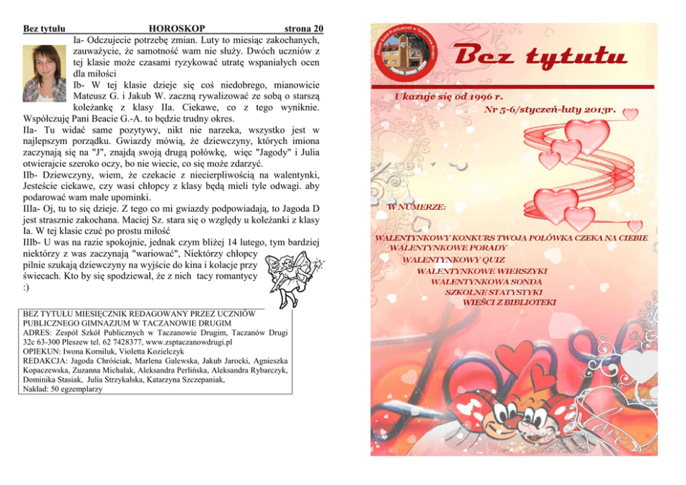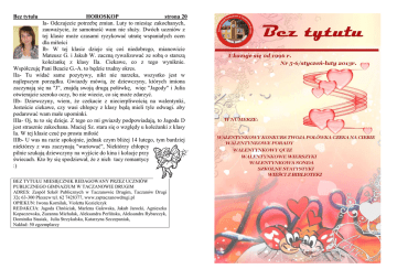 Bez tytułu HOROSKOP strona 20 Ia- Odczujecie potrzebę zmian. Luty to miesiąc zakochanych, zauważycie, że samotność wam nie służy. Dwóch uczniów z tej klasie może czasami ryzykować utratę wspaniałych ocen dla miłości Ib- W tej klasie dzieje się coś niedobrego, mianowicie Mateusz G. i Jakub W. zaczną rywalizować ze sobą o starszą koleżankę z klasy IIa. Ciekawe, co z tego wyniknie. Współczuję Pani Beacie G.-A. to będzie trudny okres. IIa- Tu widać same pozytywy, nikt nie narzeka, wszystko jest w najlepszym porządku. Gwiazdy mówią, że dziewczyny, których imiona zaczynają się na "J", znajdą swoją drugą połówkę, więc "Jagody" i Julia otwierajcie szeroko oczy, bo nie wiecie, co się może zdarzyć. IIb- Dziewczyny, wiem, że czekacie z niecierpliwością na walentynki, Jesteście ciekawe, czy wasi chłopcy z klasy będą mieli tyle odwagi. aby podarować wam małe upominki. IIIa- Oj, tu to się dzieje. Z tego co mi gwiazdy podpowiadają, to Jagoda D jest strasznie zakochana. Maciej Sz. stara się o względy u koleżanki z klasy Ia. W tej klasie czuć po prostu miłość IIIb- U was na razie spokojnie, jednak czym bliżej 14 lutego, tym bardziej niektórzy z was zaczynają "wariować", Niektórzy chłopcy pilnie szukają dziewczyny na wyjście do kina i kolacje przy świecach. Kto by się spodziewał, że z nich tacy romantycy :) BEZ TYTUŁU MIESIĘCZNIK REDAGOWANY PRZEZ UCZNIÓW PUBLICZNEGO GIMNAZJUM W TACZANOWIE DRUGIM ADRES: Zespół Szkół Publicznych w Taczanowie Drugim, Taczanów Drugi 32c 63-300 Pleszew tel. 62 7428377, www.zsptaczanowdrugi.pl OPIEKUN: Iwona Korniluk, Violetta Kozielczyk REDAKCJA: Jagoda Chróściak, Marlena Galewska, Jakub Jarocki, Agnieszka Kopaczewska, Zuzanna Michalak, Aleksandra Perlińska, Aleksandra Rybarczyk, Dominika Stasiak, Julia Strzykalska, Katarzyna Szczepaniak, Nakład: 50 egzemplarzy Bez tytułu WALENTYNKOWY KONKURS strona 2 KONKURS WALENTYNKOWY Drodzy Czytelnicy, zapewne zauważyliście, że dzisiejsze wydanie gazetki jest wyjątkowe. Na tytułowej stronie jest przylepione serduszko z numerem. Waszym zadaniem jest znaleźć swoją połówkę, czyli osobę, która ma gazetkę, a na niej serduszko z tym samym numerem. Pierwsza mieszana para, która zgłosi się do p. Iwony Korniluk otrzyma WALENTYNKOWĄ NIESPODZIANKĘ. Nie musisz nic robić, tylko znaleźć swoje przeznaczenie. Powodzenia w poszukiwaniach. Czekamy z niecierpliwością na Bez tytułu SAMORZĄD UCZNIOWSKI strona 19 Liczby nie kłamią! W naszym konkursie z ogromną przewagą prowadzi klasa IIa i jest coraz bliżej końcowego sukcesu. Mamy nadzieję, że uczniowie pozostałych klas wezmą przykład z kolegów i koleżanek i staną się bardziej aktywni. Nie zwlekajcie, czasu jest coraz mniej, a atrakcyjna nagroda czeka! A oto dokładne dane: • Estetyka izby lekcyjnej od 0-5 punktów • Zagospodarowanie ścian w klasie od 0-5 punktów • Świąteczny wystój klasy od 0-10 punktów • Udział w konkursach zorganizowanych przez SU od 0-5 za każdy • Przygotowanie uroczystości szkolnych od 0-20 punktów za każdy • Działania na rzecz szkoły i lokalnego środowiska od 0-20 punktów za każdą • Aktywny udział w imprezach szkolnych od 0-10 punktów za każdą • Udział w zawodach sportowych i konkursach 1 punkt za każdego uczestnika • Dewastacje mienia w klasie lub w szkole -10 punktów • Palenie papierosów -5 punktów • Inne negatywne zachowania -10 punktów A oto tabela z wynikami: ----- IV V VI Ia Ib II a II b III a III b Razem punktów 65 99 123 79 74 181 104 123 101 6 2-3 7 8 1 4 2-3 5 Miejsce WALENTYNKOWĄ PARĘ 9 Bez tytułu WALENTYNKOWA MODA RANDKOWA strona 18 Walentynki coraz bliżej, a ty jeszcze nie wiesz, w co się ubrać? Jeżeli chciałabyś założyć coś specjalnego, tylko z okazji Dnia Zakochanych, mamy dla ciebie propozycje. Na randkę z facetem w zaciszu domowym, seans w kinie lub romantyczny spacer po parku radzimy wybrać strój mniej oficjalny. Botki na średniej wysokości obcasie będą zdecydowanie lepszym pomysłem niż niebotycznie wysokie szpilki. Elegancką sukienkę możesz zastąpić na przykład czerwoną, modnie rozkloszowaną spódniczką. Doskonale sprawdzi się w zestawieniu z luźnym, białym sweterkiem. Wystarczy, że do Bez tytułu HISTORIA WALENTYNEK strona 3 Dzień św. Walentego w Polsce, i nie tylko, uznawane jest za święto miłości i zakochanych. Właśnie tego dnia staramy się jeszcze bardziej pokazać ukochanej osobie, jak wielkim uczuciem ją darzymy. Najczęściej są to jednak jednorazowe starania, które w przeciętne dni zdarzają się nielicznym. Skąd więc wziął się ten sztuczny zwyczaj okazywania miłości właśnie 14 lutego? Mówimy wszystko o walentynkach. stylizacji dobierzesz modne czerwone dodatki, a twoja randka z pewnością będzie zaliczona do udanych :) Skąd pochodzą walentynki? Walentynki rozpoczęły swoją egzystencję w zachodniej i południowej Europie już w średniowieczu. Zdecydowanie później zwyczaj ten zaczęła obchodzić wschodnia i północna część Starego Kontynentu. Pierwotnie był to dzień, w którym szczególnie dużo pisało się listów miłosnych. Następnie zaczęto ten dzień traktować jako święto zakochanych, dodając sobie kolejny pretekst, by obdarowywać się prezentami. Można powiedzieć, że na szerszą skalę praktykę taką zaczęły Stany Zjednoczone i Wielka Brytania. To przeszywające spojrzenie, ten szyk, ta nonszalancja! W zestawie stworzonym w oparciu o styl Chace’a Crawforda, gwiazdy jednego z najmodniejszych seriali ostatnich lat „Plotkary”, nie mogło zabraknąć ani jeansów, ani koszuli, ani stylowej marynarki. Doskonałym dopełnieniem tej stylizacji są elegancki zegarek, czarny, wąski krawat i skórzane pantofle. Styl Paula Wesley to niewymuszona elegancja w najlepszym wydaniu. Nonszalancko rozpięta pod szyją koszula zestawiona z szarymi jeansami, ponadczasowym, czarnym trenczem oraz wygodnym o